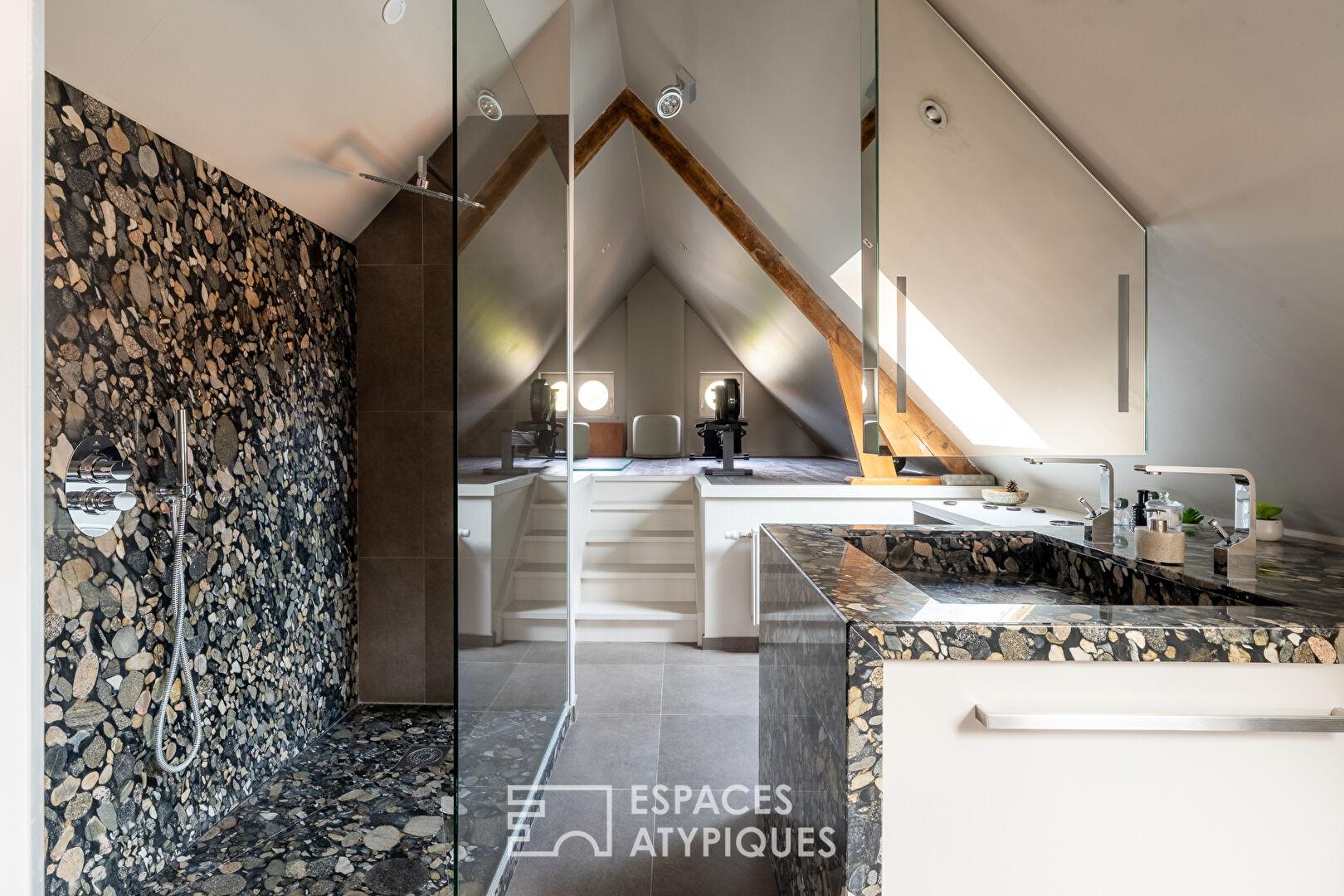 L’étage, accessible par un grand palier ouvert sur le séjour en contrebas, accentue les perspectives et laisse pénétrer la lumière de l’étage jusqu’au salon. Dans la continuité, une suite parentale en ‘L’ exceptionnelle sous une charpente apparente magistrale. Cet espace privé d’une fluidité parfaite intègre un salon, un dressing, une salle de sport et une salle d’eau spectaculaire disposant d’une douche à l’italienne et d’un plan vasque au cachet unique. La qualité de la rénovation est sans concession et les matériaux rares.
