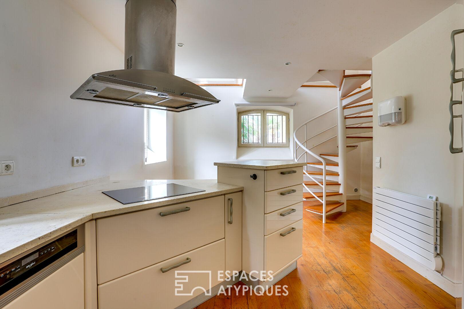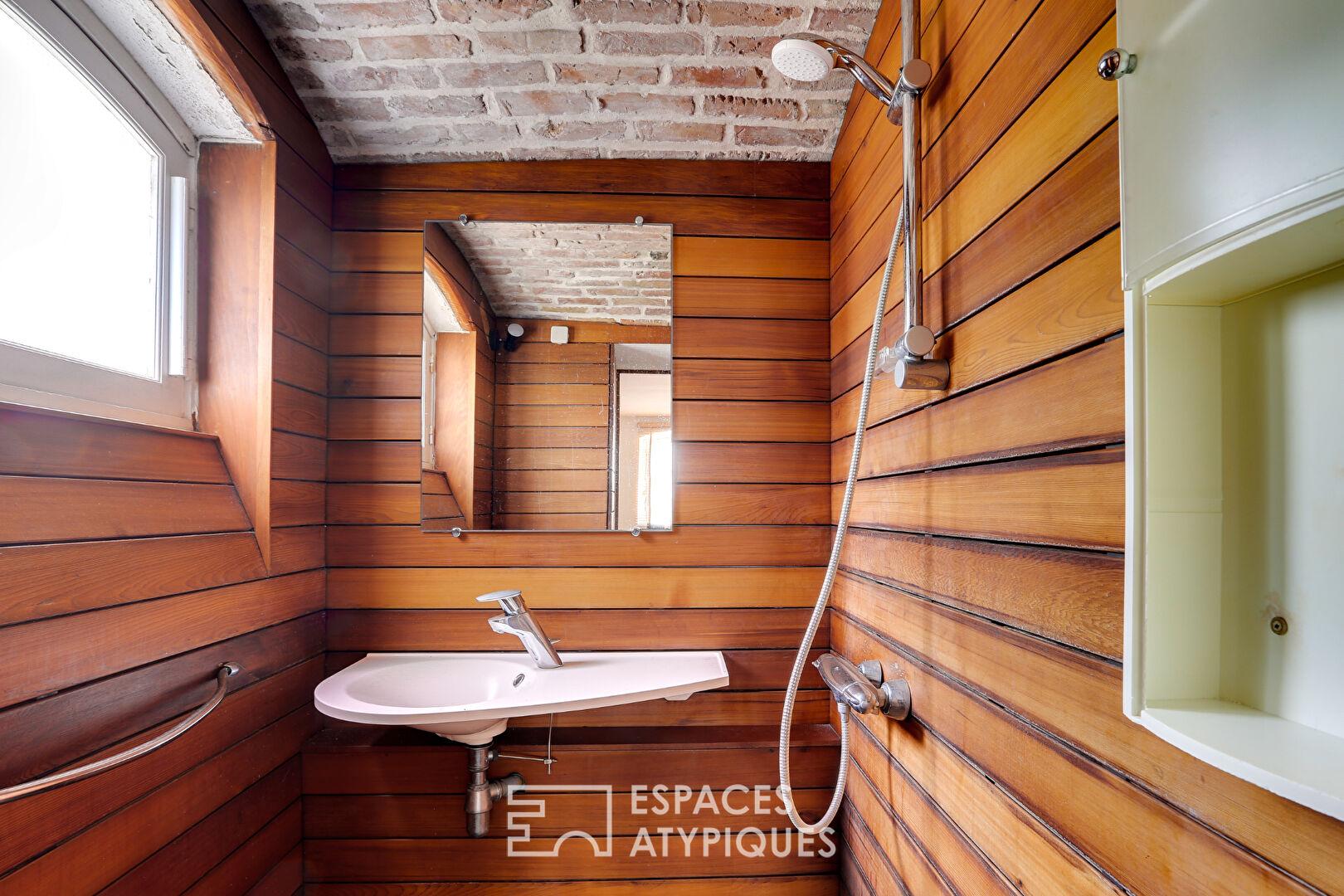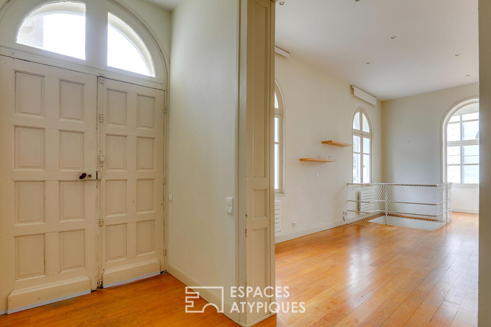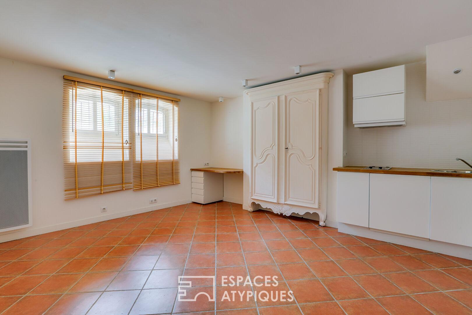 La pièce de vie principale, sublimée par des ouvertures en plein cintre et un parquet d’époque, offre une ambiance feutrée et raffinée. L’agencement actuel propose une vaste chambre avec rangements et une salle d’eau confortable. Le studio attenant, véritable atout de cette propriété, permet de multiples configurations : espace invité, bureau pour le télétravail ou rendement locatif de prestige.