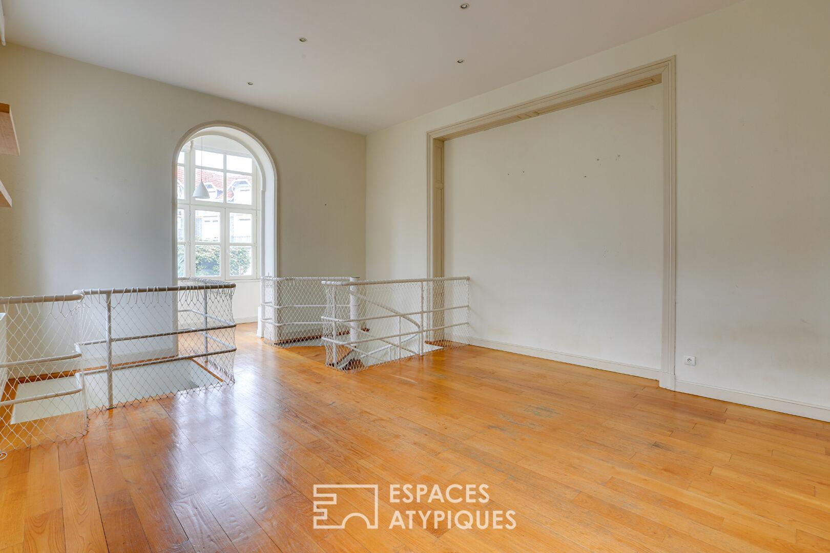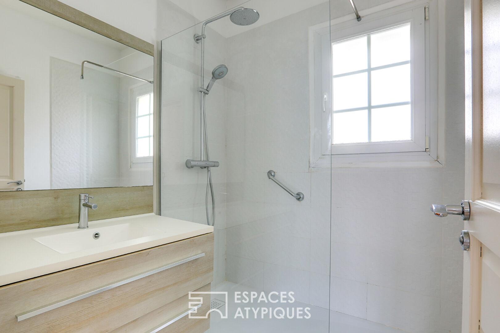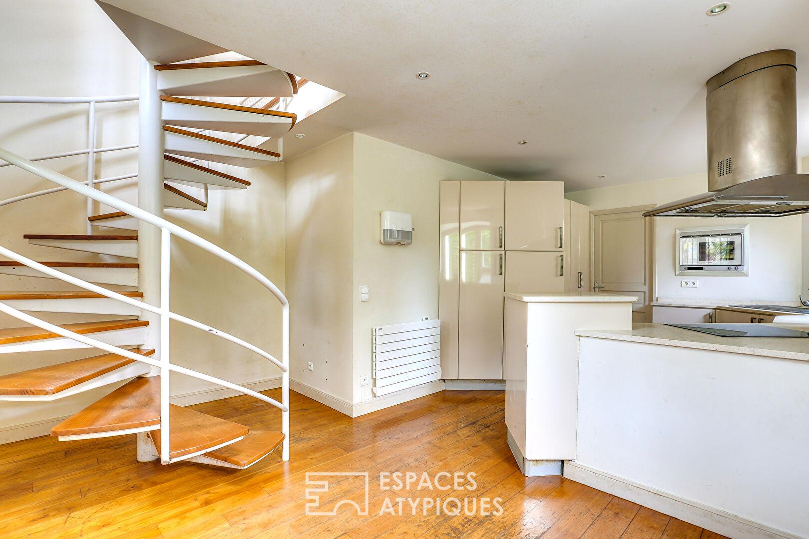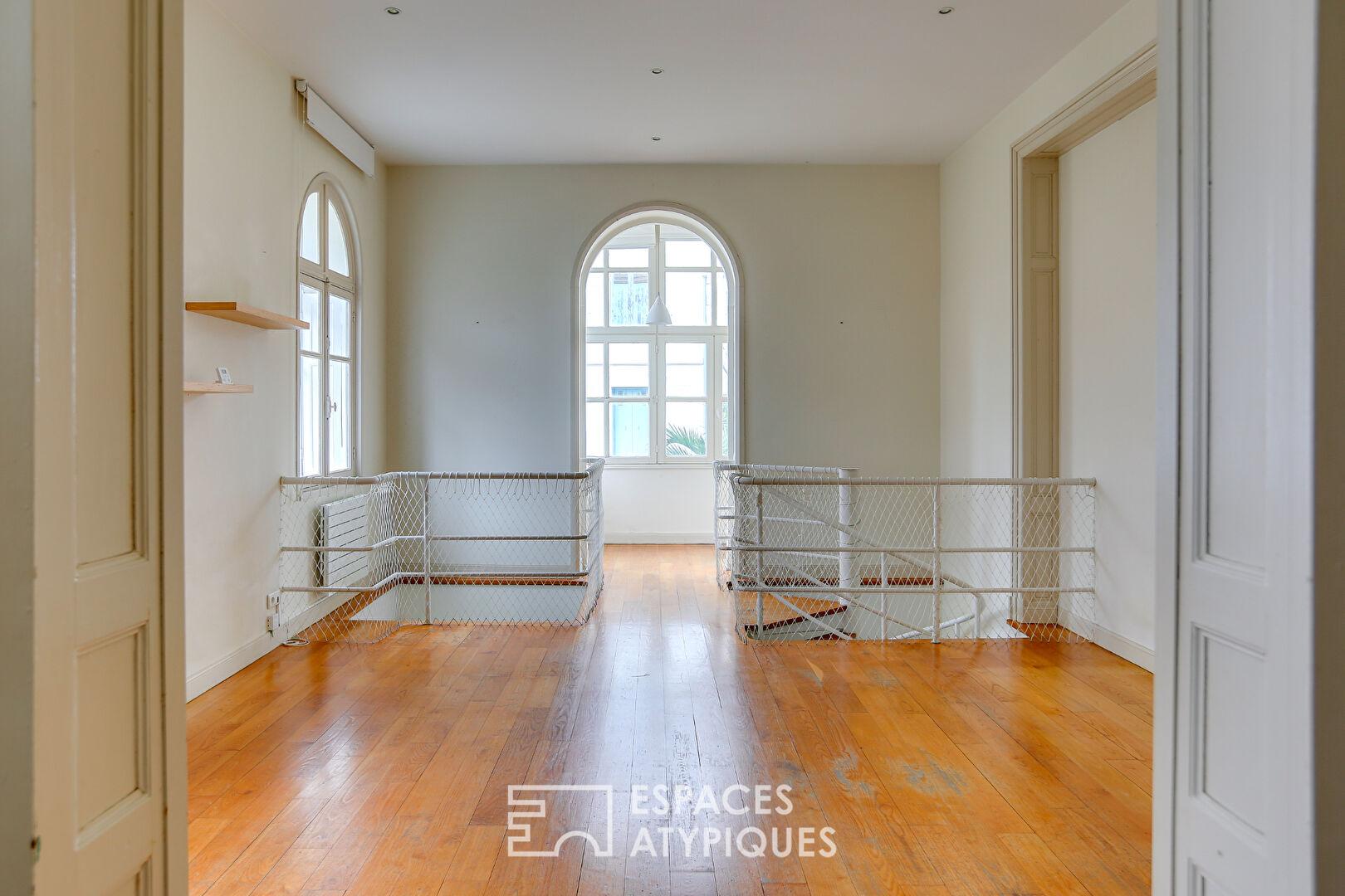 La pièce de vie principale, sublimée par des ouvertures en plein cintre et un parquet d’époque, offre une ambiance feutrée et raffinée. L’agencement actuel propose une vaste chambre avec rangements et une salle d’eau confortable. Le studio attenant, véritable atout de cette propriété, permet de multiples configurations : espace invité, bureau pour le télétravail ou rendement locatif de prestige.