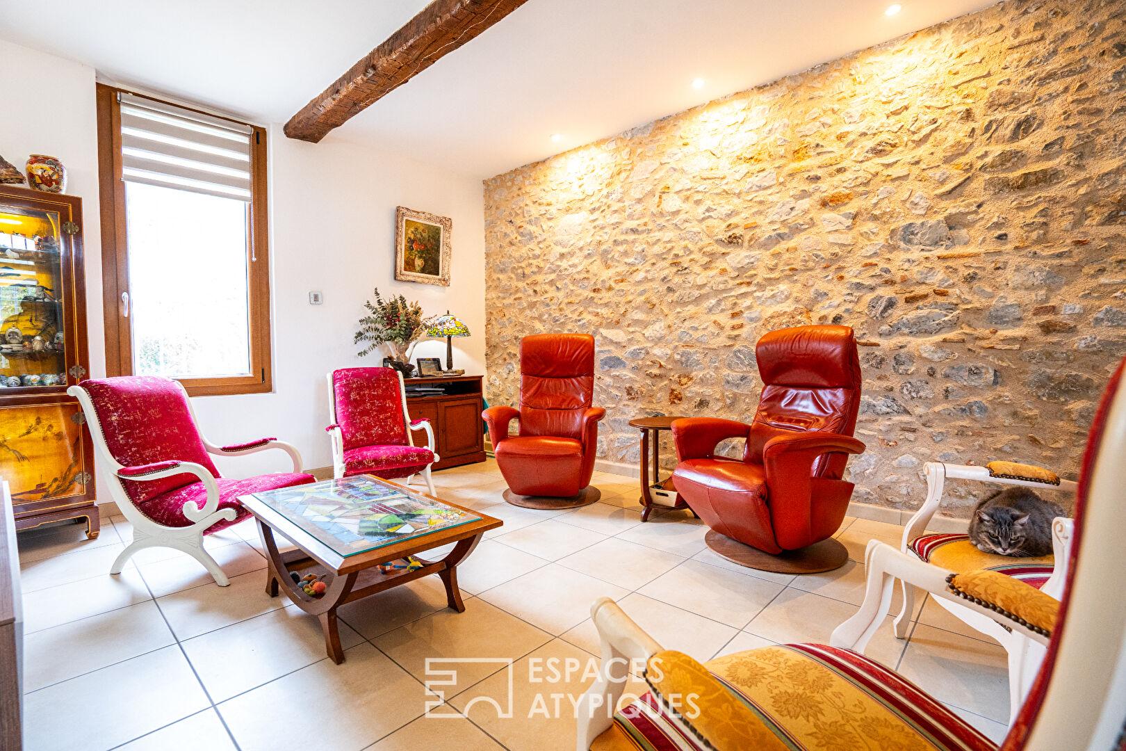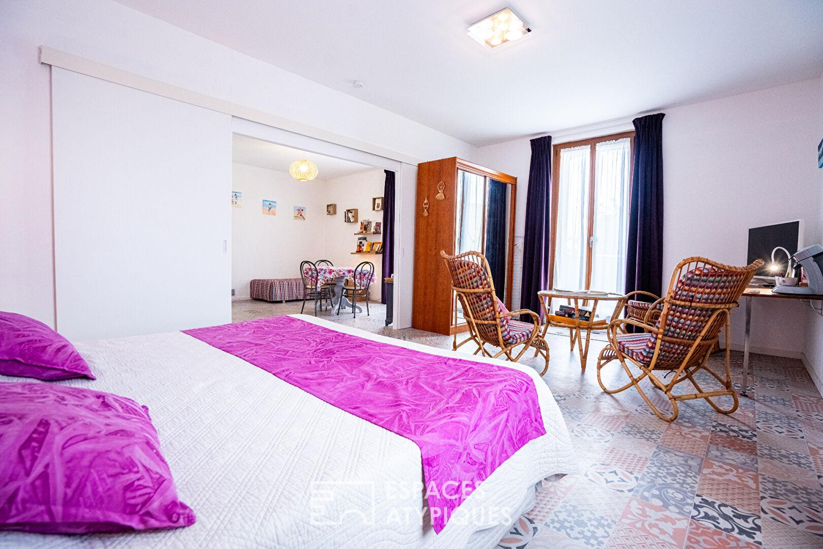L’habitation principale de 180 m² dévoile des volumes généreux. Le rez-de-chaussée accueille une vaste cuisine avec son cellier, deux salons lumineux et une première suite avec salle d’eau. À l’étage, le palier dessert un bureau et deux grandes chambres, dont une pièce magistrale et divisible s’ouvrant sur une terrasse surplombant la canopée. Trois appartements indépendants — un T3 prolongé par une terrasse et deux T2 nichés dans une bâtisse annexe — ainsi qu’une chambre d’hôte supplémentaire, complètent cet ensemble immobilier atypique. Ces espaces offrent une flexibilité rare pour un projet de vie pluriel ou un investissement locatif pérenne.