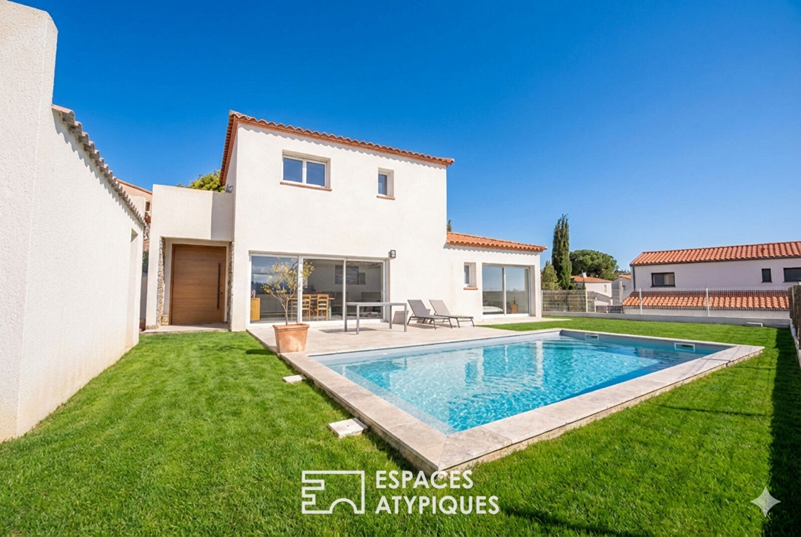 C’est au coeur d’un village à moins 20 minutes de Perpignan, nichée au fond d’une impasse garantissant une quiétude absolue, que prend place cette réalisation contemporaine livrée en 2024.