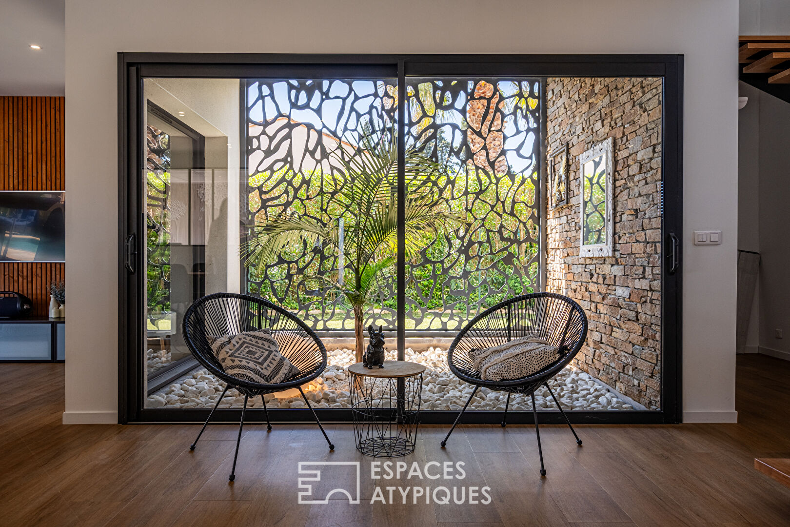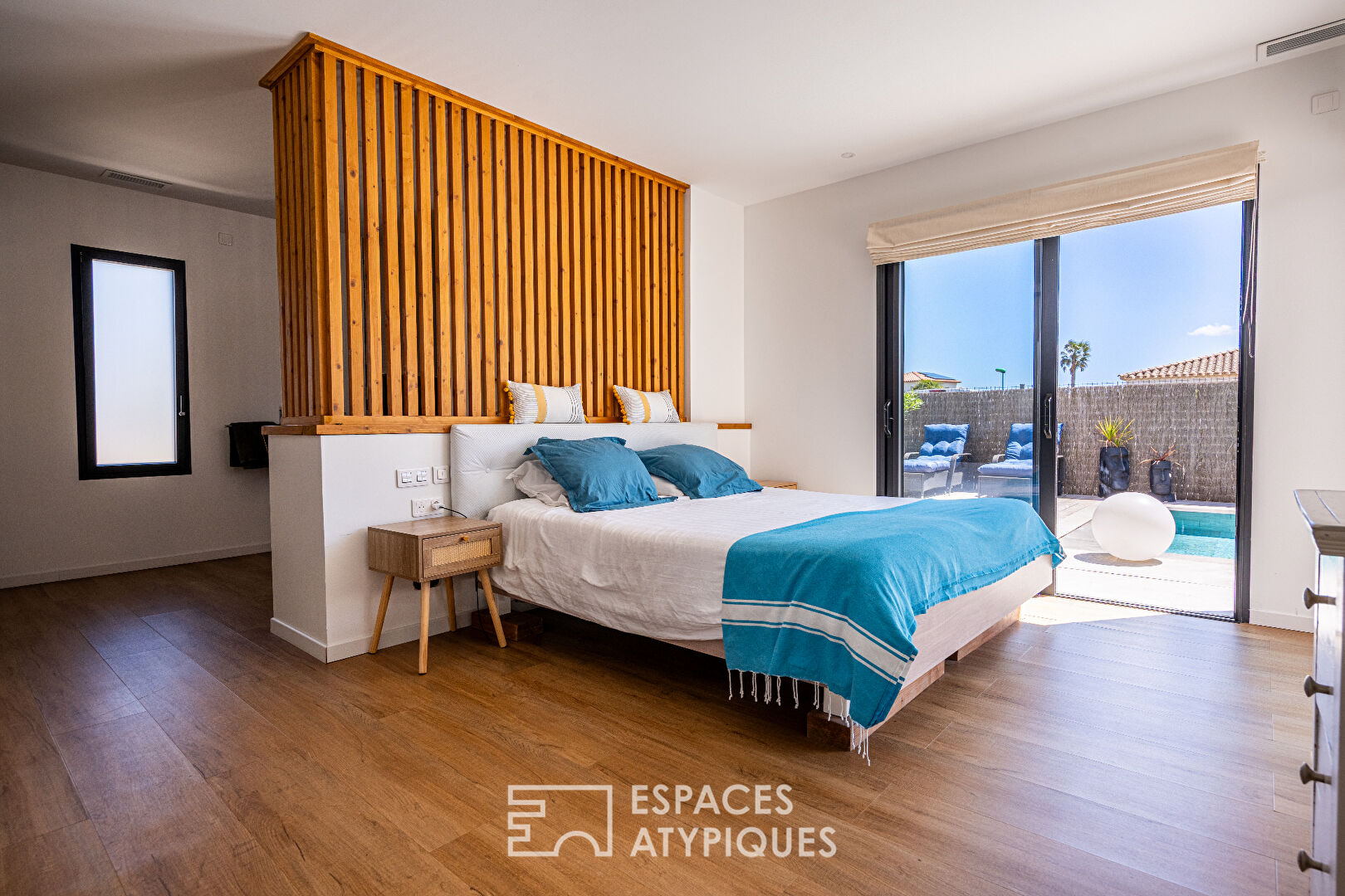 Les extérieurs sont pensés comme le prolongement naturel des espaces de vie. Une grande terrasse en bois entoure la piscine miroir, élément central de ce jardin, idéal pour se détendre sous le soleil méditerranéen ou recevoir en toute convivialité.