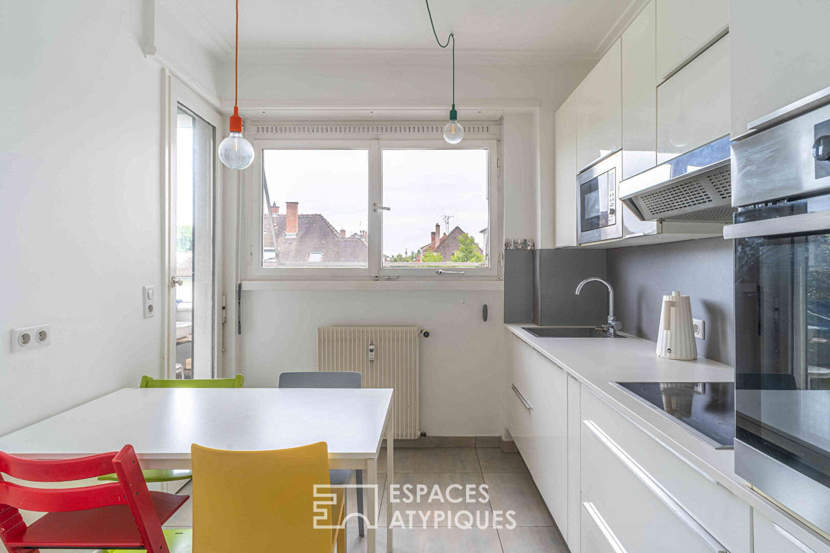 Situé sur la prestigieuse allée de la Robertsau, à proximité immédiate des Institutions Européennes, cet appartement de 94 m² prend place au 2e étage avec ascenseur d’un bâtiment datant des années 60. Il a bénéficié en 2014 d’une rénovation de qualité venue lui offrir un art de vie dans l’air du temps. Sa situation à seulement quelques mètres du poumon verdoyant de l’Orangerie en font bien rare.