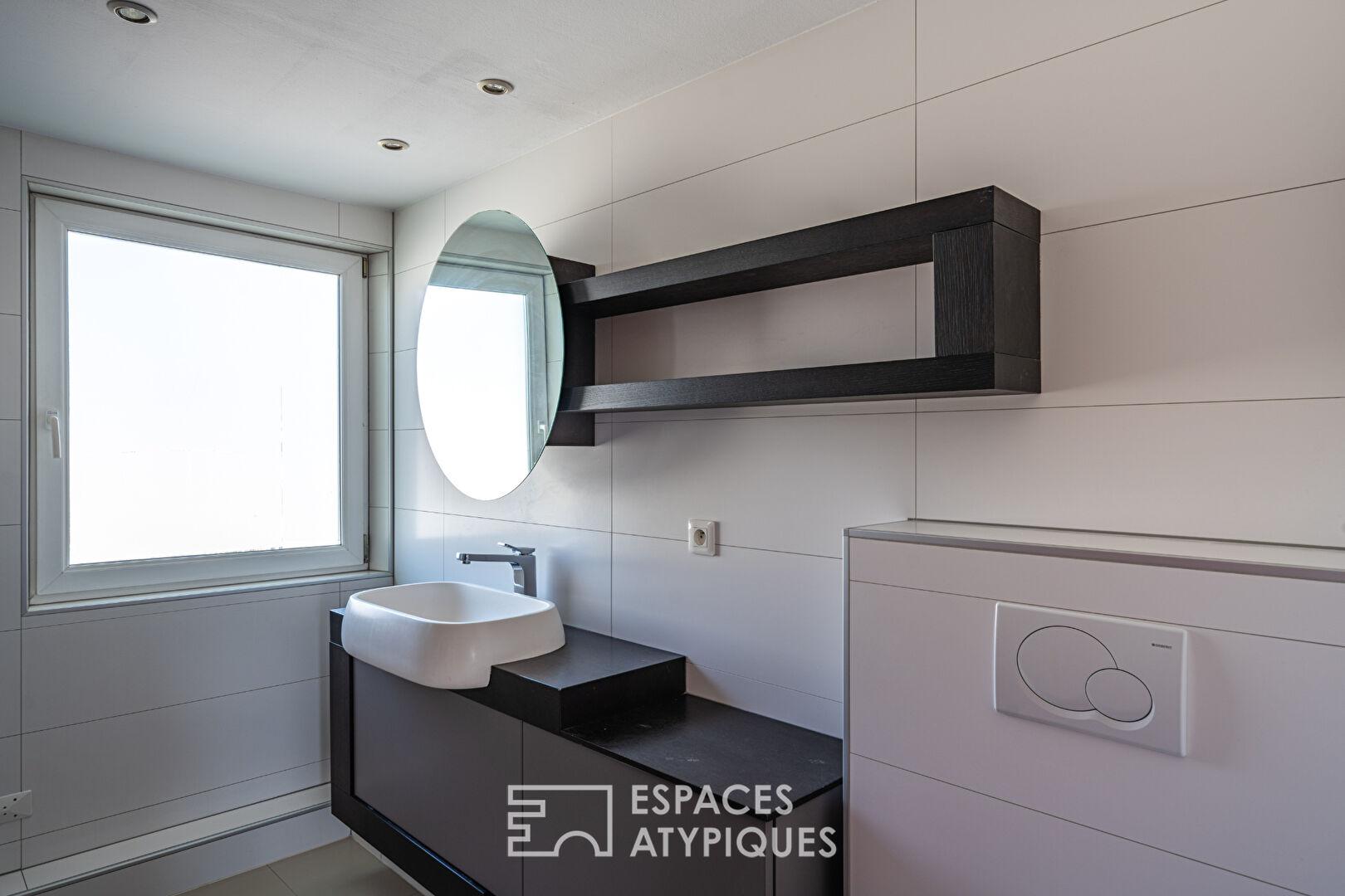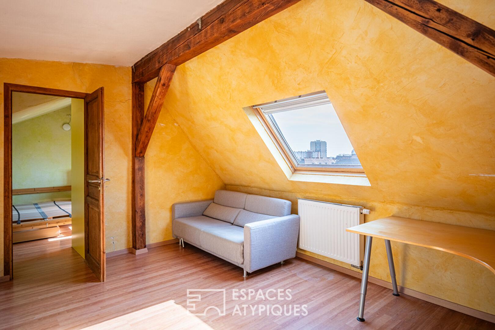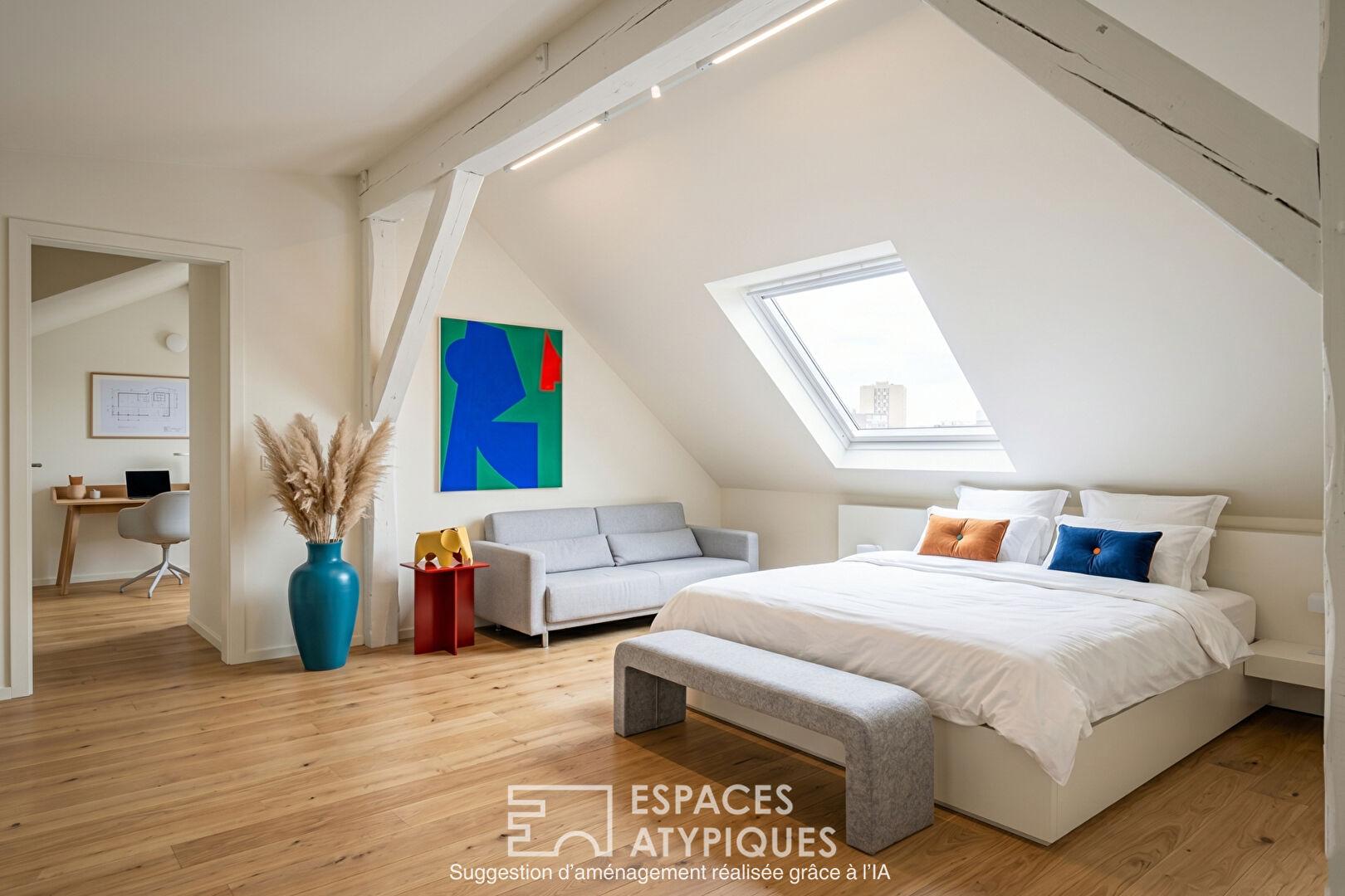 L’entrée, dotée de nombreux rangements sur mesure, mène à une vaste pièce de vie traversante. La double orientation assure une luminosité constante tout au long de la journée, mettant en valeur les lignes épurées de la cuisine ouverte entièrement équipée. Une chambre confortable avec placards ainsi qu’une salle d’eau complètent ce niveau principal. Un escalier conduit à l’étage supérieur qui s’ouvre sur un large palier distribuant deux chambres supplémentaires et une salle de bain. Cet espace sous les toits, bien que nécessitant une remise au goût du jour, offre une toile vierge idéale pour exprimer une vision architecturale personnelle et optimiser le charme des mansardes.