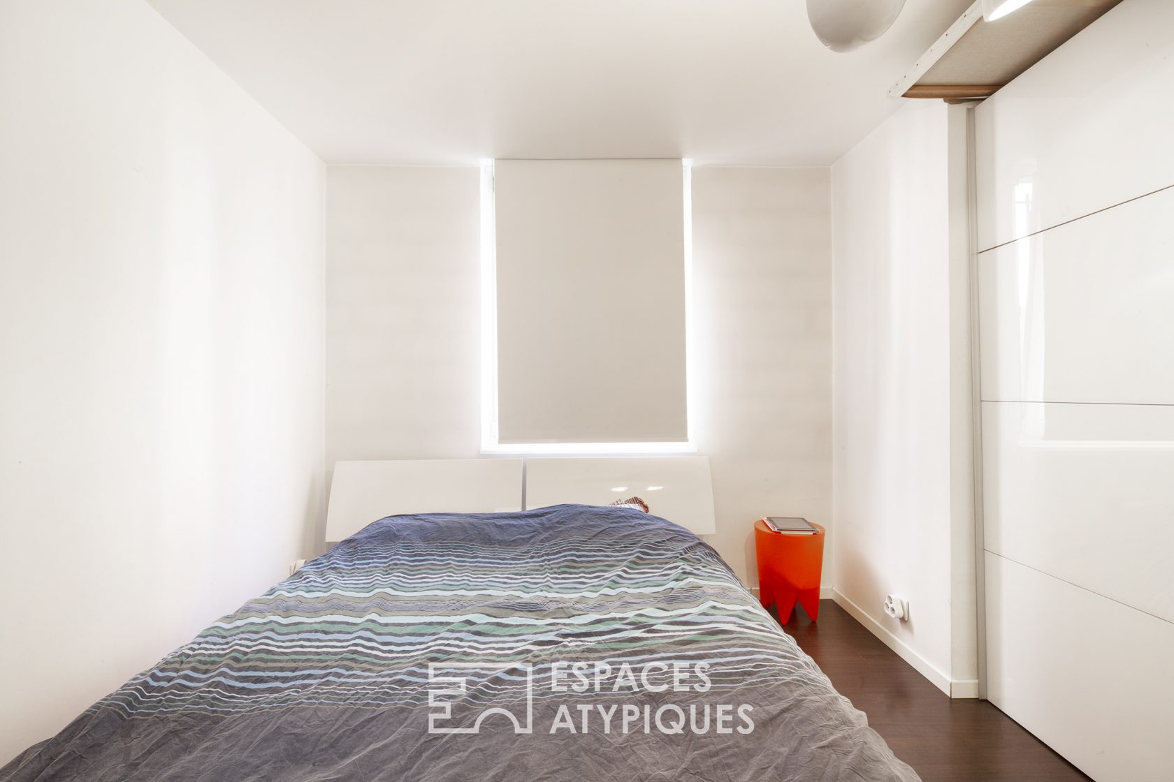L’espace de vie est doté de baies vitrées s’étendant sur toute la longueur de la pièce composée d’un séjour et d’une cuisine ouverte entièrement équipée. Il se prolonge par un espace bureau cozy agrémenté de rangements sur mesure. Jouxtant le séjour, une chambre d’enfant se dessine derrière une verrière atelier.