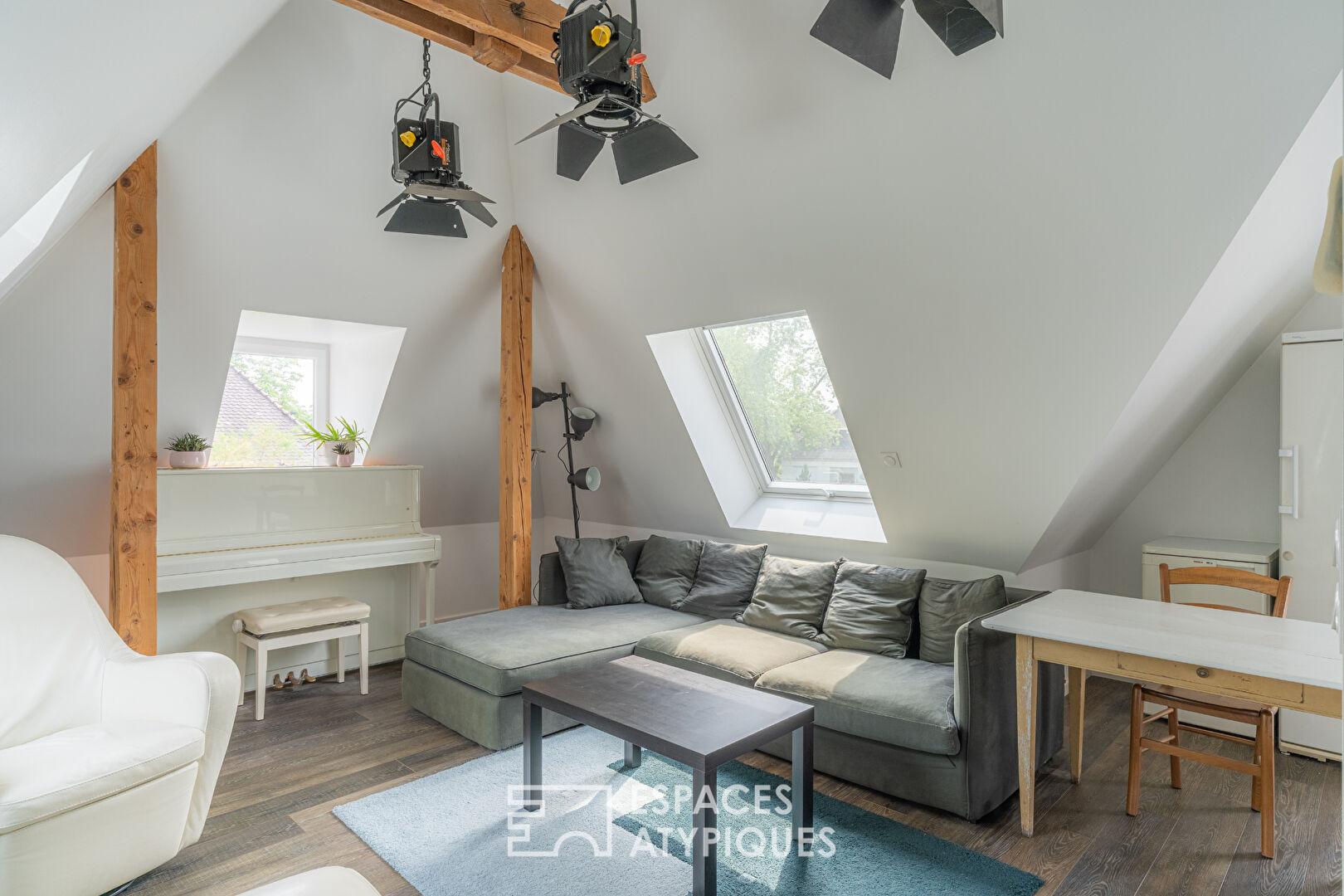 A l’étage, un studio indépendant, accessible par sa propre entrée, dispose d’un coin nuit, d’une salle d’eau et d’une pièce de vie avec salon et cuisine, prolongée par une terrasse ensoleillée. Une chambre supplémentaire, communicante ou non avec le studio, offre une flexibilité appréciable. Un second studio, également totalement indépendant, est idéalement conçu pour la location saisonnière, avec sa propre salle d’eau, une vaste pièce intégrant espace nuit et coin cuisine. Ces aménagements confèrent à la propriété une polyvalence rare, parfaite pour accueillir une famille nombreuse ou générer des revenus locatifs.