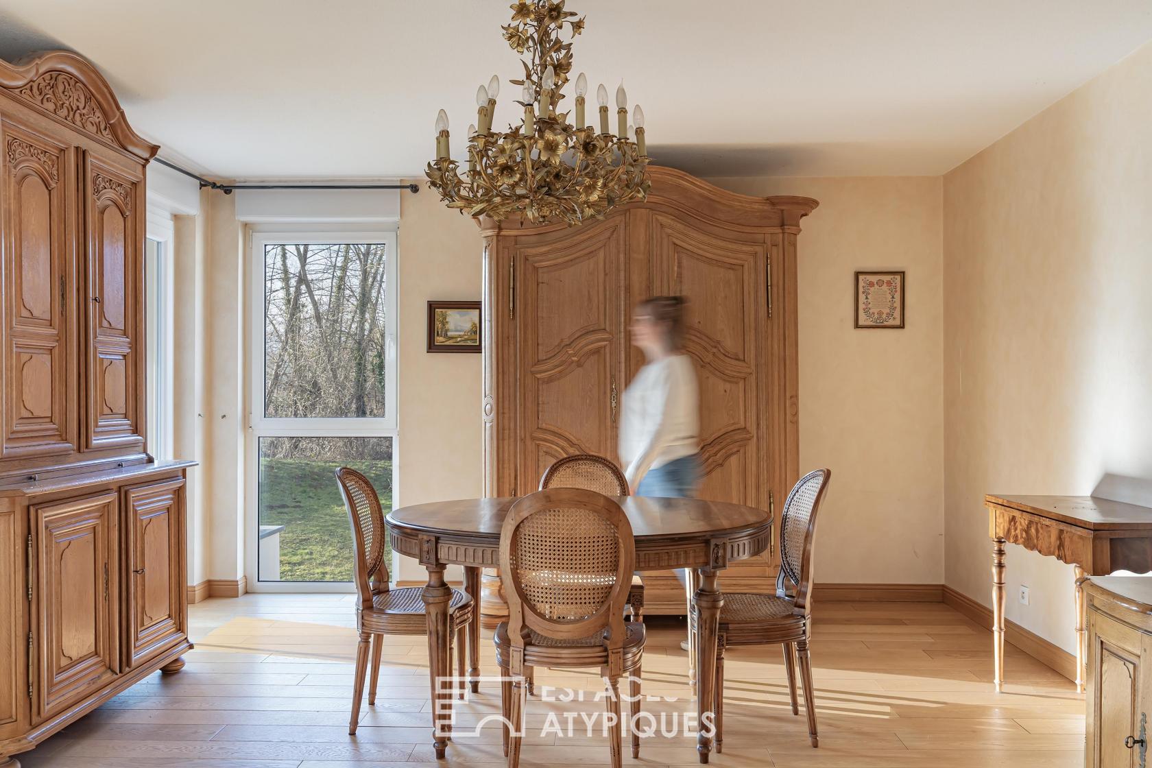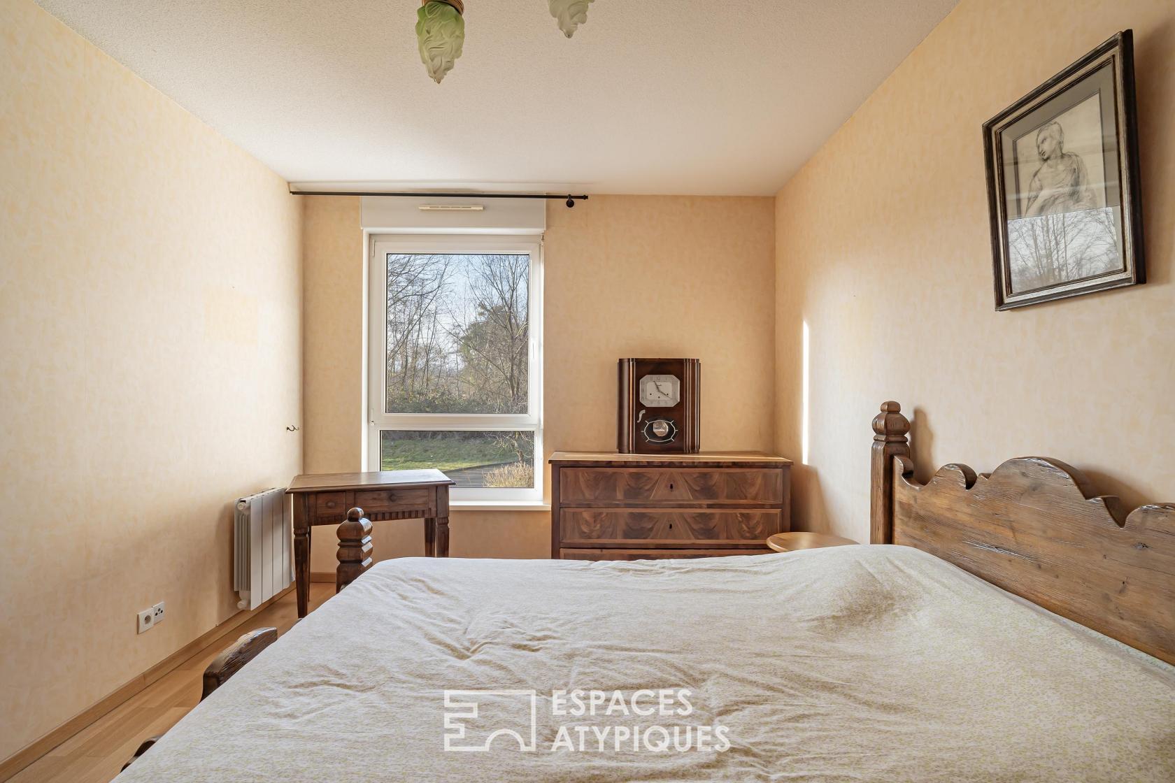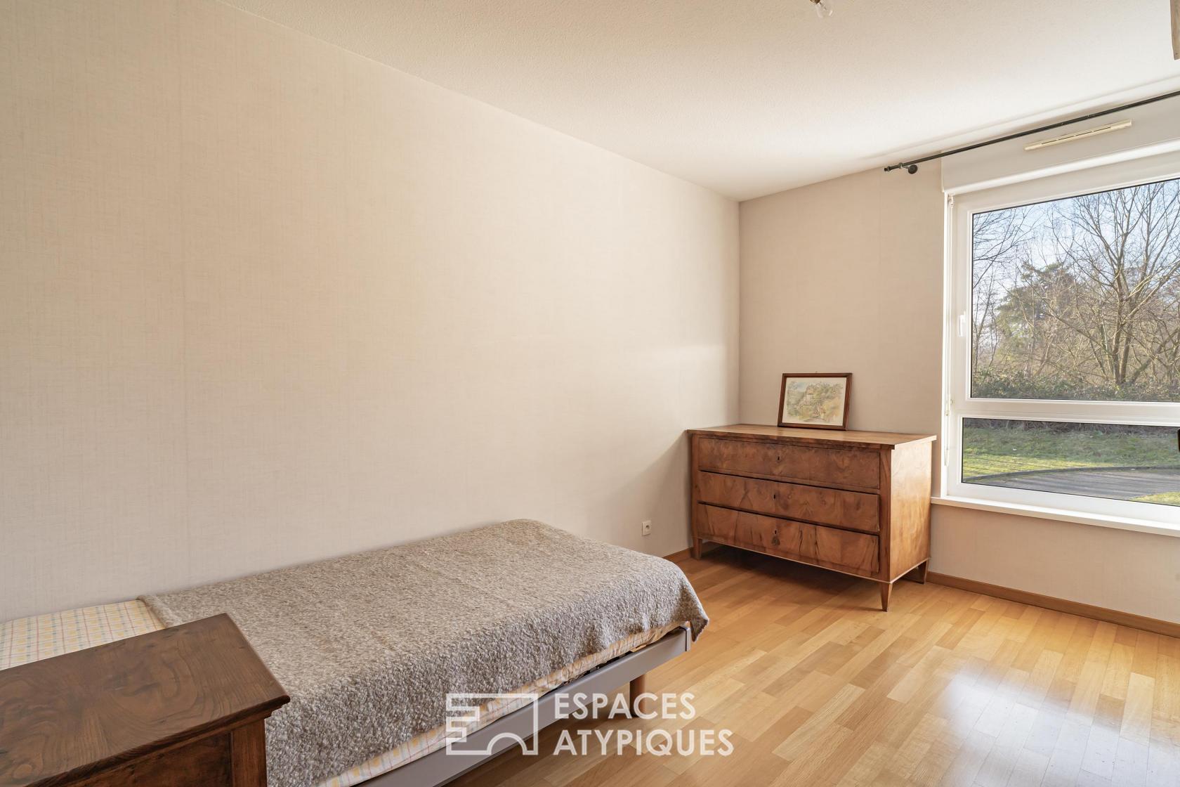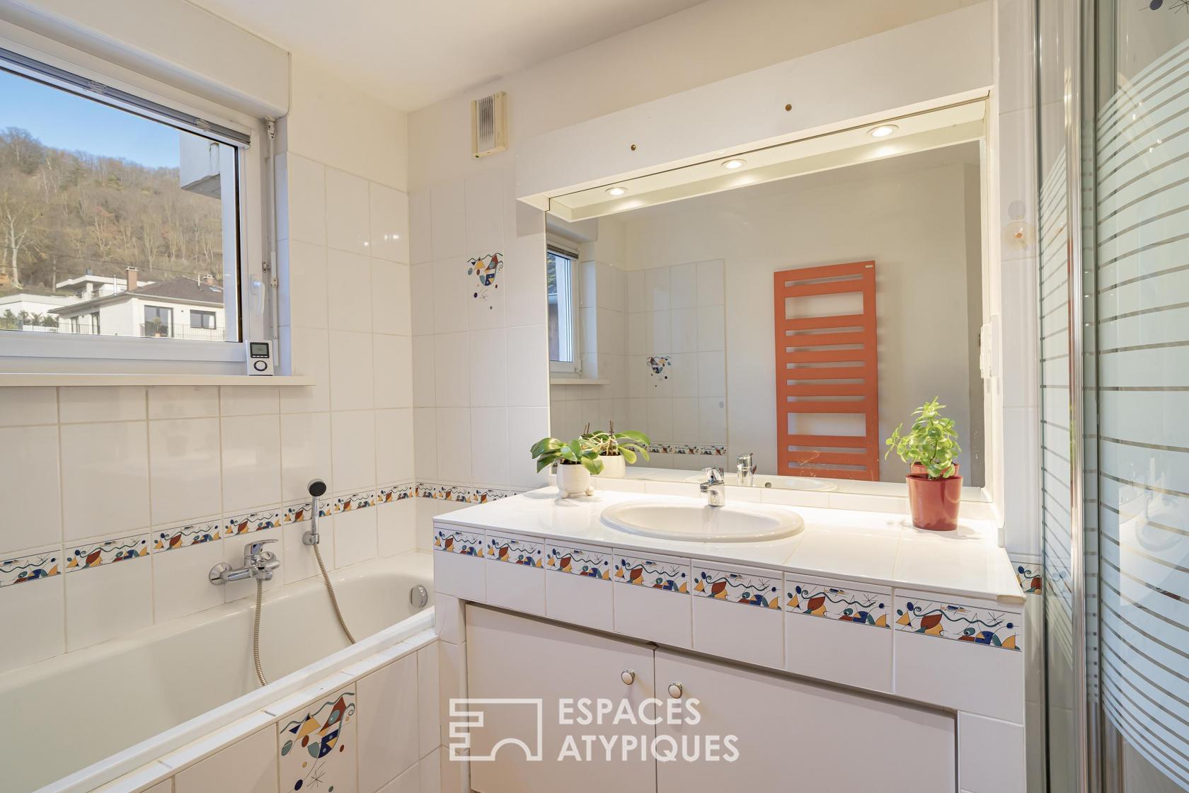 Le séjour se prolonge vers une belle terrasse qui surplombe un tableau naturel mouvant où un cours d’eau serpente paisiblement à travers la végétation. Cette atmosphère sereine contraste avec la proximité stratégique des commodités urbaines. La mobilité douce est ici privilégiée : le centre historique d’Obernai et les commerces du rempart se rejoignent en quatre minutes à vélo, tout comme les établissements scolaires. Pour les escapades plus lointaines, la gare est accessible en sept minutes de pédalage, tandis qu’un arrêt de bus à une minute à pied facilite les déplacements quotidiens. L’Espace Aquatique et les sentiers de randonnée voisins offrent autant de promesses de détente immédiate. Une cave et un garage double en enfilade apportent une dimension pratique indispensable à ce mode de vie entre ville et nature.