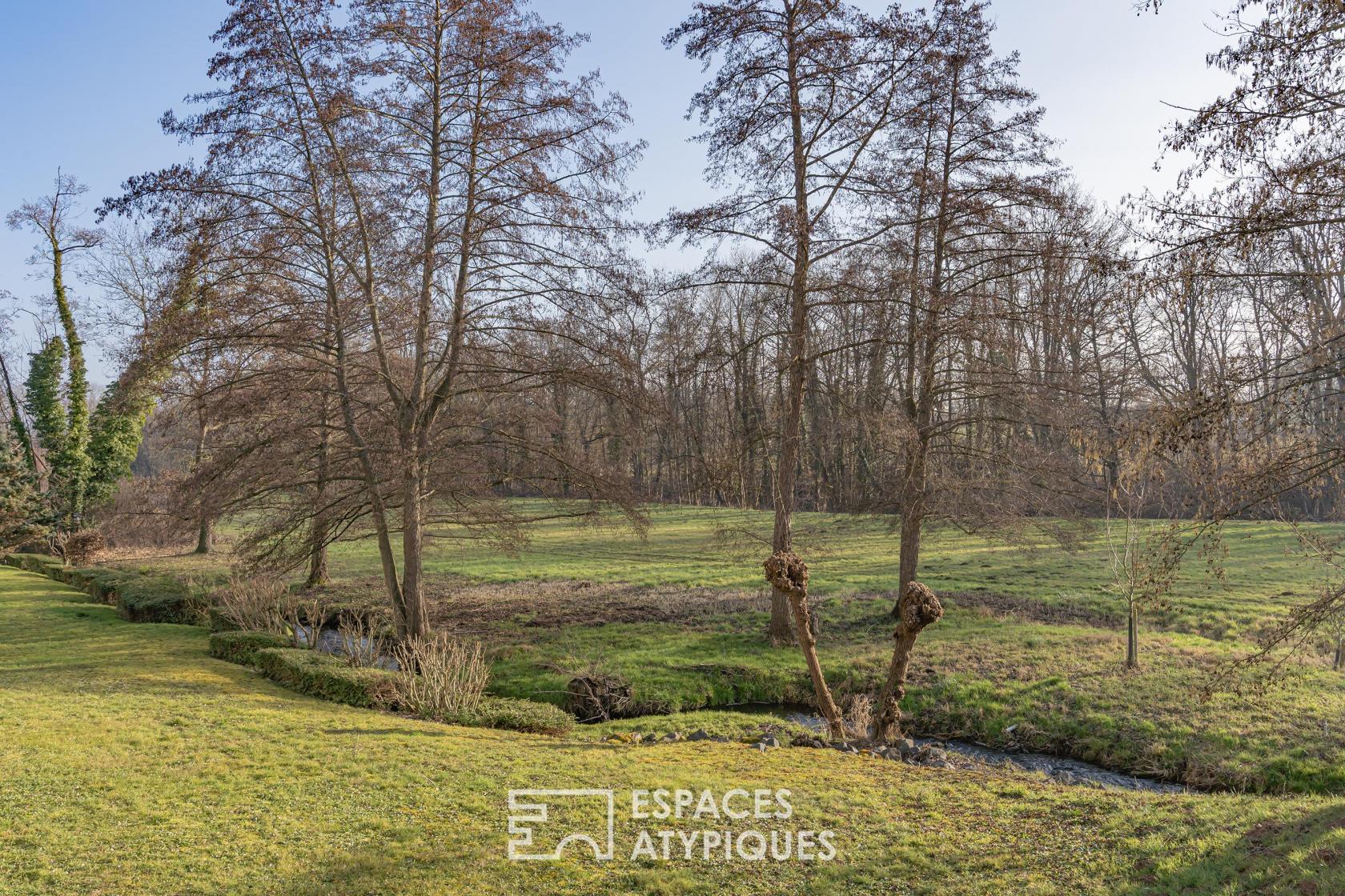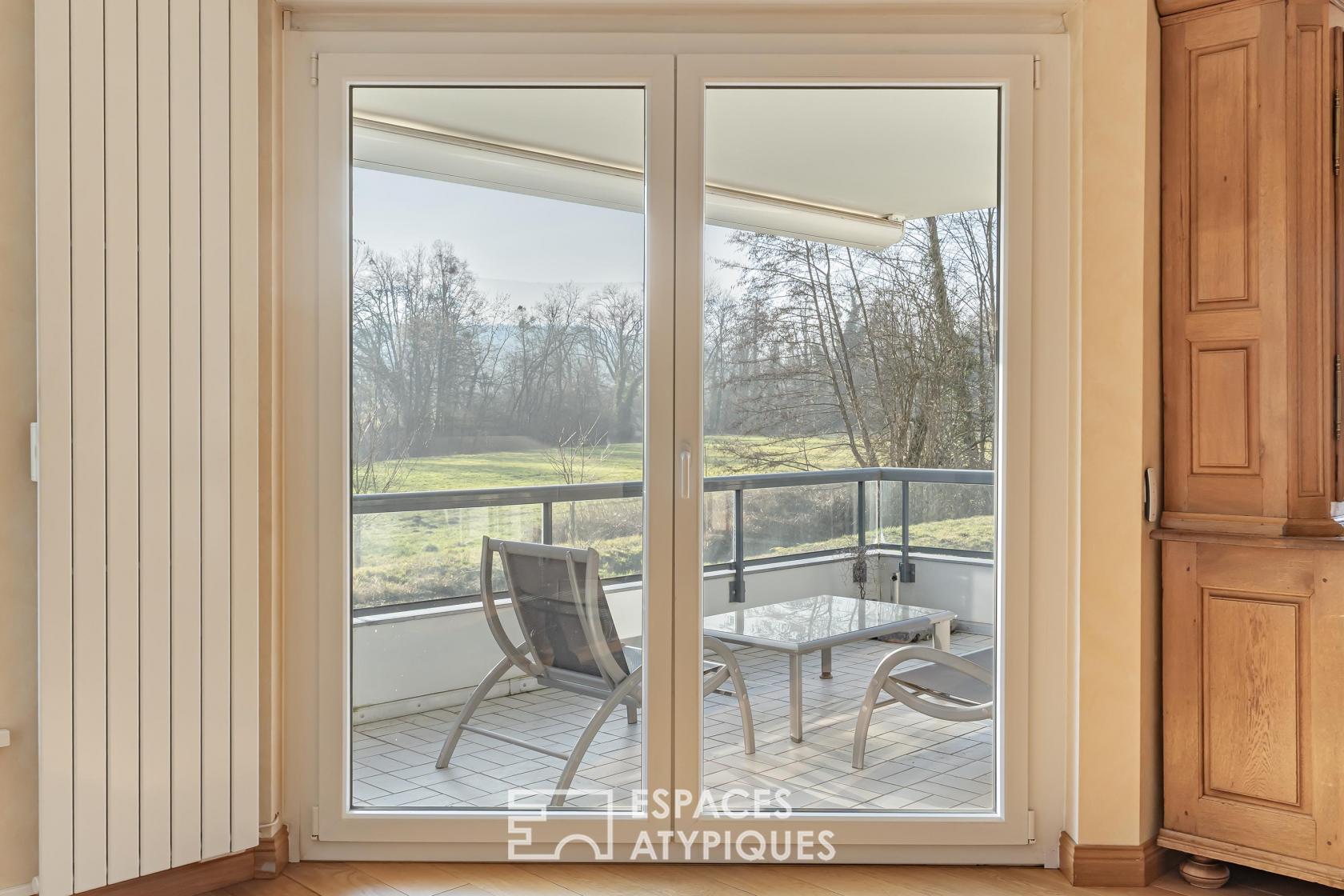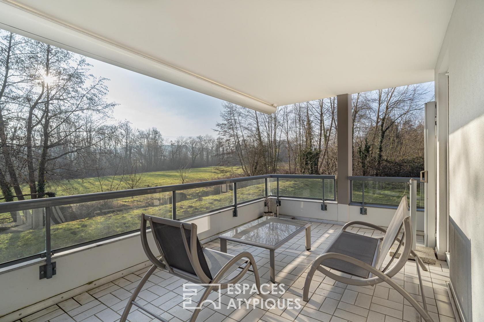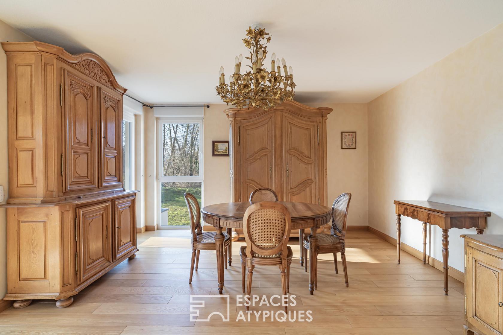Le séjour se prolonge vers une belle terrasse qui surplombe un tableau naturel mouvant où un cours d’eau serpente paisiblement à travers la végétation. Cette atmosphère sereine contraste avec la proximité stratégique des commodités urbaines. La mobilité douce est ici privilégiée : le centre historique d’Obernai et les commerces du rempart se rejoignent en quatre minutes à vélo, tout comme les établissements scolaires. Pour les escapades plus lointaines, la gare est accessible en sept minutes de pédalage, tandis qu’un arrêt de bus à une minute à pied facilite les déplacements quotidiens. L’Espace Aquatique et les sentiers de randonnée voisins offrent autant de promesses de détente immédiate. Une cave et un garage double en enfilade apportent une dimension pratique indispensable à ce mode de vie entre ville et nature.