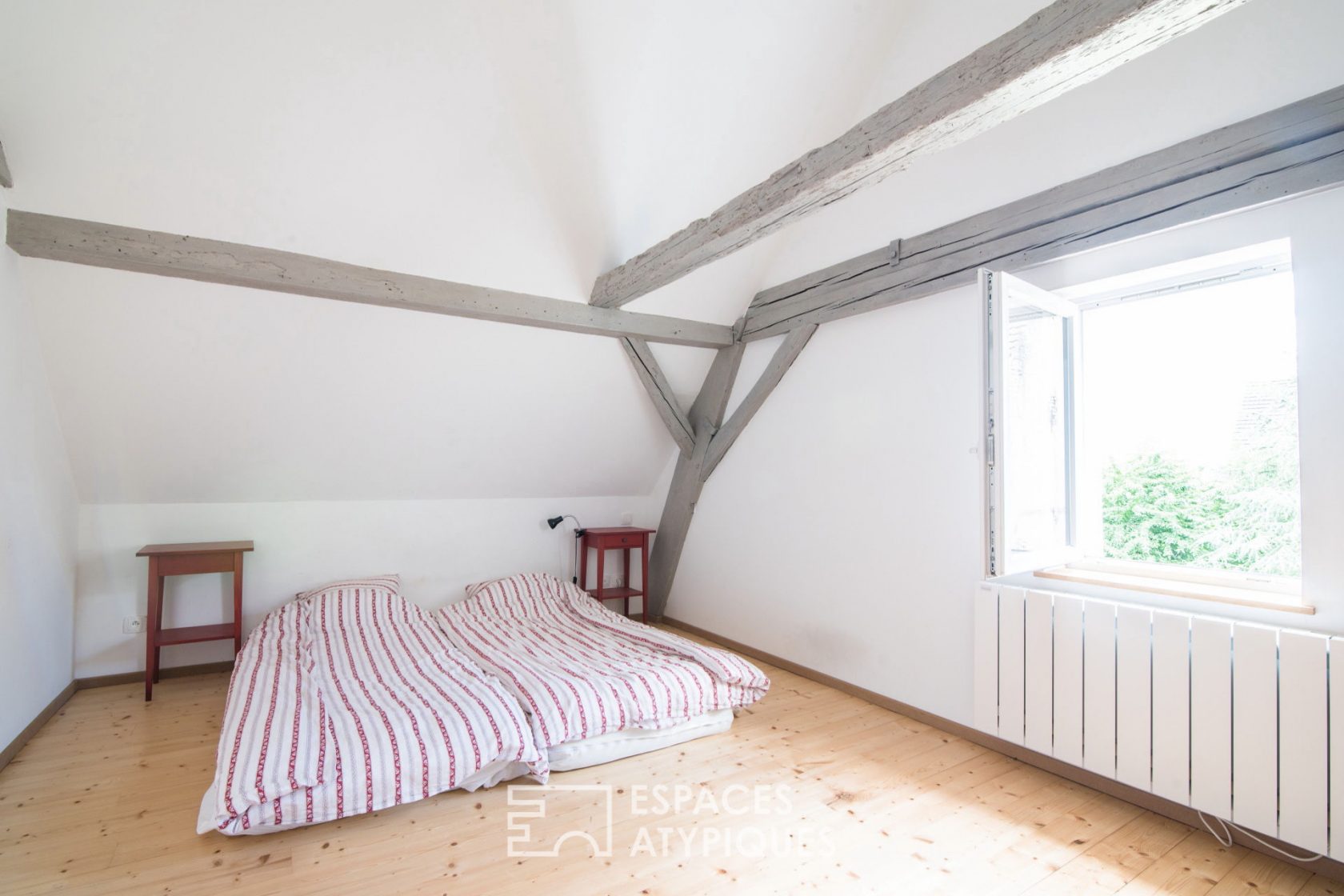 Le premier niveau dessert une vaste chambre, un dressing ainsi qu’une salle de bain. Il accueille également deux autres chambres avec accès à une terrasse en bois donnant sur le toit végétal de l’extension. Sous les toits, le dernier niveau avec son parquet en pin massif et sa charpente apparente donne à admirer tout le cachet de la maison. Il offre un second espace de vie mansardé, une salle de bain ainsi qu’une dernière chambre avec vue sur le jardin.