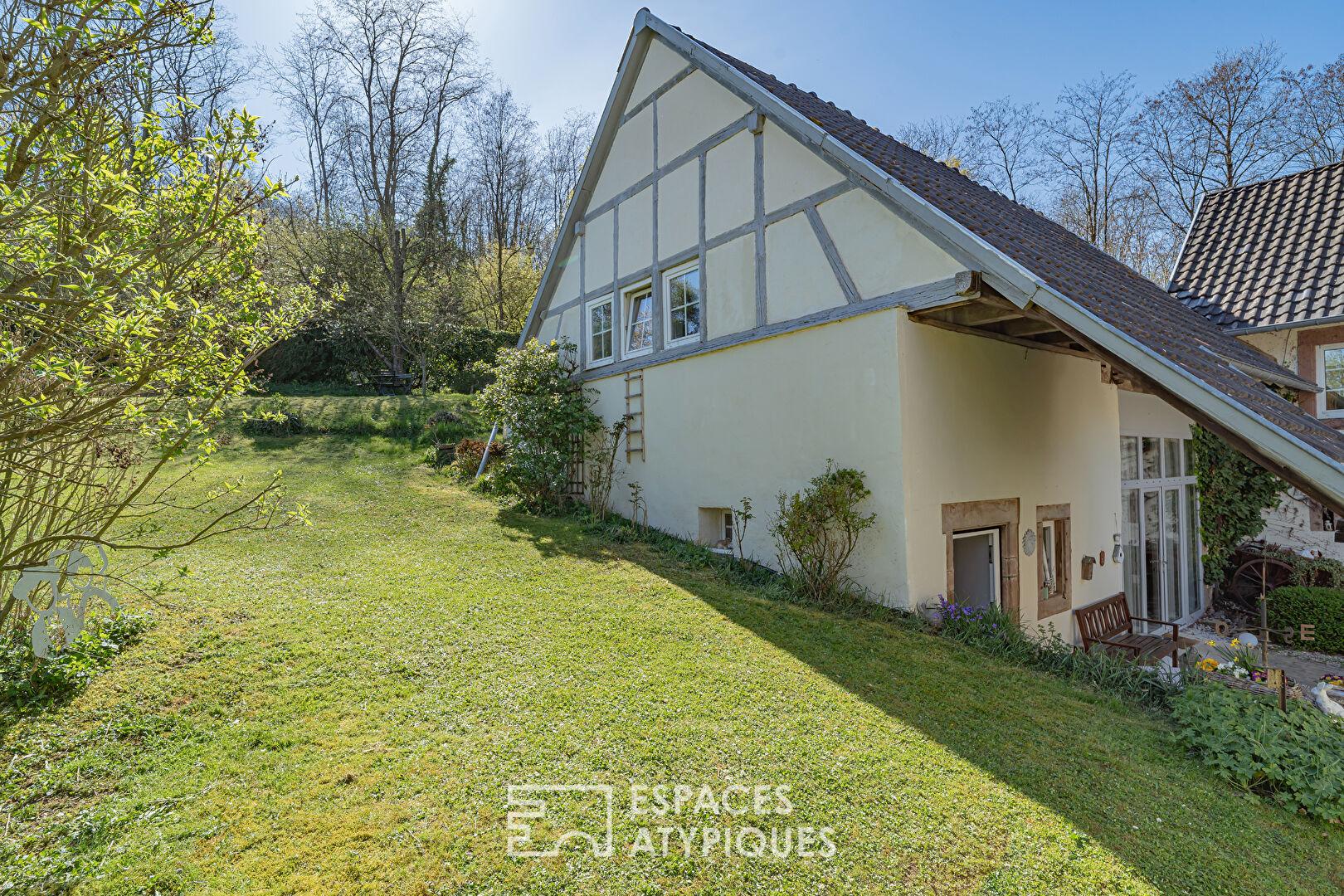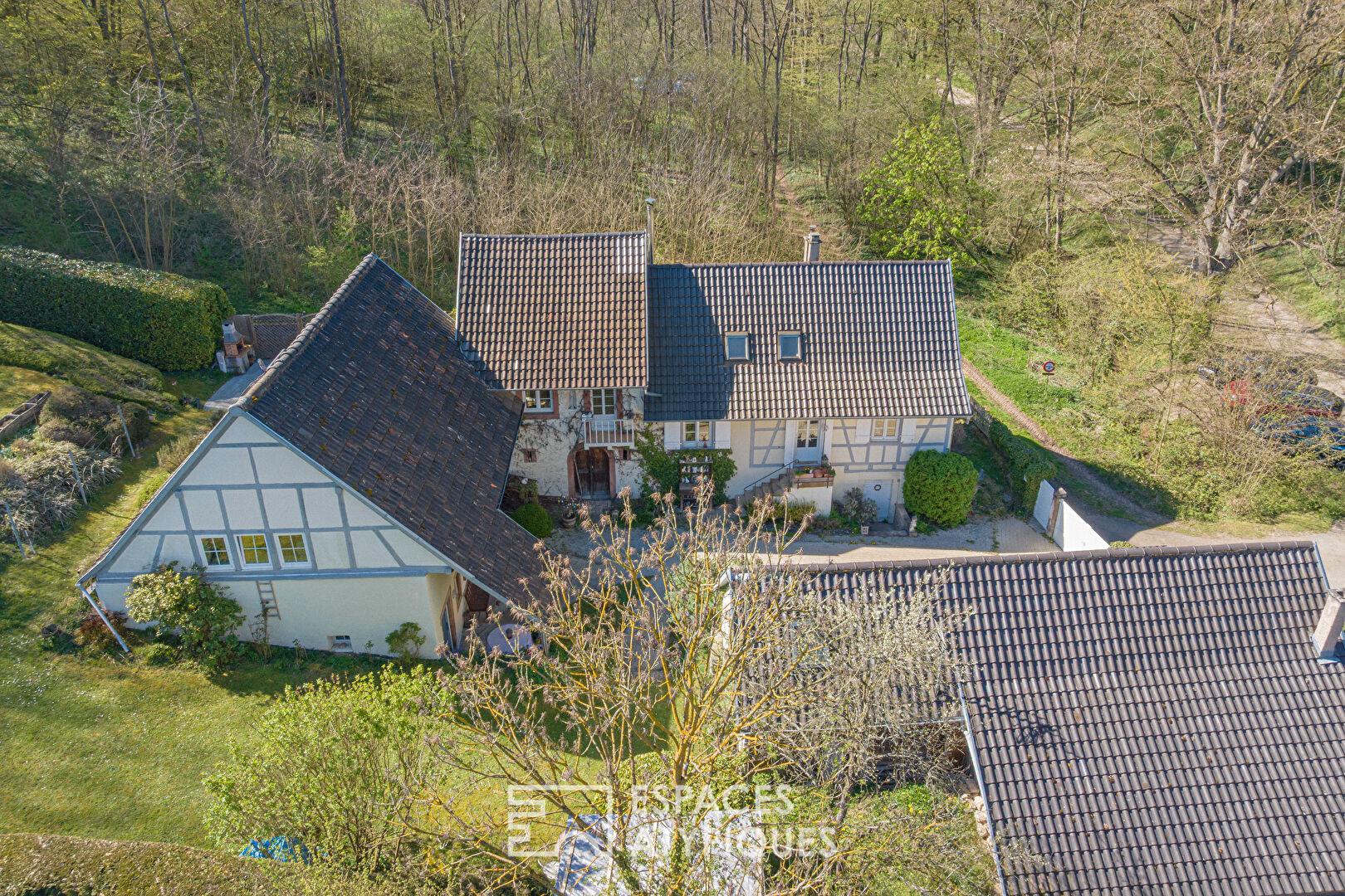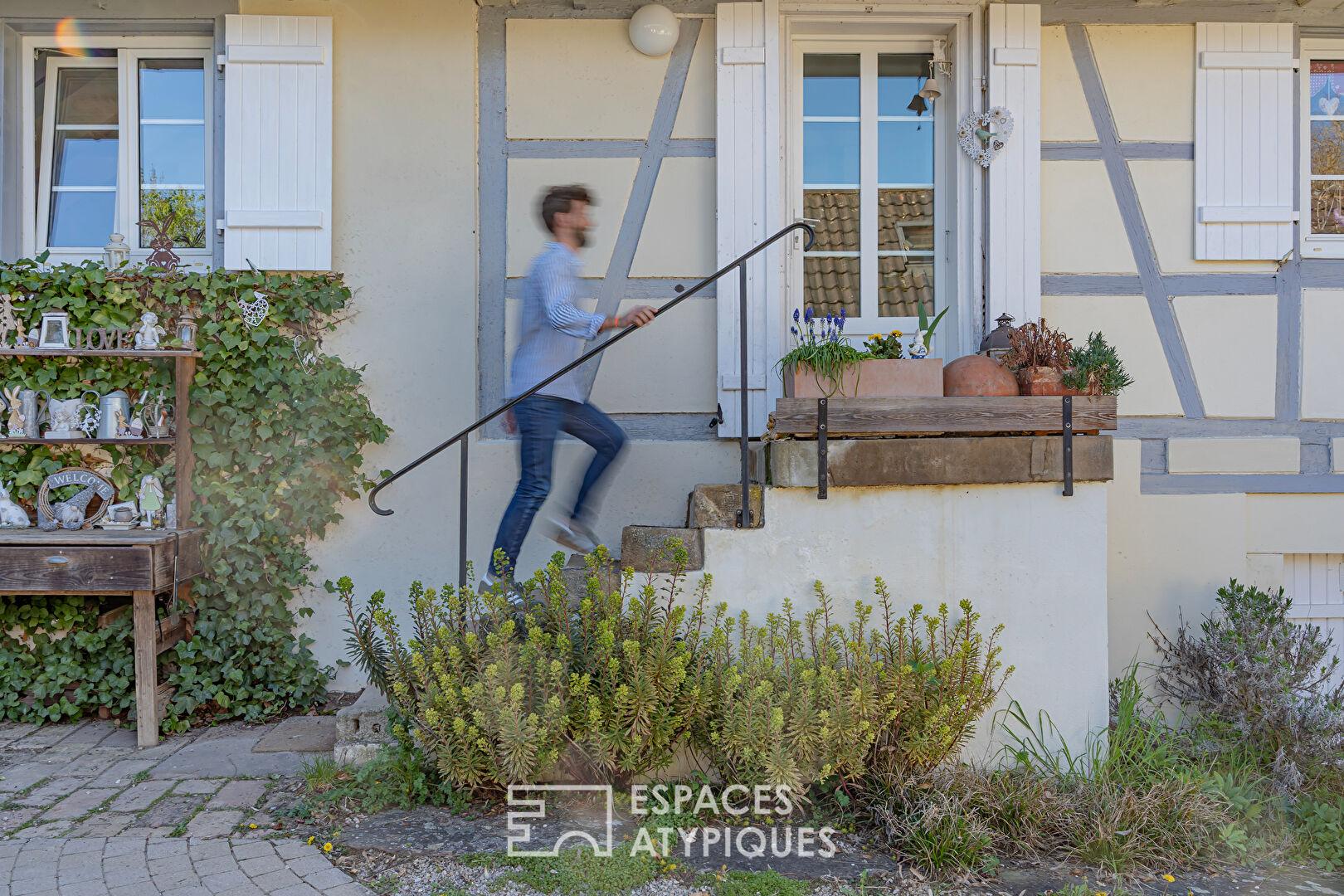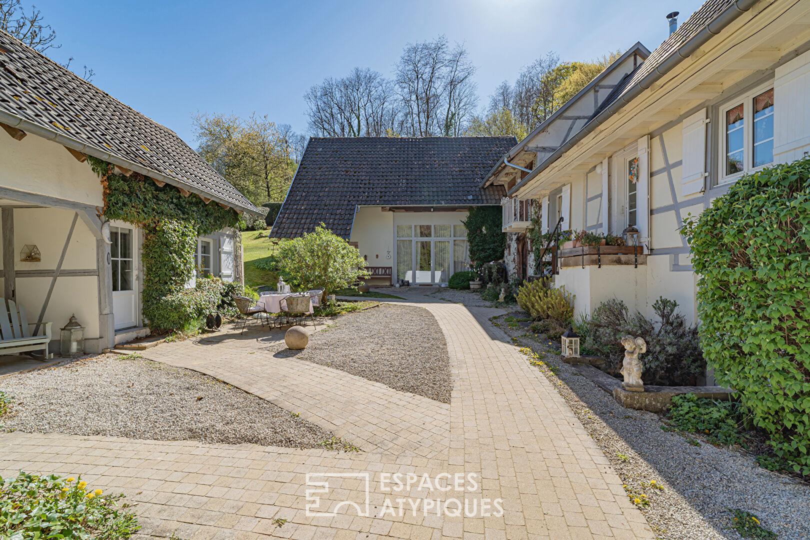 À seulement 25 minutes de Strasbourg, au coeur du Kochersberg, cette propriété de caractère prend place en lisière de forêt et bordée par un ruisseau. Cette ferme alsacienne à colombages, rénovée avec soin, développe 258 m² habitables sur un terrain arboré de 11,45 ares. Elle se compose d’une maison principale et de trois maisonnettes indépendantes actuellement exploitées en chambres d’hôtes, offrant une activité existante à fort potentiel tout en laissant entrevoir de multiples possibilités d’usage. Cour intérieure fleurie, terrasses intimistes et environnement naturel préservé confèrent à ce bien immobilier un charme singulier.