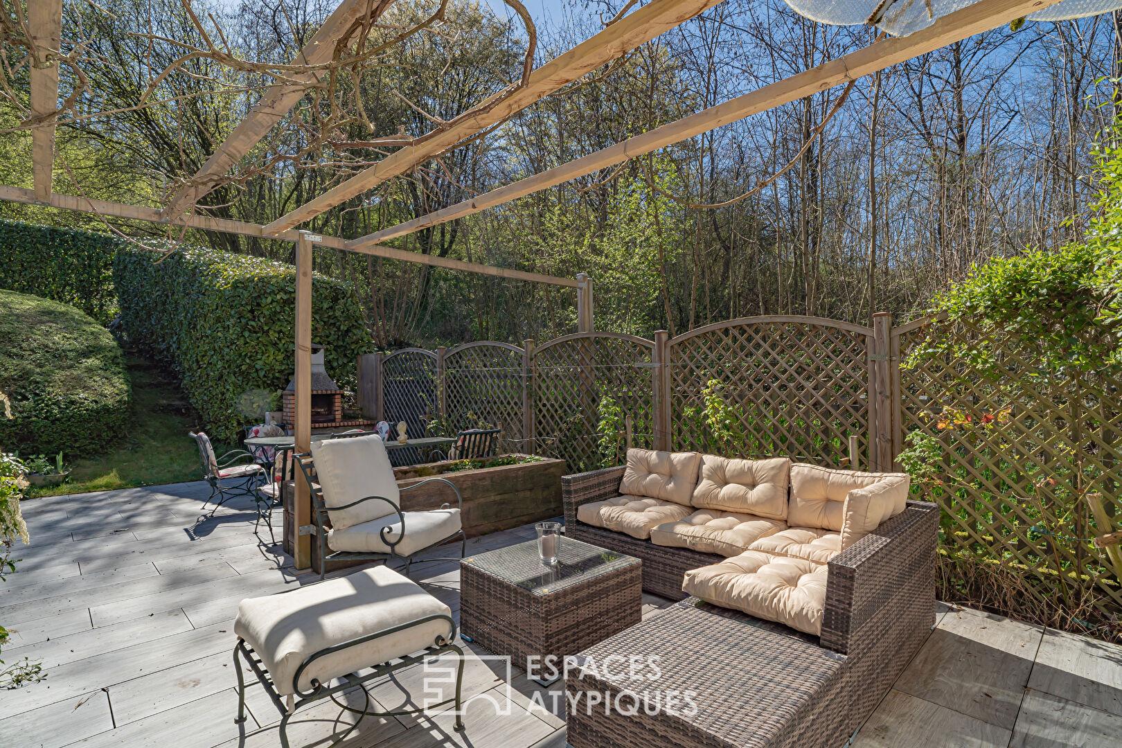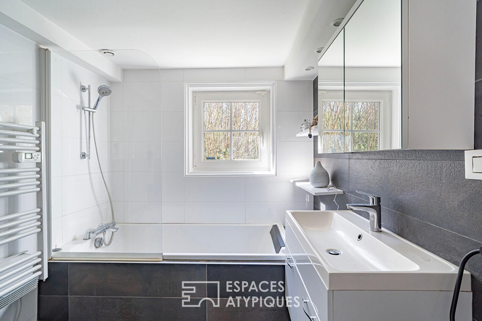 À l’extérieur, la propriété, entièrement close, s’organise autour d’une cour intérieure, véritable coeur de vie. Chaque maisonnette bénéficie de sa terrasse privative, favorisant calme et indépendance. Le jardin arboré, en bordure immédiate de forêt, offre plusieurs espaces de détente dans une atmosphère paisible. Le vaste terrain permet d’envisager l’implantation d’une piscine ou d’autres aménagements extérieurs, renforçant encore le potentiel du lieu. La proximité des commodités, écoles et axes vers Strasbourg assure un équilibre entre nature et praticité.