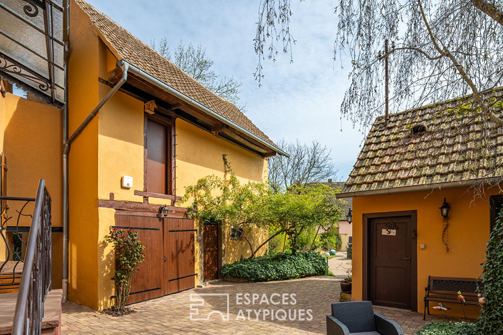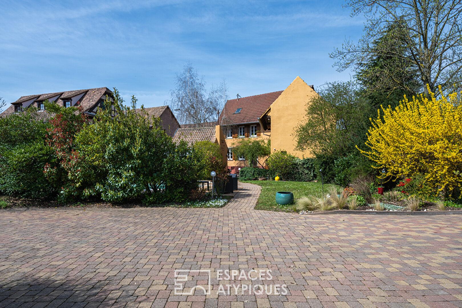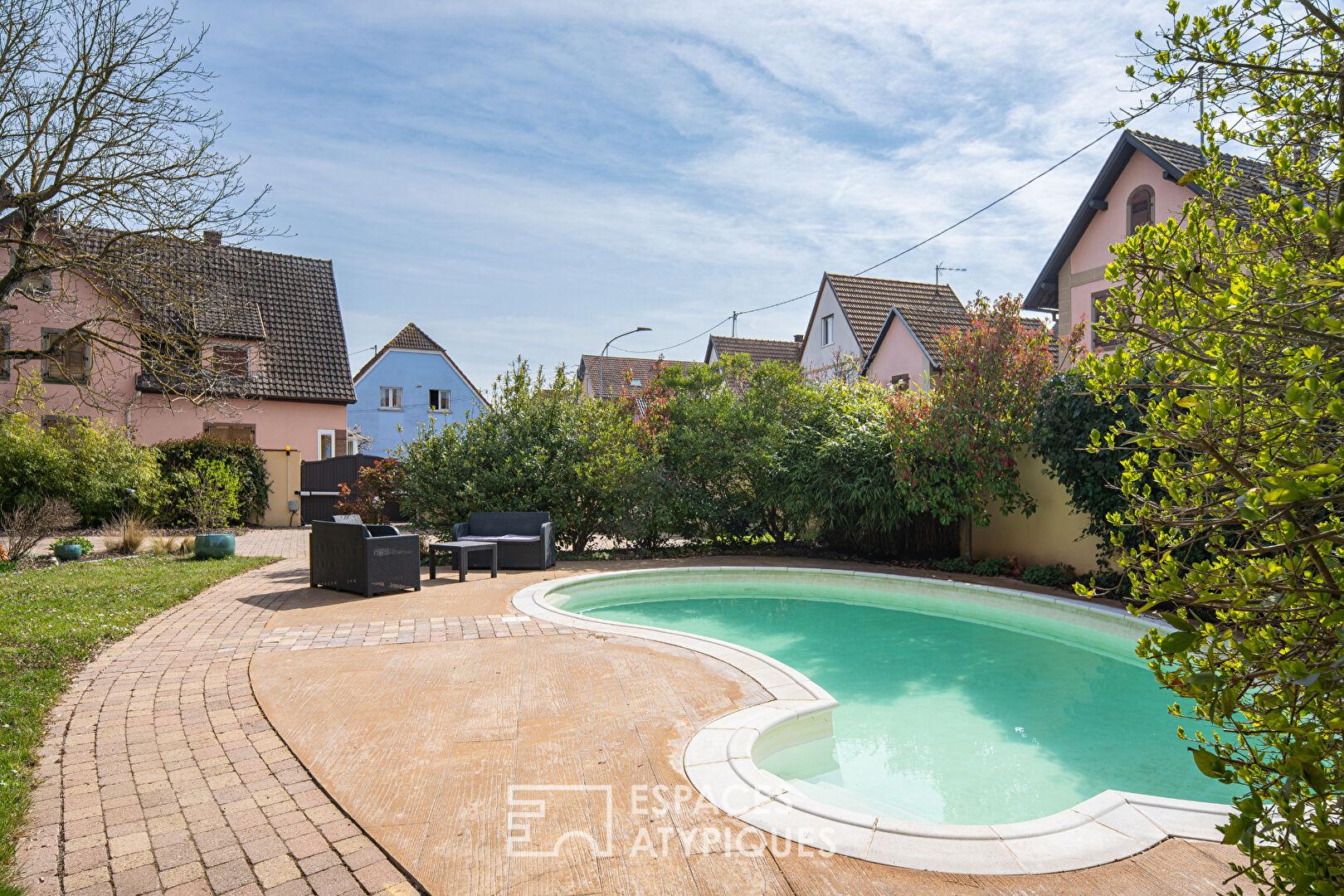 À l’extérieur, le jardin paysager dévoile un cadre intimiste et soigné, propice à la détente. La piscine s’intègre harmonieusement dans cet écrin de verdure, véritable prolongement des espaces de vie aux beaux jours. Plusieurs coins terrasse viennent rythmer les extérieurs et permettent de profiter de différentes ambiances tout au long de la journée. Deux dépendances complètent l’ensemble et laissent entrevoir un potentiel d’aménagement intéressant selon les besoins. L’environnement immédiat séduit par sa proximité avec les écoles, commerces et axes permettant de rejoindre Strasbourg rapidement.