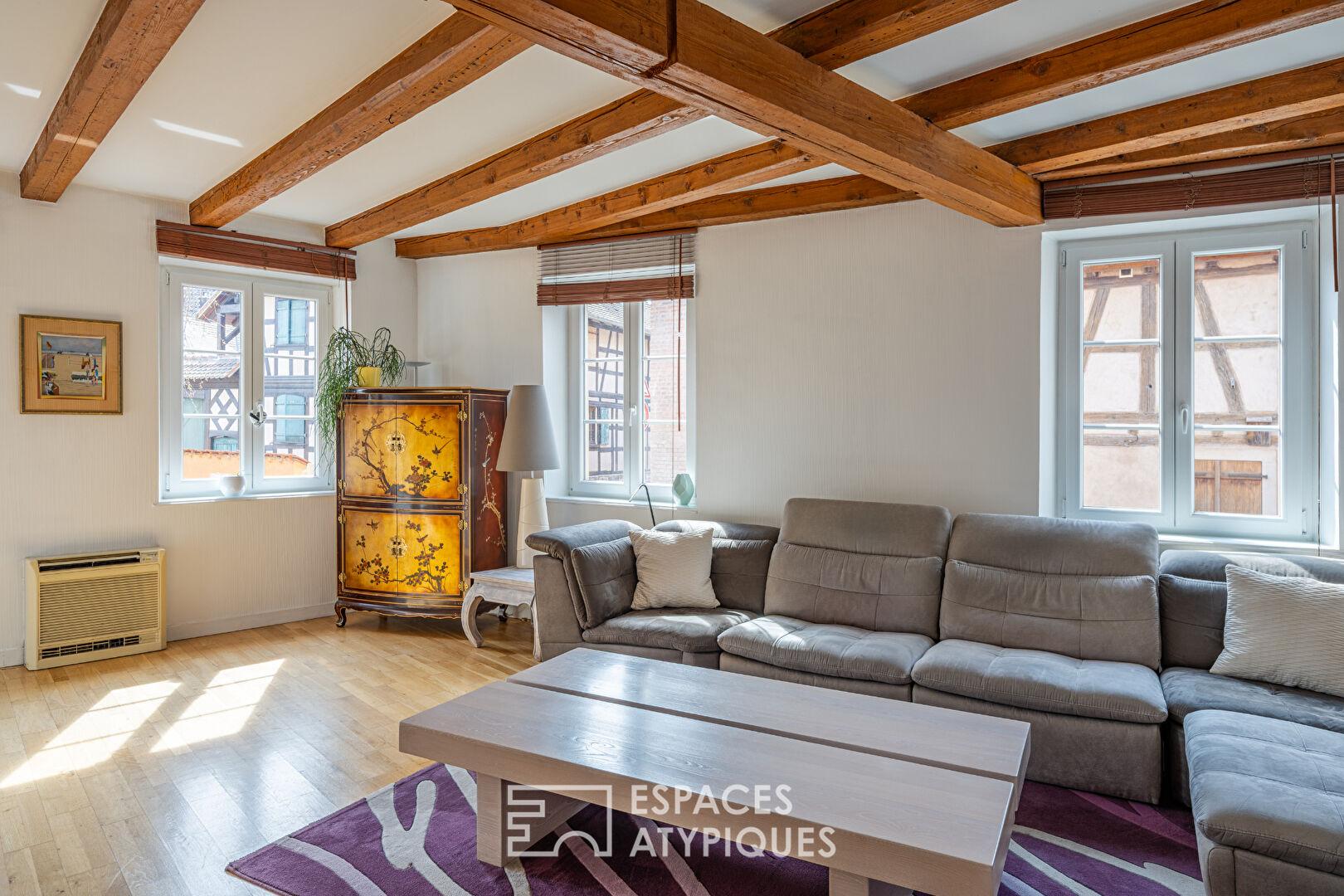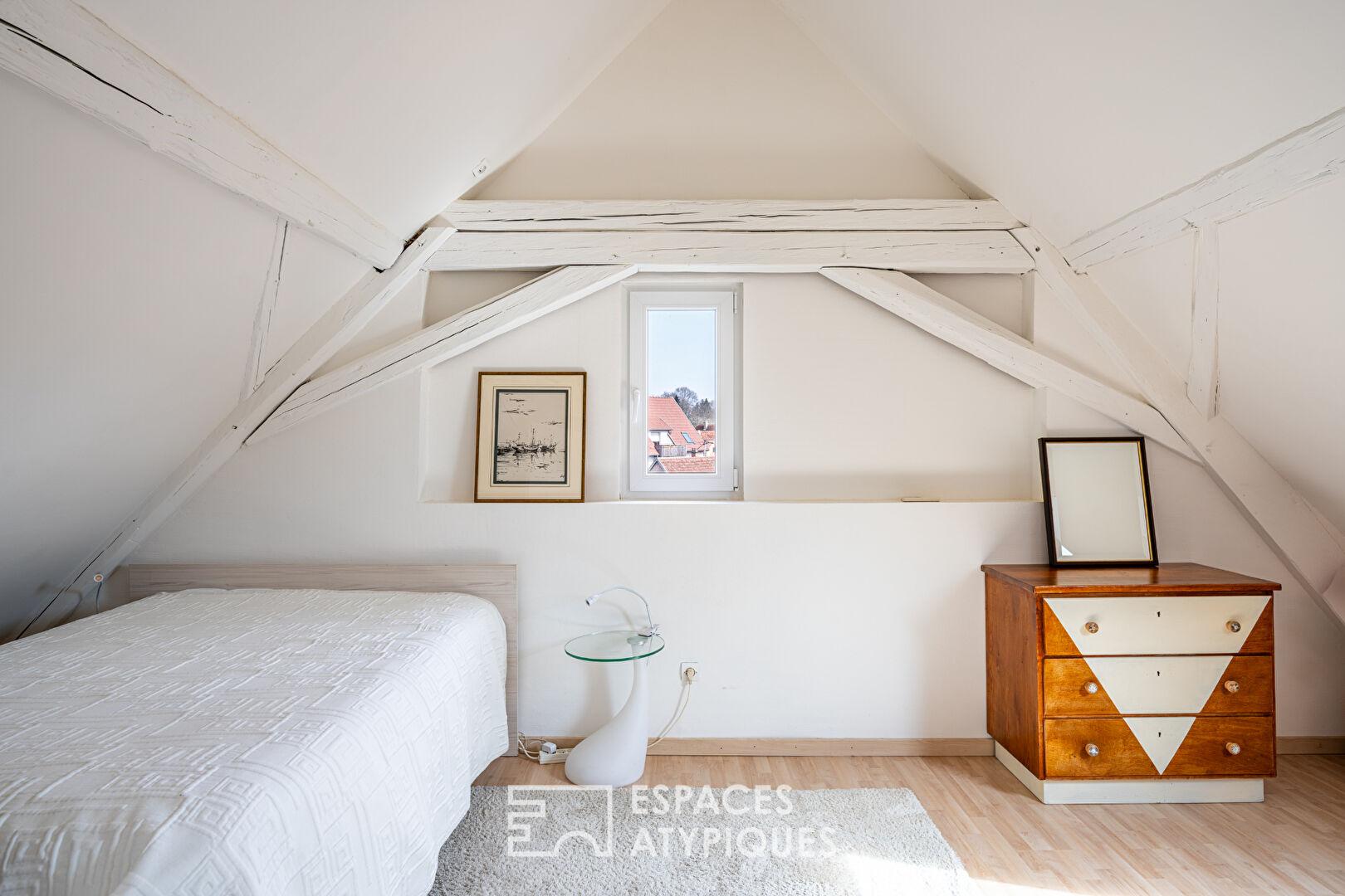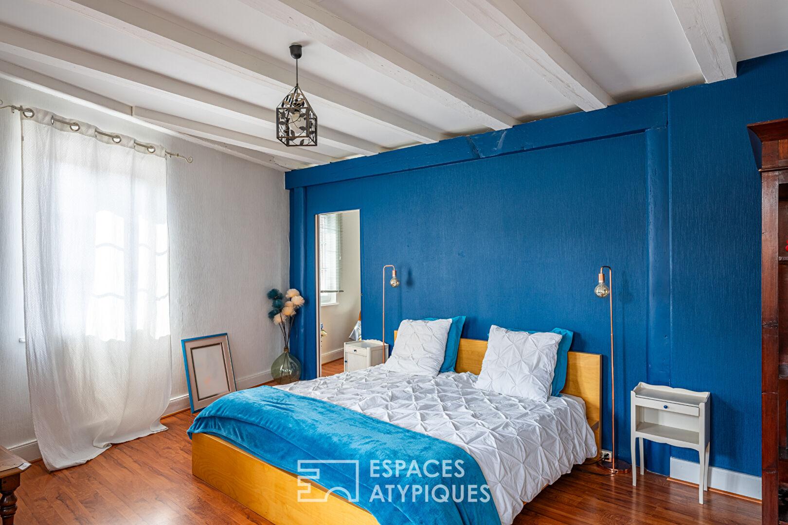 Dès l’entrée, les volumes généreux et la luminosité naturelle mettent en valeur le cachet authentique du bien. Le salon de 30 m², sublimé par une belle hauteur sous plafond, des poutres apparentes et un parquet massif, offre une atmosphère chaleureuse. La cuisine contemporaine, entièrement équipée, s’ouvre sur une salle à manger attenante, formant un espace de vie convivial et fonctionnel.
