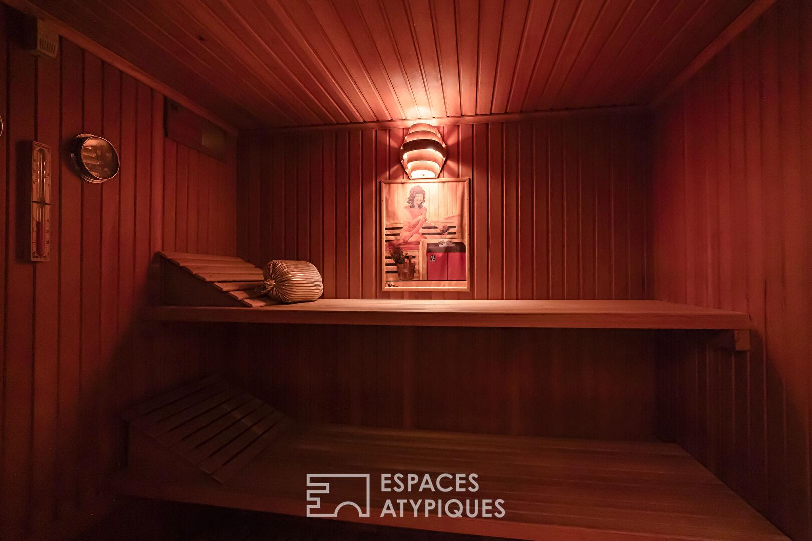 La maison s’organise sur deux niveaux. Le rez-de-chaussée accueille un hall d’entrée spacieux qui dessert un vaste salon baigné de lumière, sublimé par une cheminée sculptée en pierre et des boiseries raffinées. Dans son prolongement, une salle-à-manger et une cuisine indépendante sont connectées par un grand balcon filant orienté sur le jardin. Ce niveau comprend également un espace nuit composé de deux chambres, d’une spacieuse salle de bains avec douche et baignoire, d’un bureau et d’un débarras. En rez-de-jardin, les volumes sont tout aussi généreux : un salon bar, une seconde salle-à-manger, un garde-manger et un espace bien-être comprenant une piscine intérieure (à remettre en fonctionnement), un sauna, un solarium et un accès direct au jardin. Une chaufferie, un garage double en enfilade, une cave à vin ainsi qu’un logement deux pièces avec entrée indépendante complètent ce niveau.