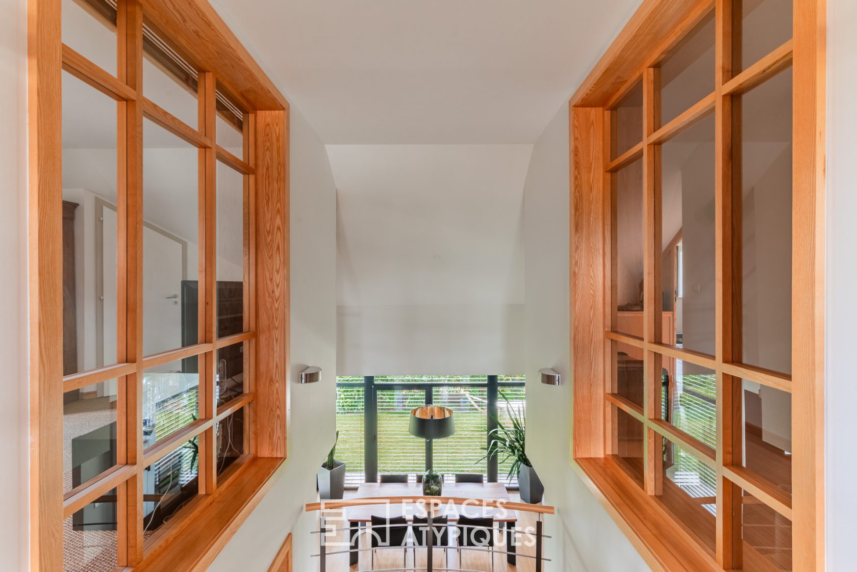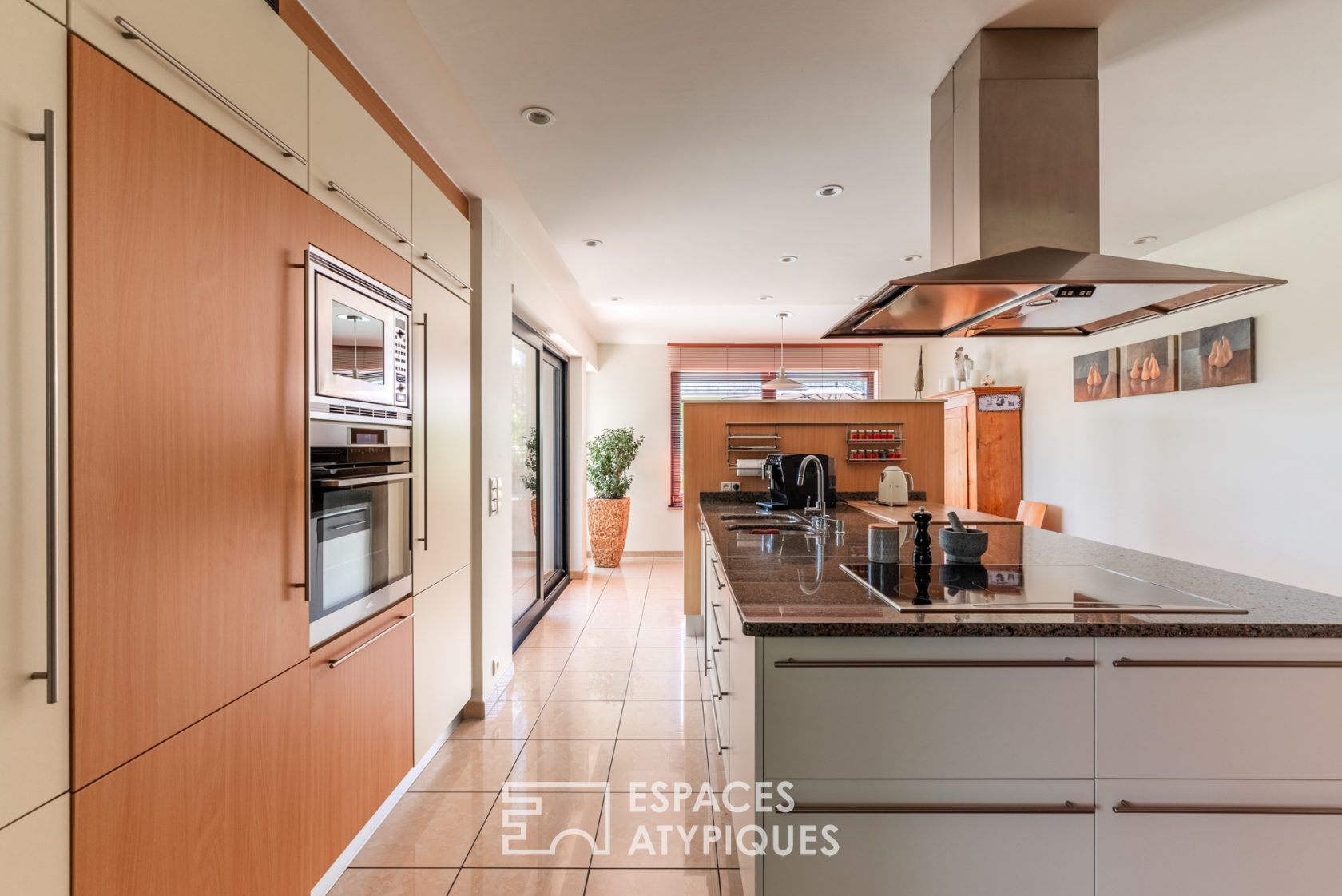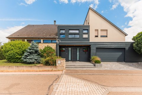 Située à l’écart du centre-ville, tout en restant à proximité de toutes les commodités, cette maison d’architecte de 300 m² construite en 2000 prend place sur une parcelle de 10 ares. Ses généreux volumes aux finitions soignées sauront séduire une famille à la recherche d’un environnement calme et verdoyant.
