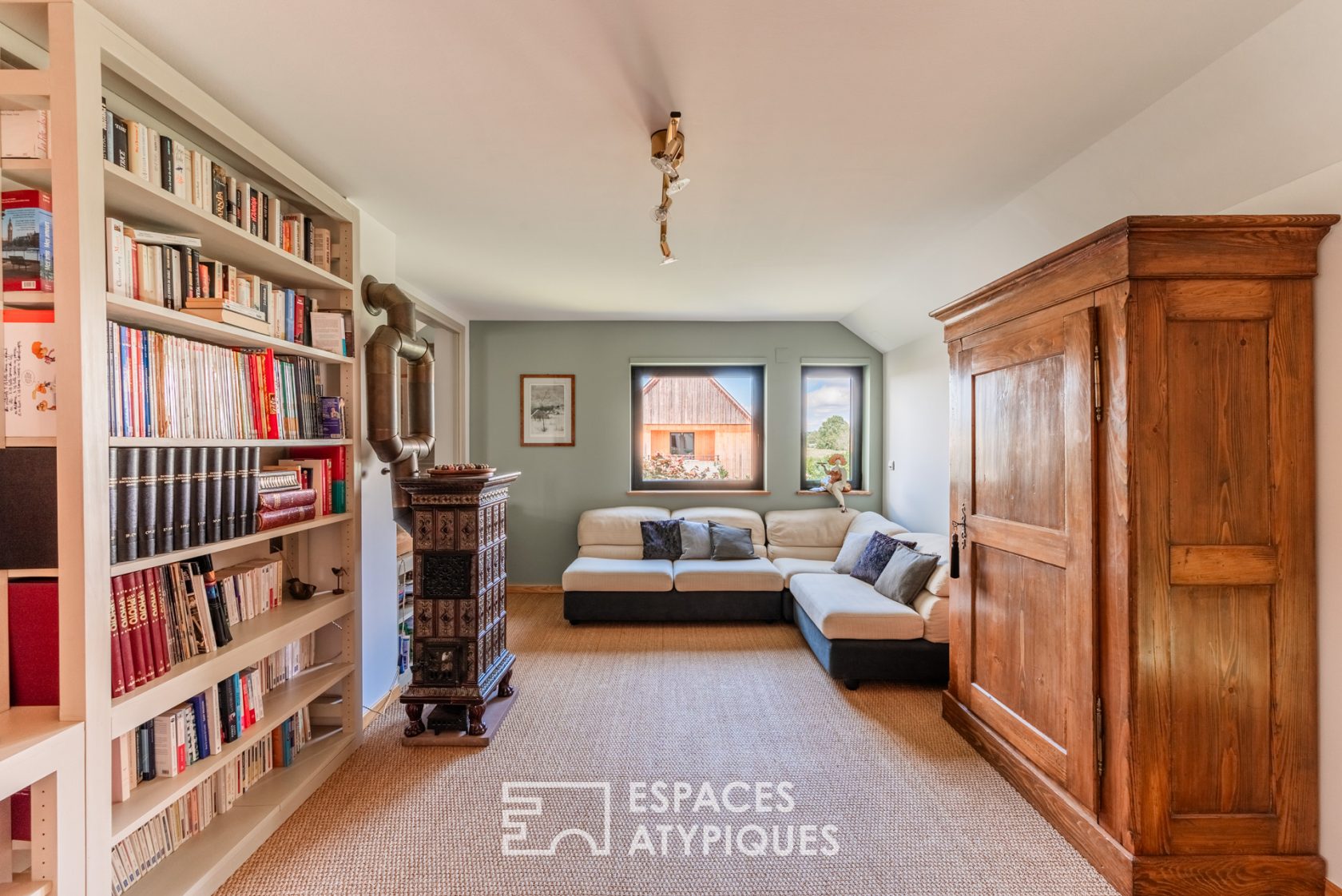 L’entrée agrémentée d’un vestiaire s’ouvre sur une vaste pièce de vie de 70 m². La chaleur du parquet en bambou massif et les volumes offerts par les imposantes hauteurs sous plafond apportent une touche de sérénité aux lieux tandis que les grandes baies vitrées inondent l’espace de lumière naturelle. Adossée au mur du salon, une cheminée promet de chaleureuses soirées d’hiver. Attenante à cet espace, la vaste cuisine ouverte jouxte un cellier ainsi qu’une buanderie. Elle permet également un accès de plain-pied à une agréable terrasse abritée permettant de profiter de l’extérieur en toute saison. Dans son prolongement, la piscine chauffée grâce à une pompe à chaleur promet des instants de détente et de convivialité partagés.