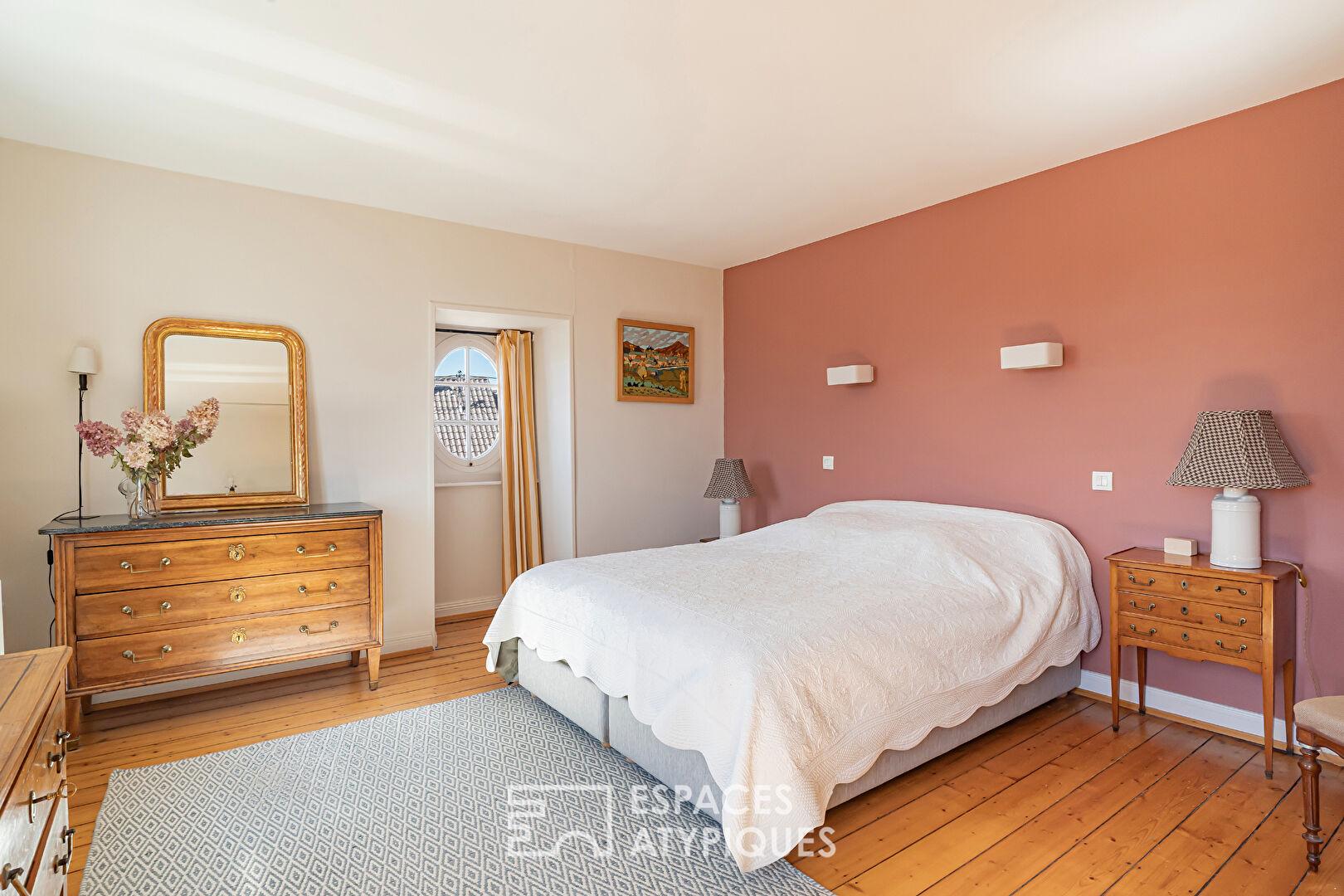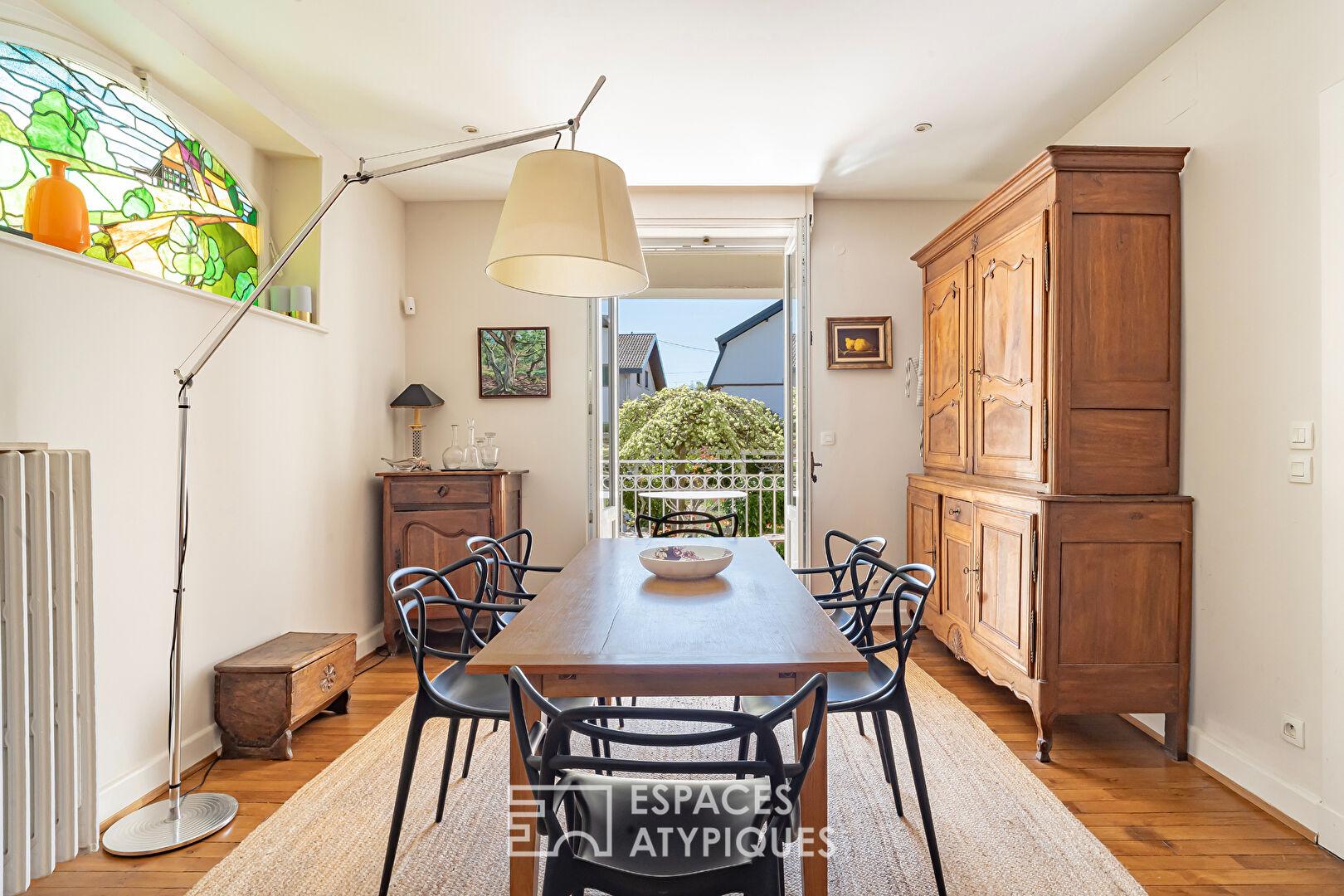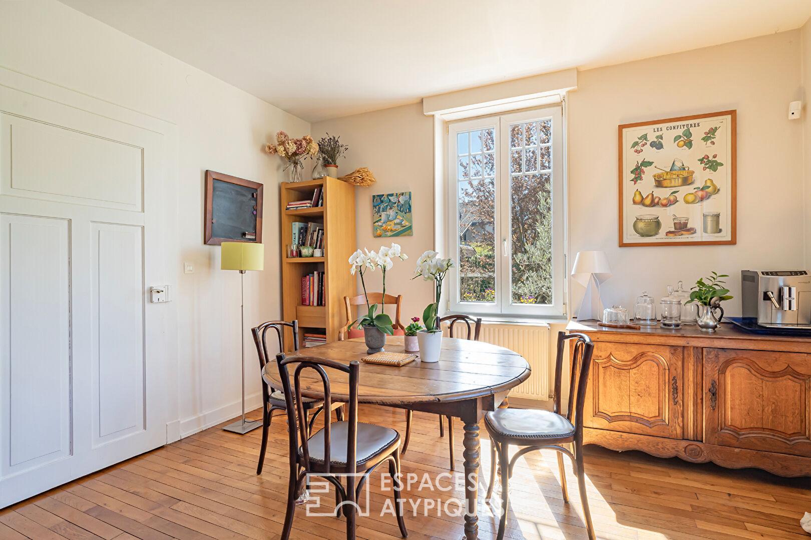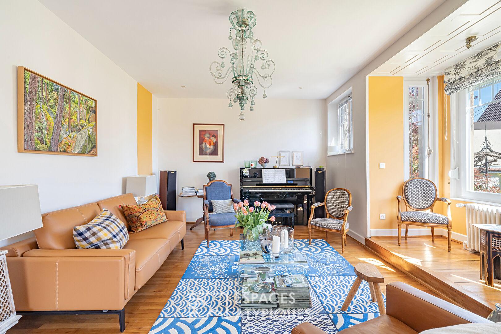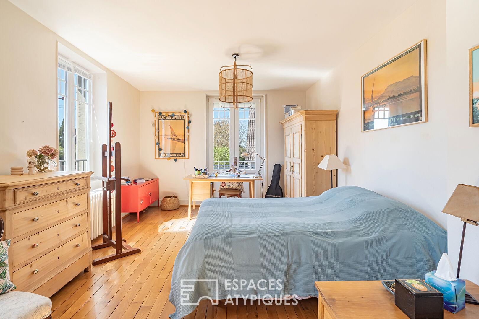Passé la porte cintrée, l’entrée dévoile une organisation fluide où les volumes et la lumière prédominent. La pièce de vie, orientée plein Sud, s’habille d’un parquet massif d’origine et d’un poêle en céramique ancienne qui souligne le caractère historique du lieu. Un oriel baigne l’espace de clarté, offrant une perspective apaisante sur la verdure. La cuisine dînatoire indépendante, véritable coeur de maison avec son piano de cuisson magistral et une buanderie complètent ce niveau. Un escalier de caractère mène au premier étage dédié au repos avec deux chambres, dont une s’ouvre sur un balcon surplombant le jardin. Une salle de bain au charme anglais et un vaste espace bibliothèque sur mesure complètent ce palier. Le dernier niveau accueille trois chambres supplémentaires dont une vaste suite parentale distinguée par son oeil-de-boeuf et son dressing indépendant.