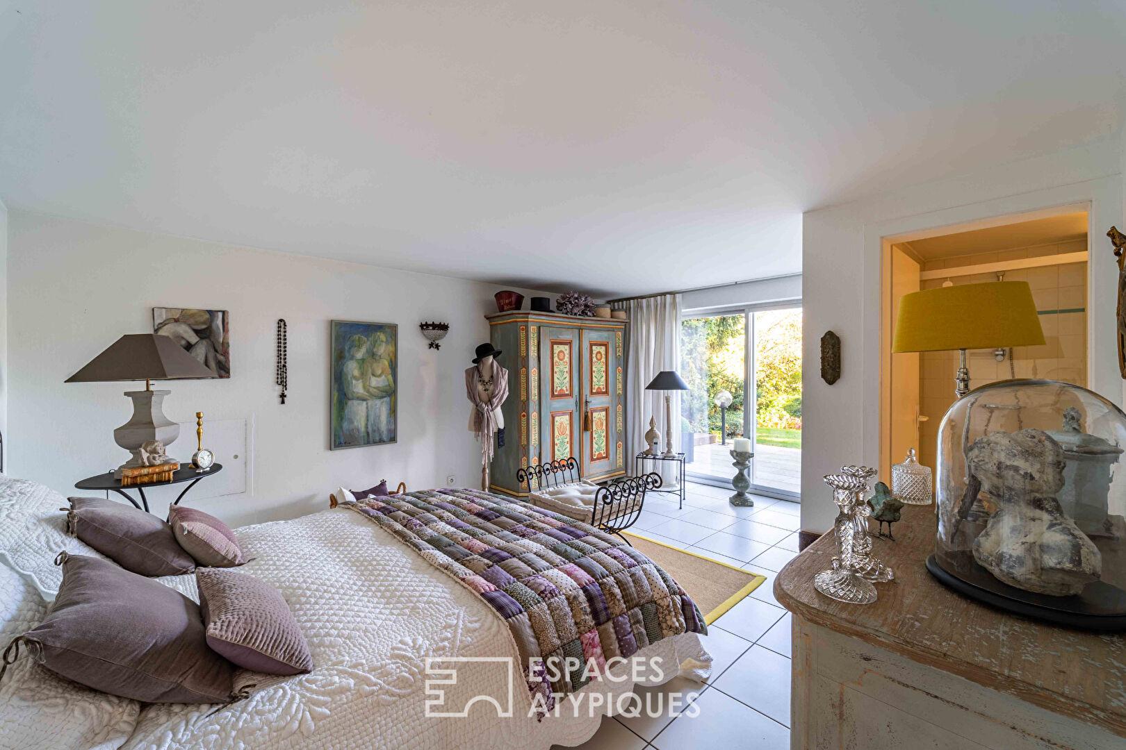 Quelques marches en contrebas, le rez-de-jardin abrite un espace idéal pour recevoir des invités, avec une chambre confortable, un salon avec cheminée et une salle d’eau. Ce niveau bénéficie d’un accès de plain-pied à une terrasse abritée et au jardin. Située en contrebas, la piscine circulaire est accompagnée d’un spa qui invitent tous deux à des instants de détente, enveloppé par le calme ressourçant des nombreux arbres de la propriété.