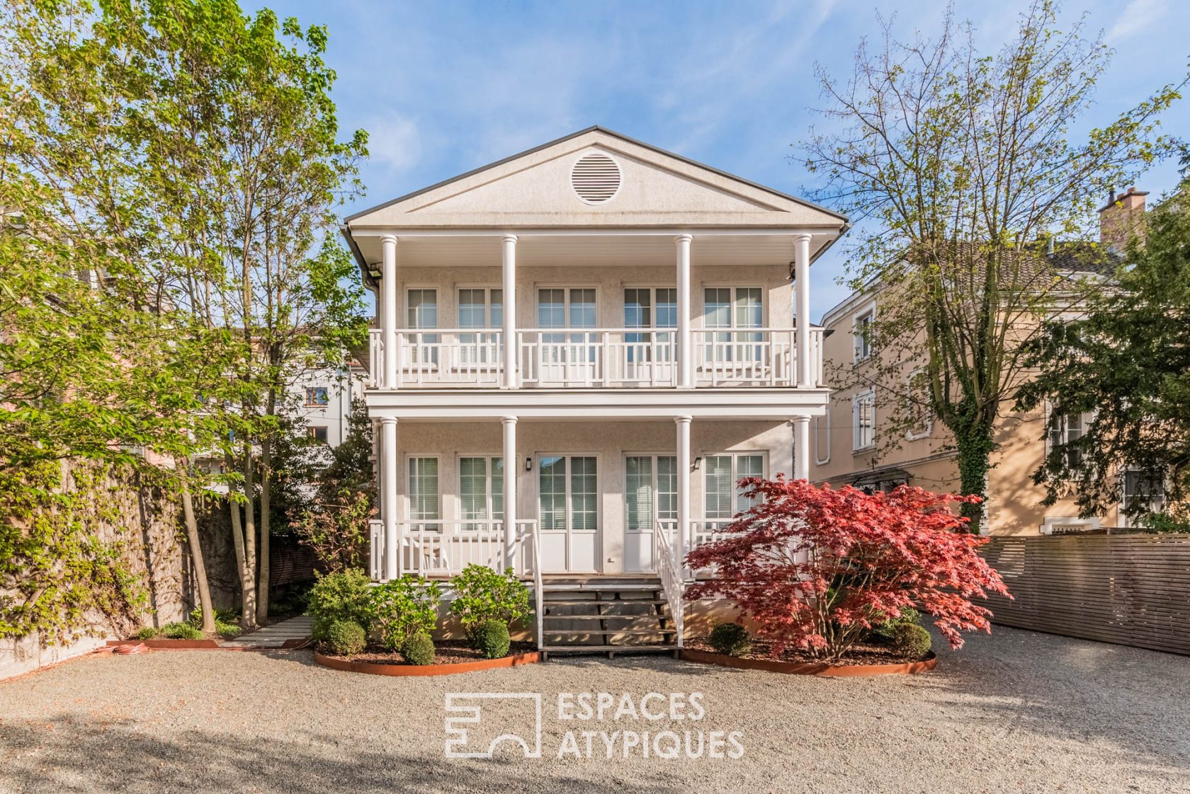 Une porte fenêtre permet d’accéder à la terrasse et au jardin blotti à l’arrière de la propriété. Après une transition minérale, l’espace verdoyant promet d’agréables moments de détente et de convivialité tout en profitant de la vue sur la façade qui évoque une inspiration Louisiane. Un garage vient se fondre parfaitement à l’ensemble tandis que plusieurs places de stationnement sont envisageables.