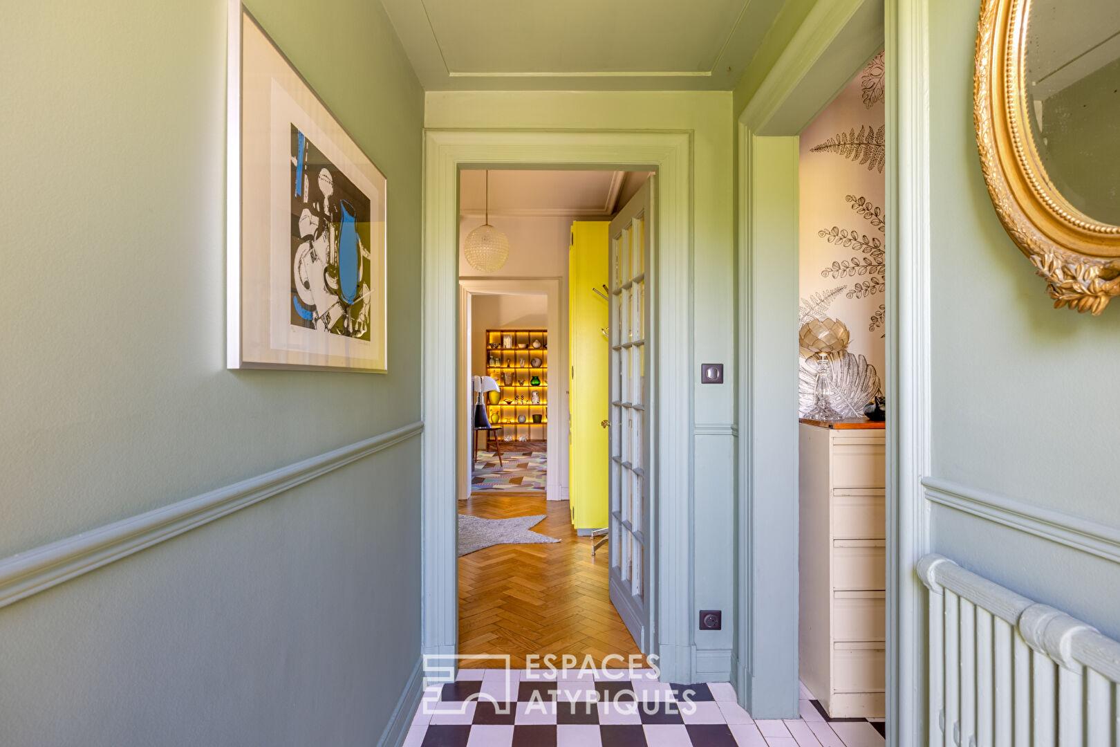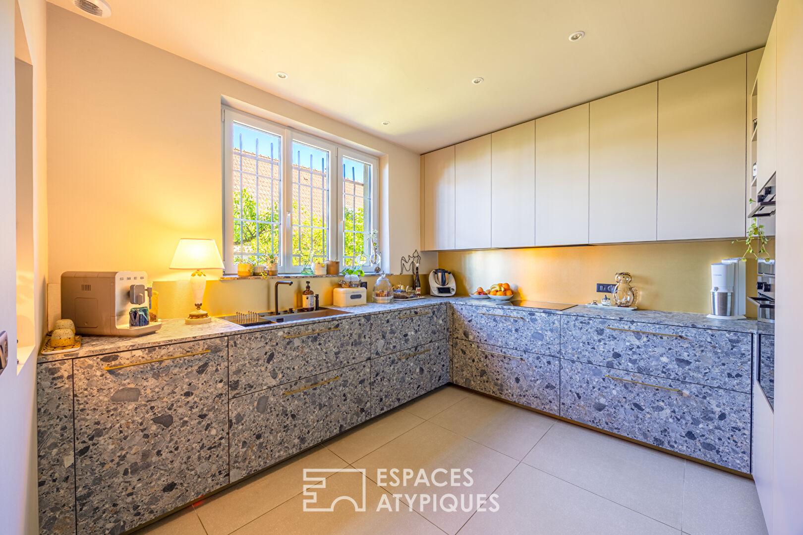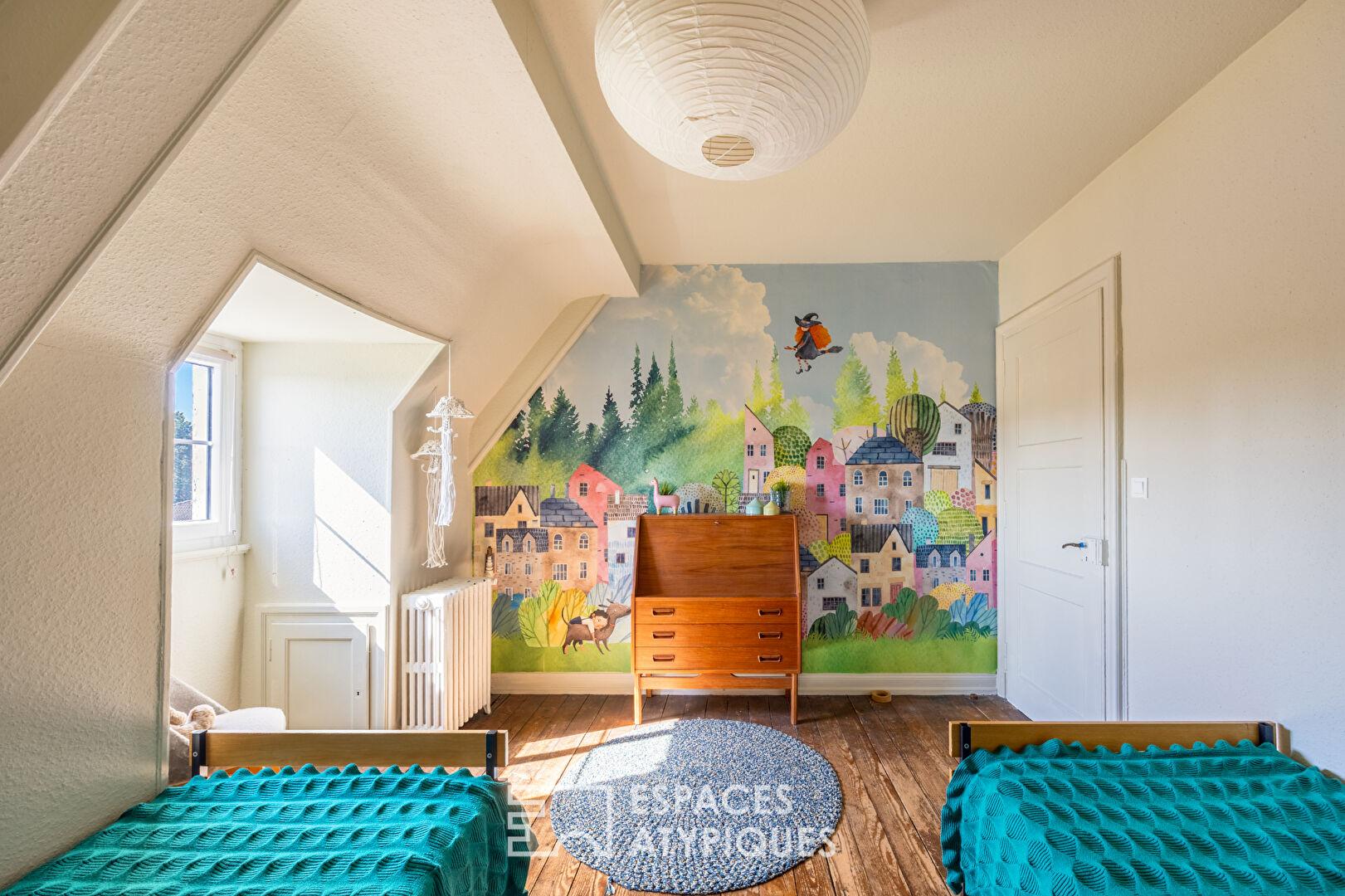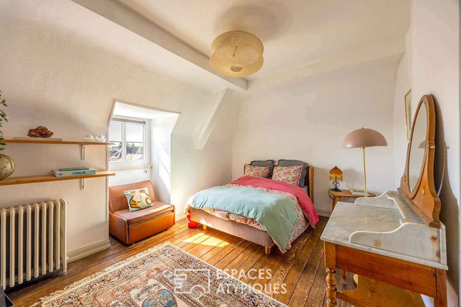 Organisée sur trois niveaux, la distribution intérieure met en valeur les volumes d’origine et les éléments patrimoniaux soigneusement restaurés. Dès l’entrée, les carreaux de ciment d’époque dialoguent avec un parquet en chevrons élégant menant vers de généreuses pièces de réception. Le double salon, agrémenté d’un poêle à bois récent, s’ouvre directement sur le jardin et prolonge naturellement les espaces de vie. La salle à manger lumineuse complète cet ensemble convivial. La cuisine Cesar entièrement équipée s’accompagne d’un espace repas et d’un cellier attenant.
