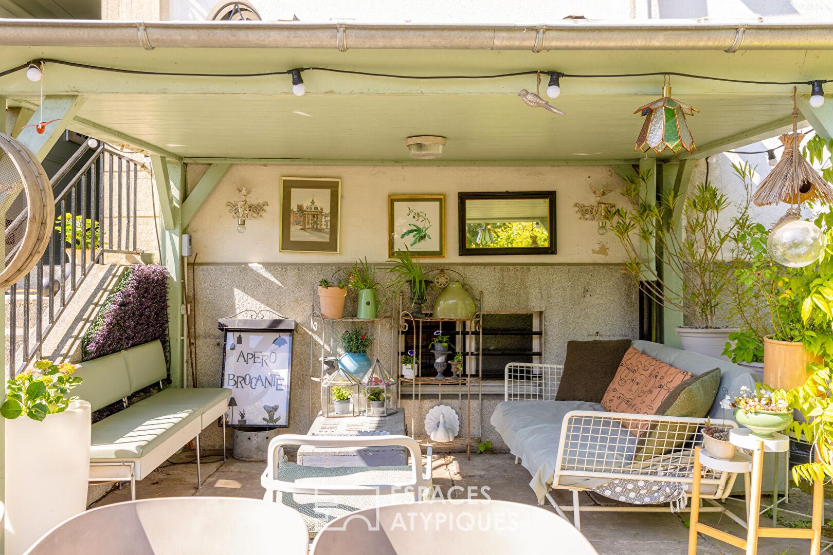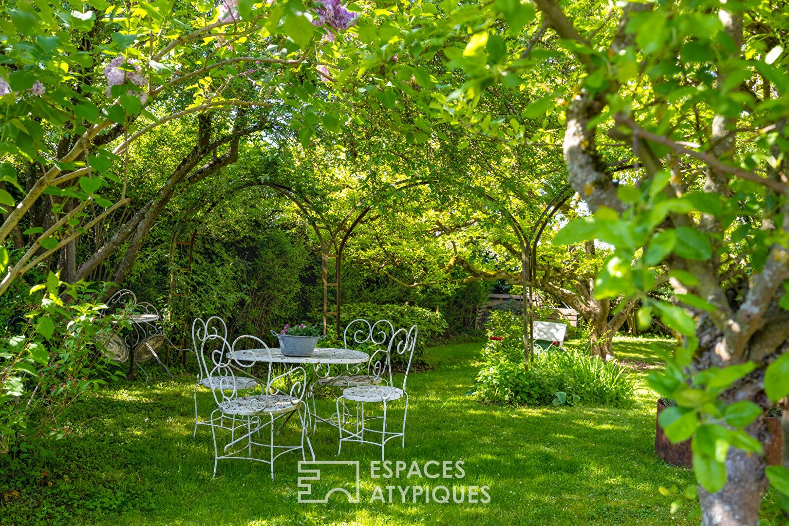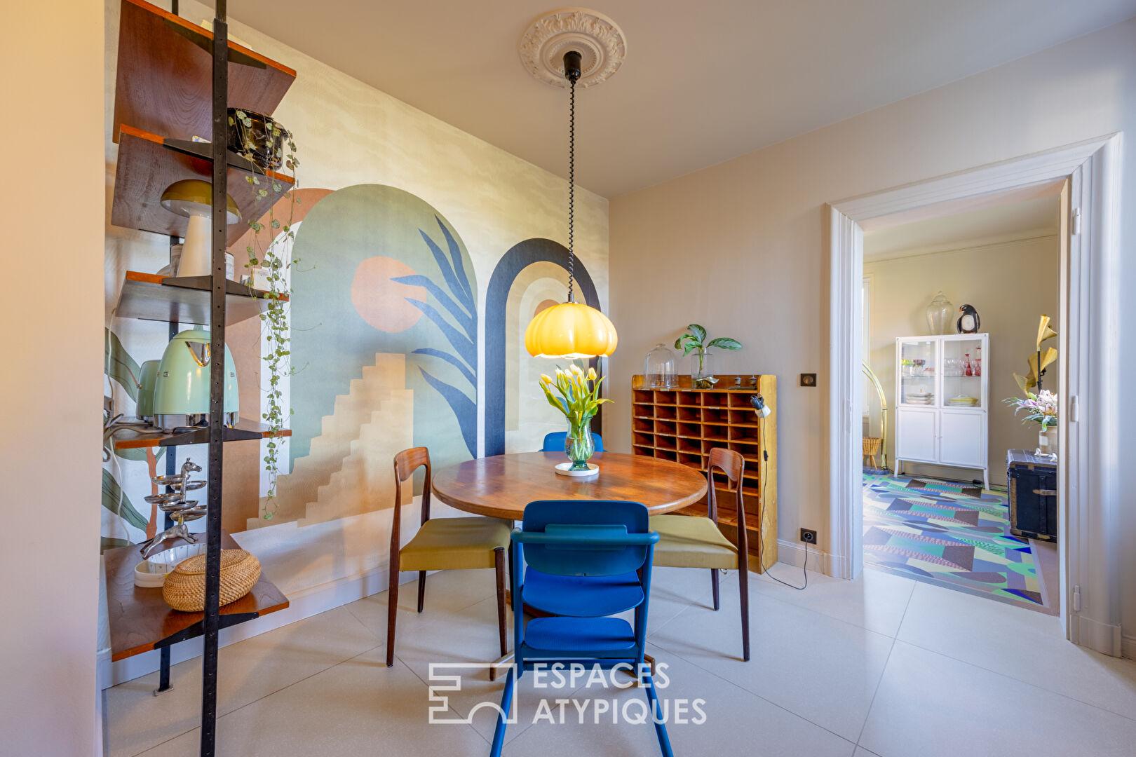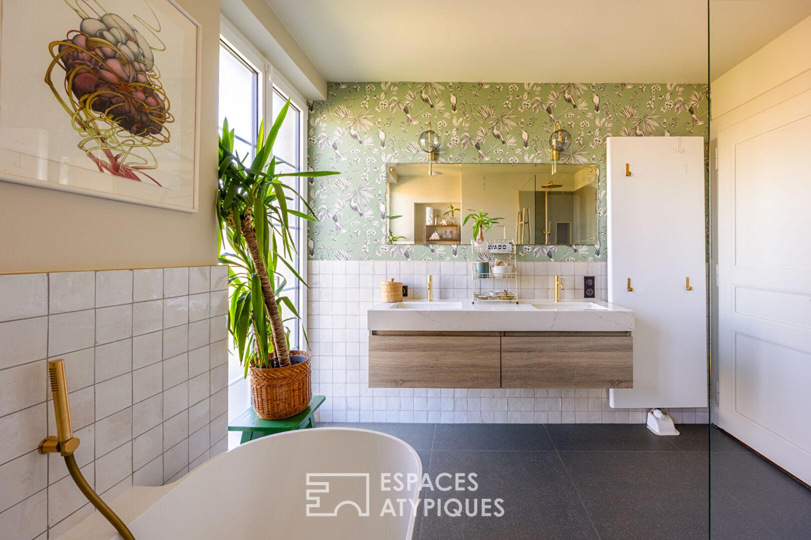 Organisée sur trois niveaux, la distribution intérieure met en valeur les volumes d’origine et les éléments patrimoniaux soigneusement restaurés. Dès l’entrée, les carreaux de ciment d’époque dialoguent avec un parquet en chevrons élégant menant vers de généreuses pièces de réception. Le double salon, agrémenté d’un poêle à bois récent, s’ouvre directement sur le jardin et prolonge naturellement les espaces de vie. La salle à manger lumineuse complète cet ensemble convivial. La cuisine Cesar entièrement équipée s’accompagne d’un espace repas et d’un cellier attenant.