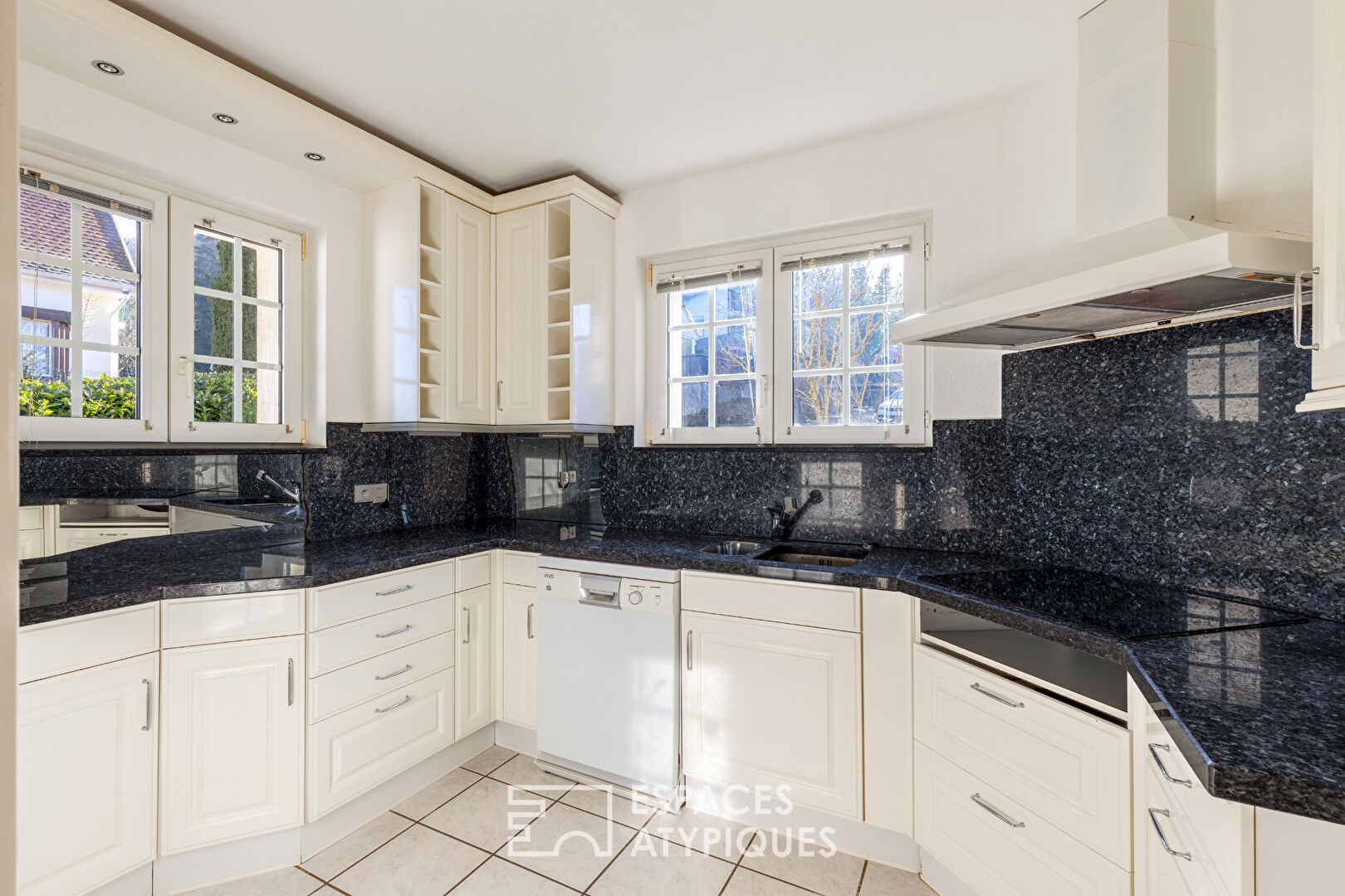 L’entrée spacieuse structure la circulation et mène naturellement vers une cuisine équipée, pensée comme un espace convivial du quotidien. Celle-ci s’ouvre sur une vaste pièce de vie traversante, largement éclairée par de généreuses ouvertures. Le séjour, agrémenté d’une cheminée, se prolonge par une véranda offrant une continuité naturelle avec l’extérieur et un espace de vie supplémentaire.