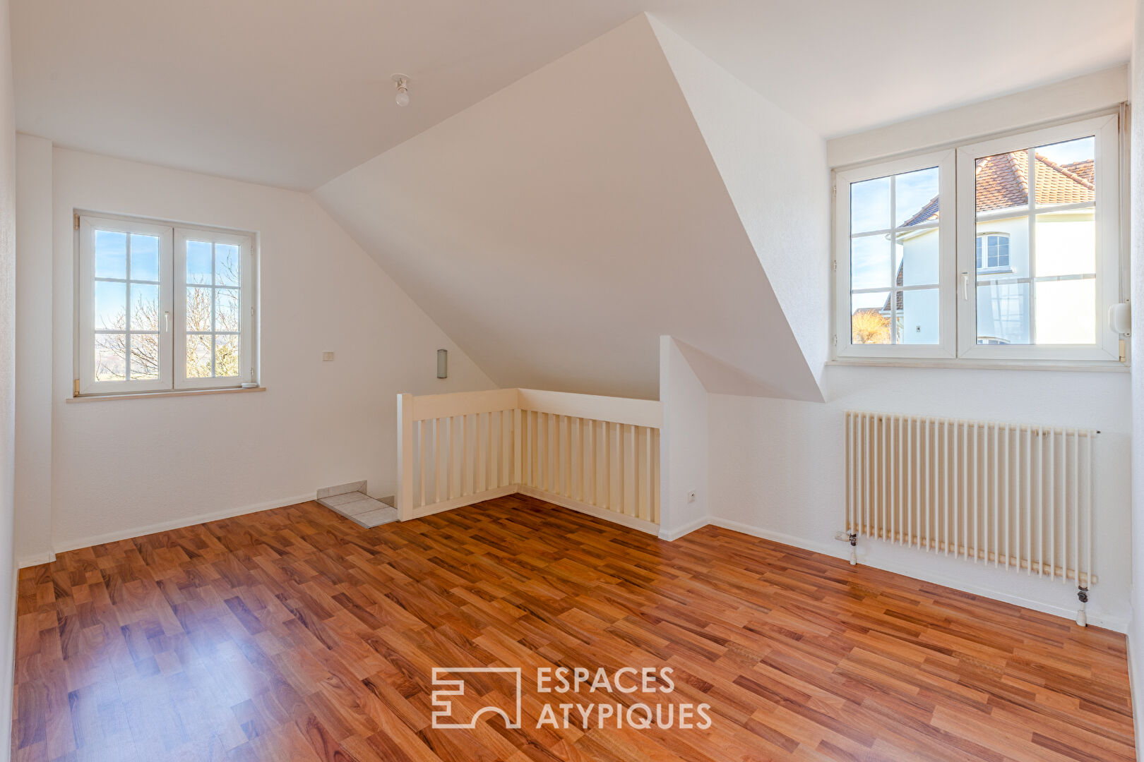 Implantée sur les hauteurs de Leymen, cette maison individuelle offre une surface habitable de 122 m² et prend place sur un terrain de 504 m². Son implantation dominante et sa vue dégagée participent immédiatement à l’atmosphère paisible et privilégiée des lieux.