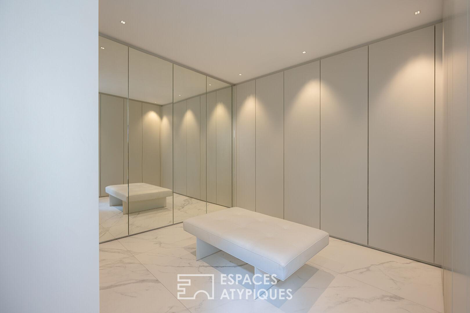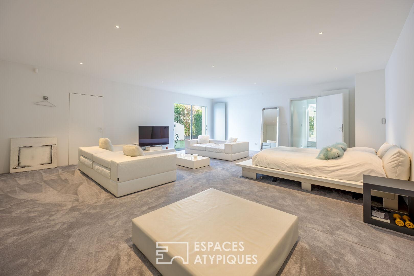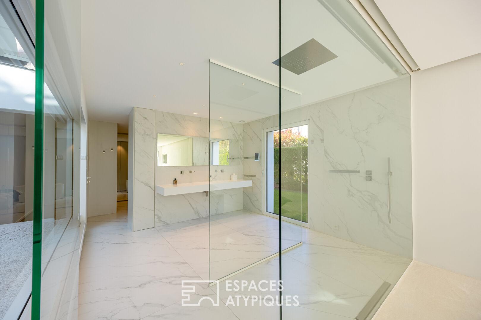 Articulé autour d’un patio minéral surplombé d’un puits de lumière, le rez-de-jardin accueille la partie nuit dont toutes les pièces bénéficient d’un accès au jardin. Elle comprend une salle d’eau et quatre chambres dont une très généreuse de 55 m². La suite parentale a été conçue dans un esprit chambre d’hôtel et s’ouvre sur un généreux dressing sur mesure. La salle d’eau habillée de marbre marque la transition vers la chambre et sa vue sur la verdure.