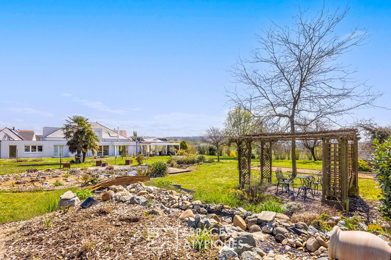 Nichée au calme d’une impasse résidentielle, cette maison contemporaine de 416 m² prend place sur un terrain paysager de 52 ares, offrant un cadre de vie privilégié mêlant confort, volumes généreux et prestations bien-être. Dotée d’un espace détente intérieur avec piscine, spa et sauna, de deux terrasses orientées est et ouest dont l’une équipée d’une pergola bioclimatique, ainsi que d’un vaste jardin arboré avec verger et bassin naturel, cette propriété développe une atmosphère rare sur le marché immobilier local.