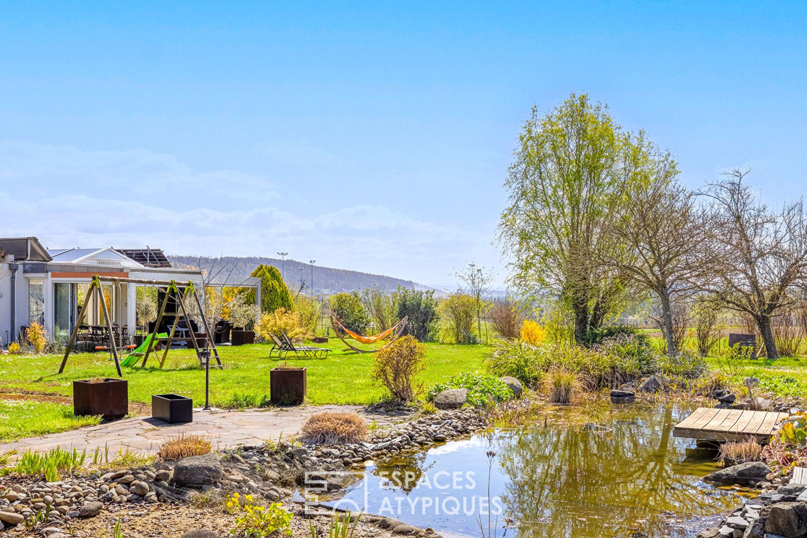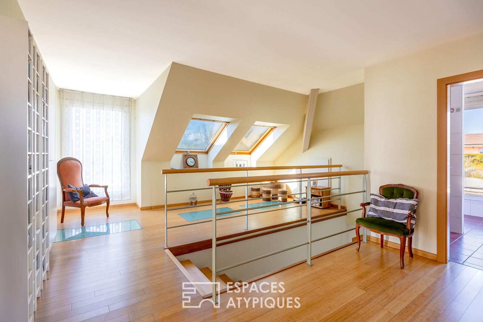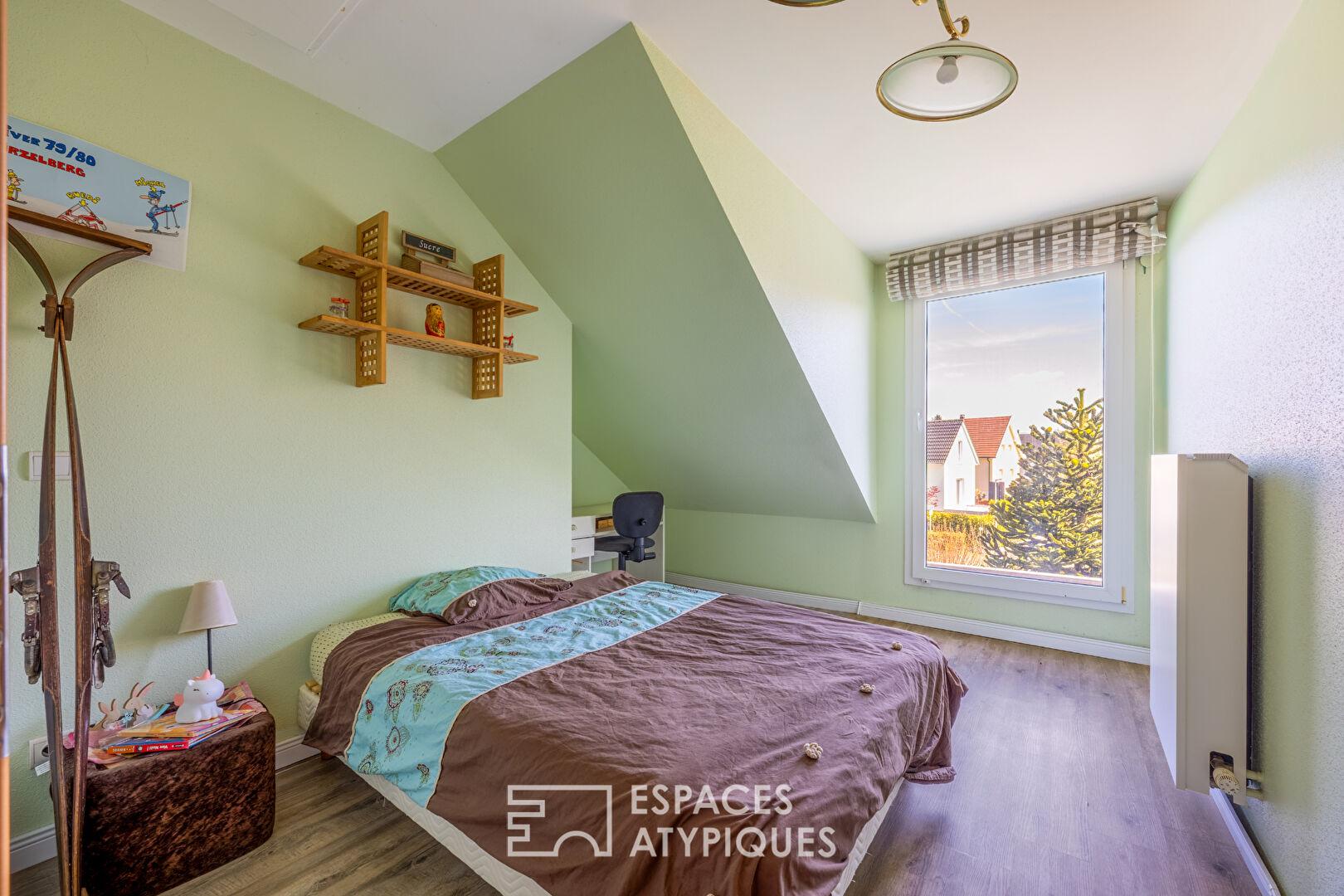 Les extérieurs offrent un environnement verdoyant particulièrement soigné, structuré autour d’un potager d’environ 2,5 ares avec serre, de 22 arbres fruitiers et d’un bassin naturel peuplé de carpes Koï, conférant au jardin un esprit à la fois nourricier et contemplatif. Les deux terrasses permettent de profiter des différentes expositions au fil de la journée. La situation en impasse assure tranquillité et intimité, tout en restant à proximité des écoles, des commerces et des principaux axes facilitant les déplacements vers l’agglomération mulhousienne.