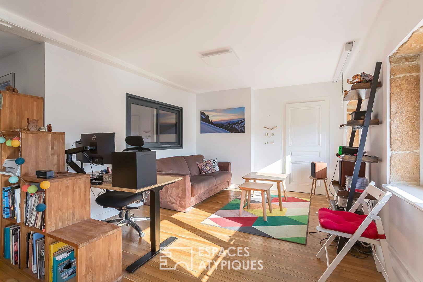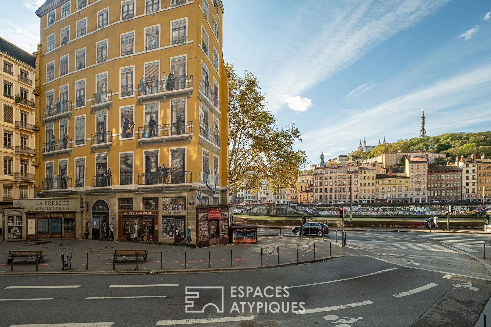 Niché au dernier étage d’un bel immeuble ancien, au coeur du quartier prisé de la Martinière, cet appartement de 104 m² a bénéficié d’une rénovation alliant cachet de l’ancien et lignes contemporaines. À deux pas du Quai Saint-Vincent, il offre le luxe rare d’un calme absolu en plein centre-ville.