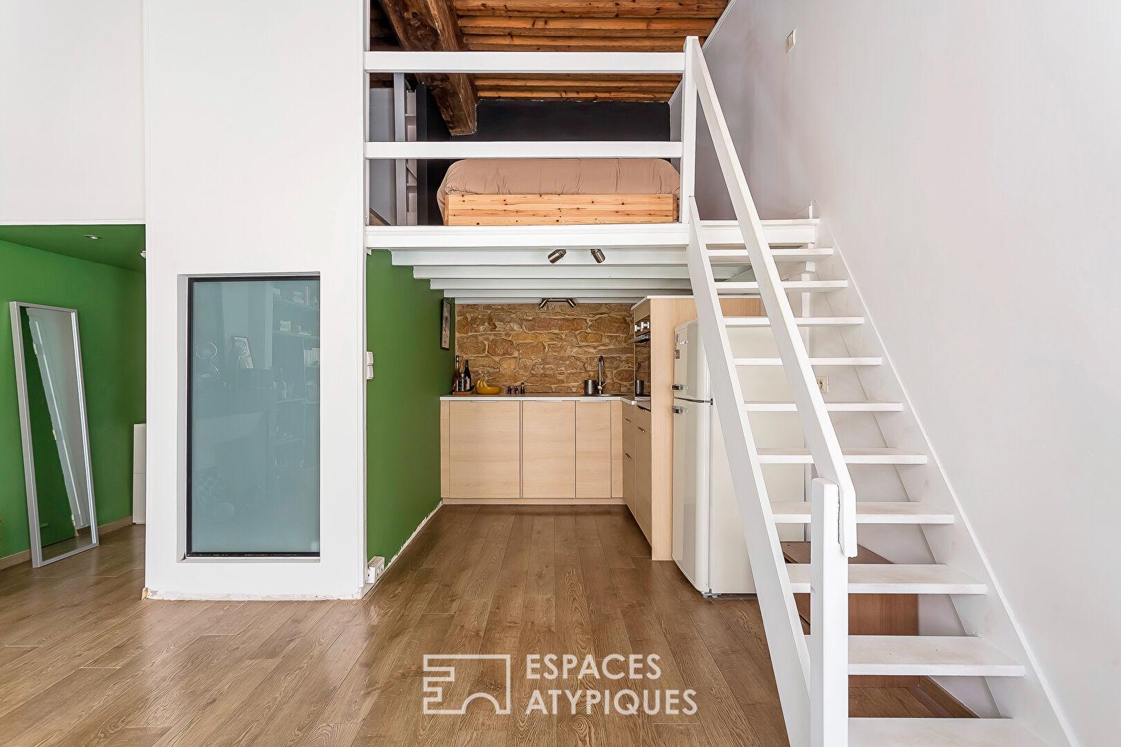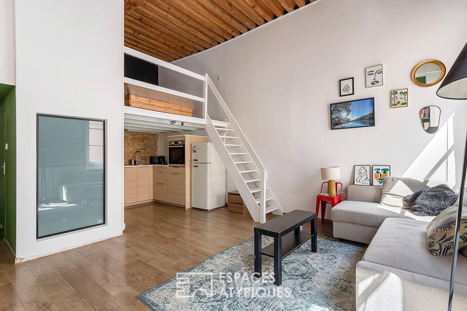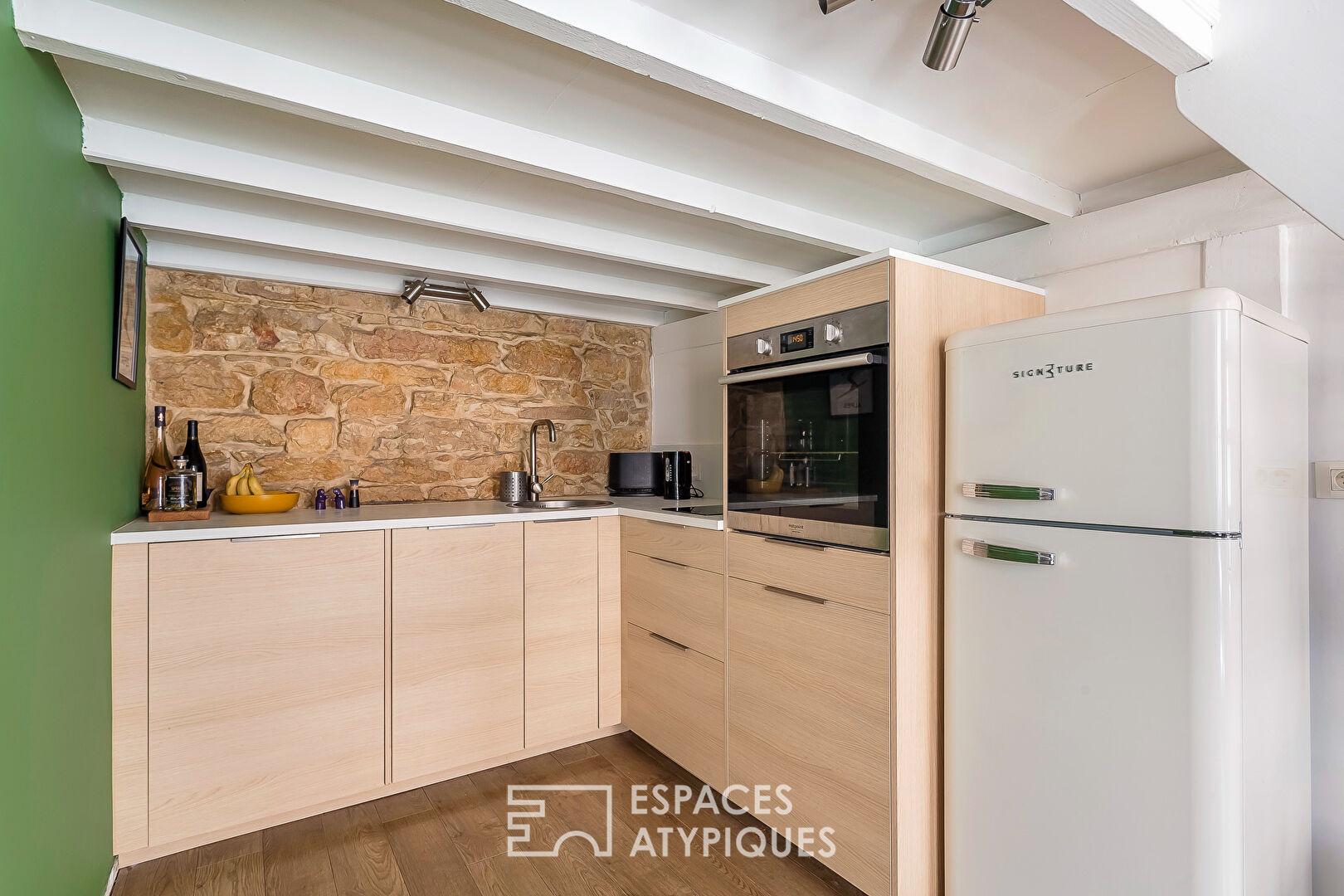 Dès l’entrée, le séjour de 24m² séduit par ses volumes et sa luminosité, grâce à deux fenêtres offrant une belle clarté naturelle. Les pierres apparentes et le plafond à la française soulignent le caractère authentique de cet appartement atypique, tandis que la cuisine ouverte et entièrement équipée s’intègre harmonieusement à l’espace de vie.