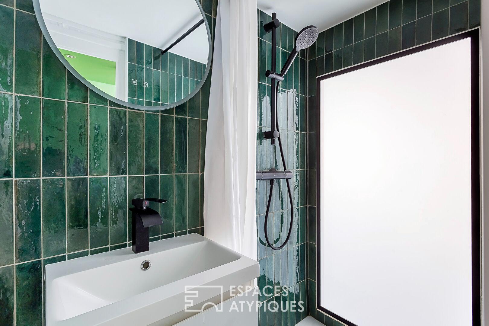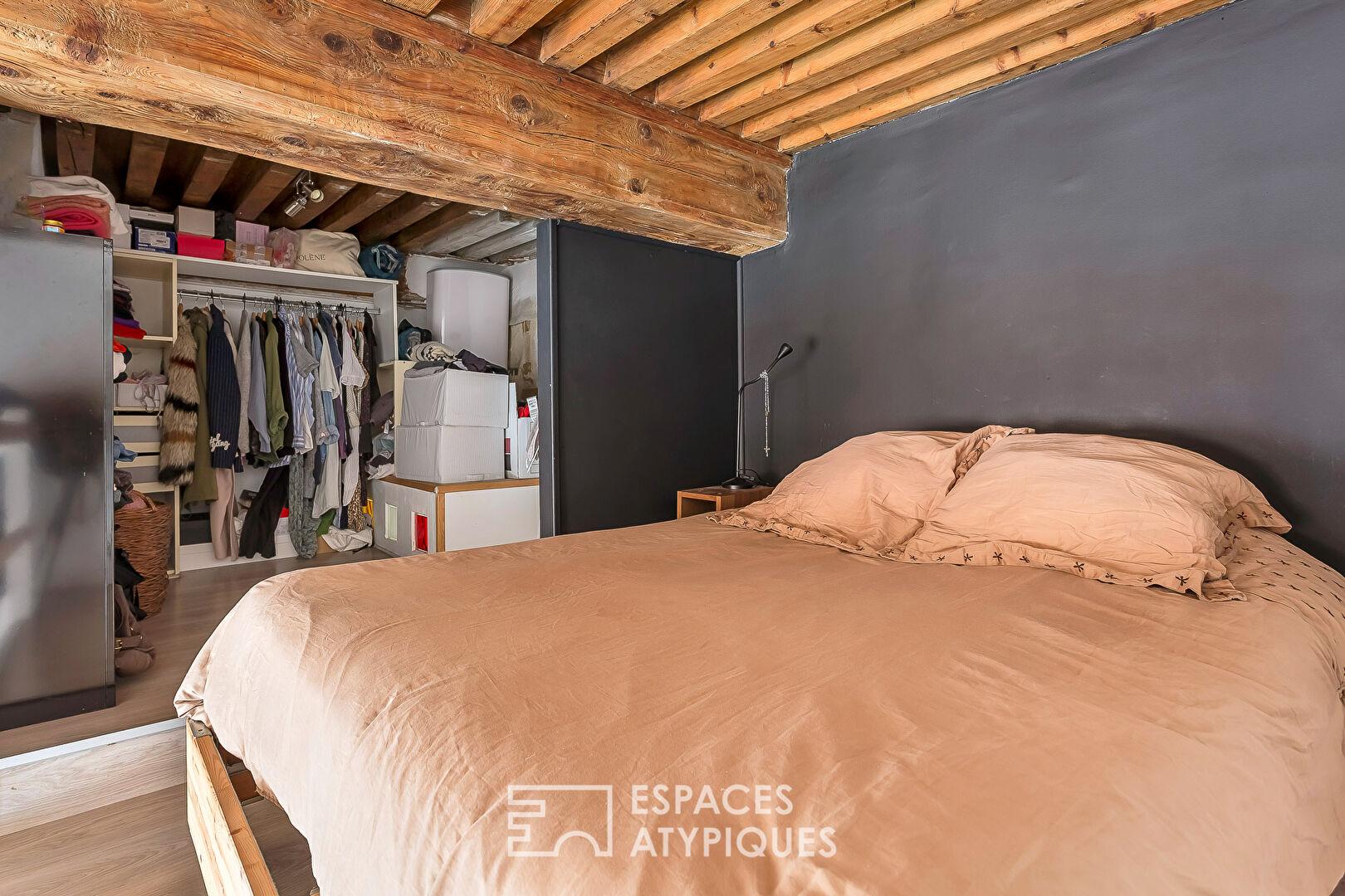 La mezzanine accueille une chambre cosy, optimisant intelligemment les surfaces. La salle d’eau, rénovée avec soin, complète l’ensemble avec fonctionnalité et modernité.