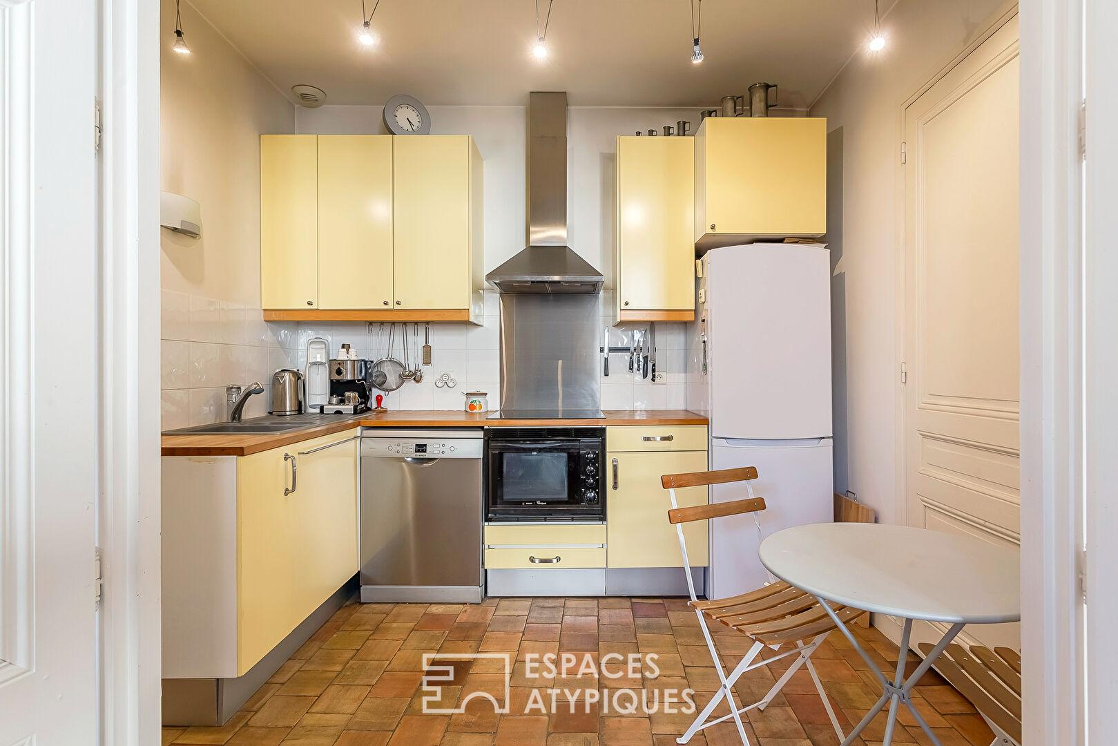 La cuisine, semi-ouverte, s’intègre avec discrétion dans cet espace de réception, offrant une circulation fluide.