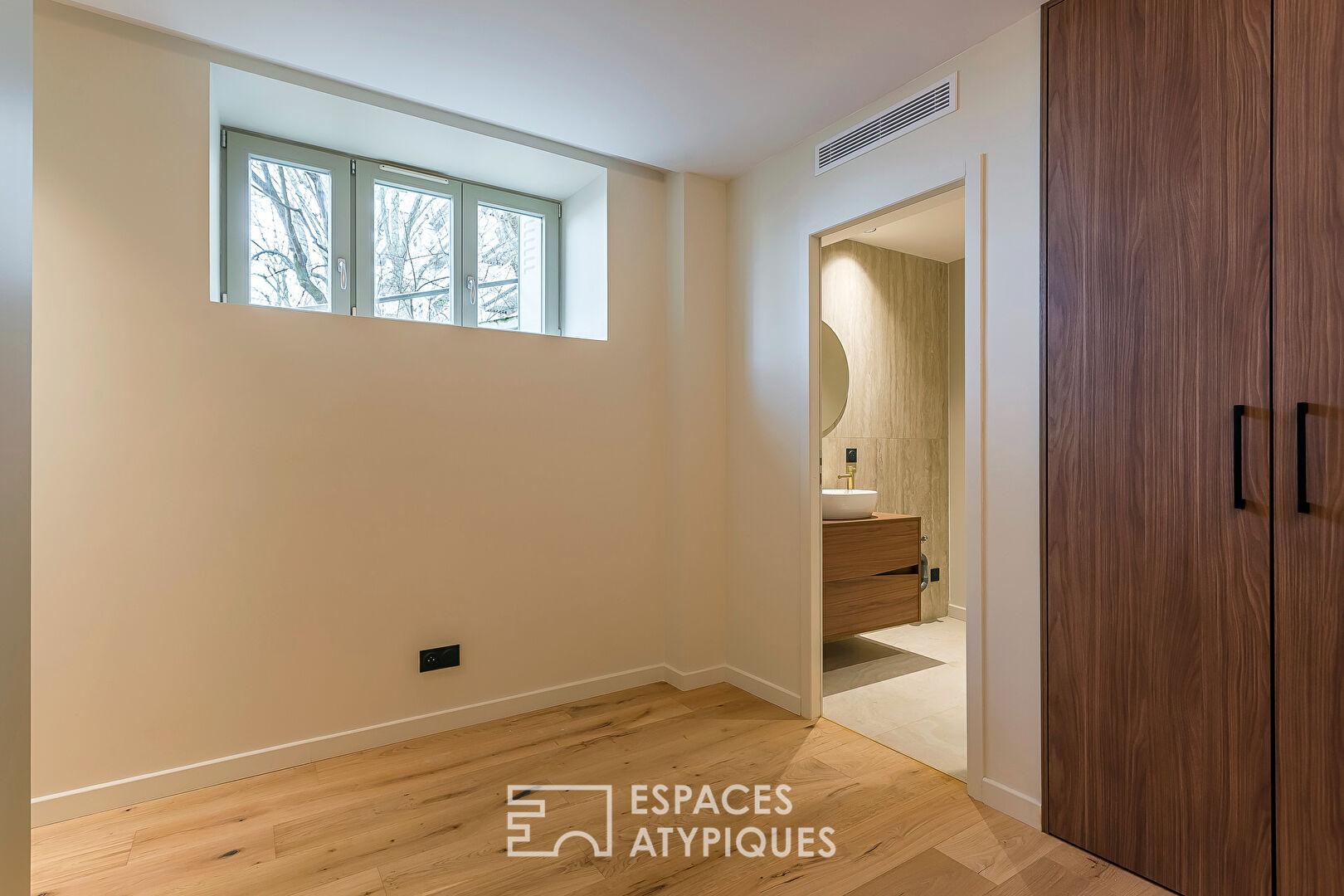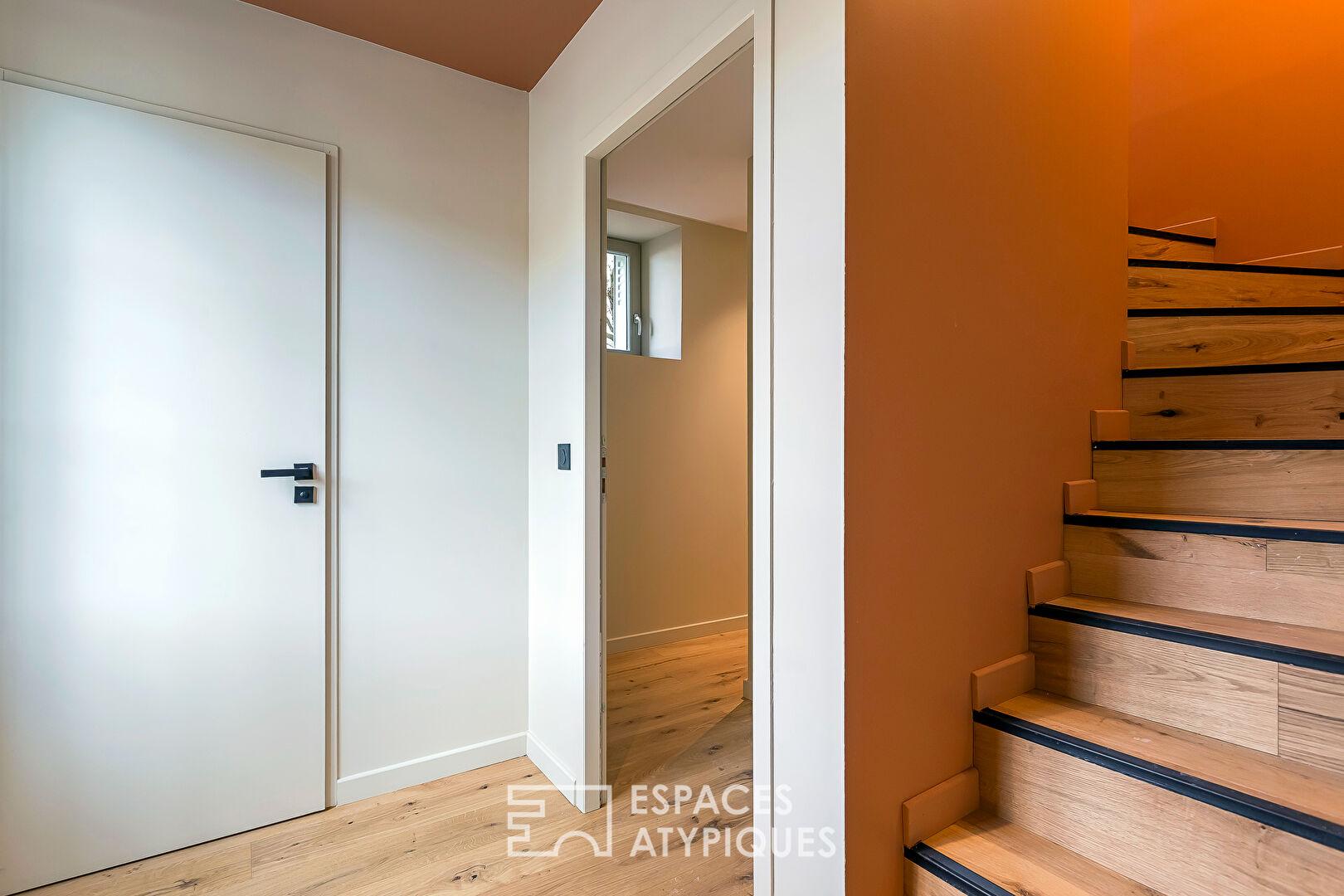 Un escalier mène à l’étage inférieur et dessert une véritable suite parentale avec dressing et salle d’eau privative.