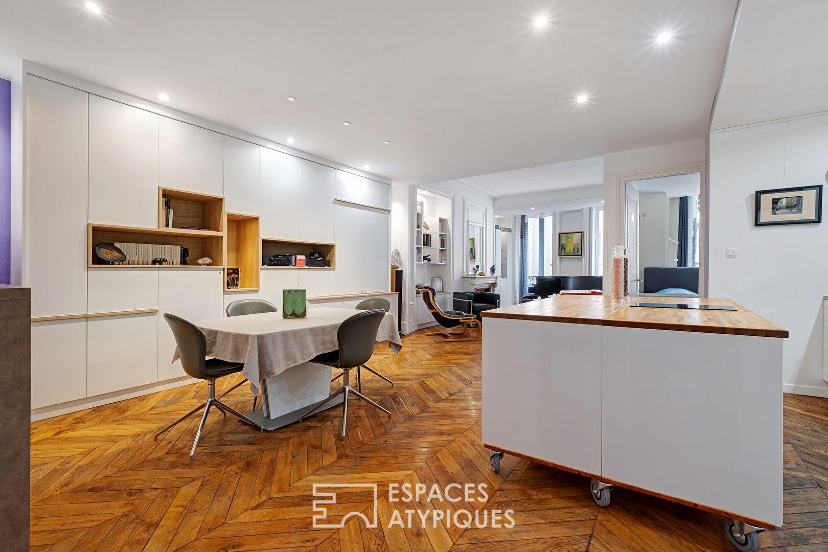 Cet appartement mêle élégamment le charme de l’ancien avec parquet en point de Hongrie, cheminées et moulures à une rénovation contemporaine épurée.