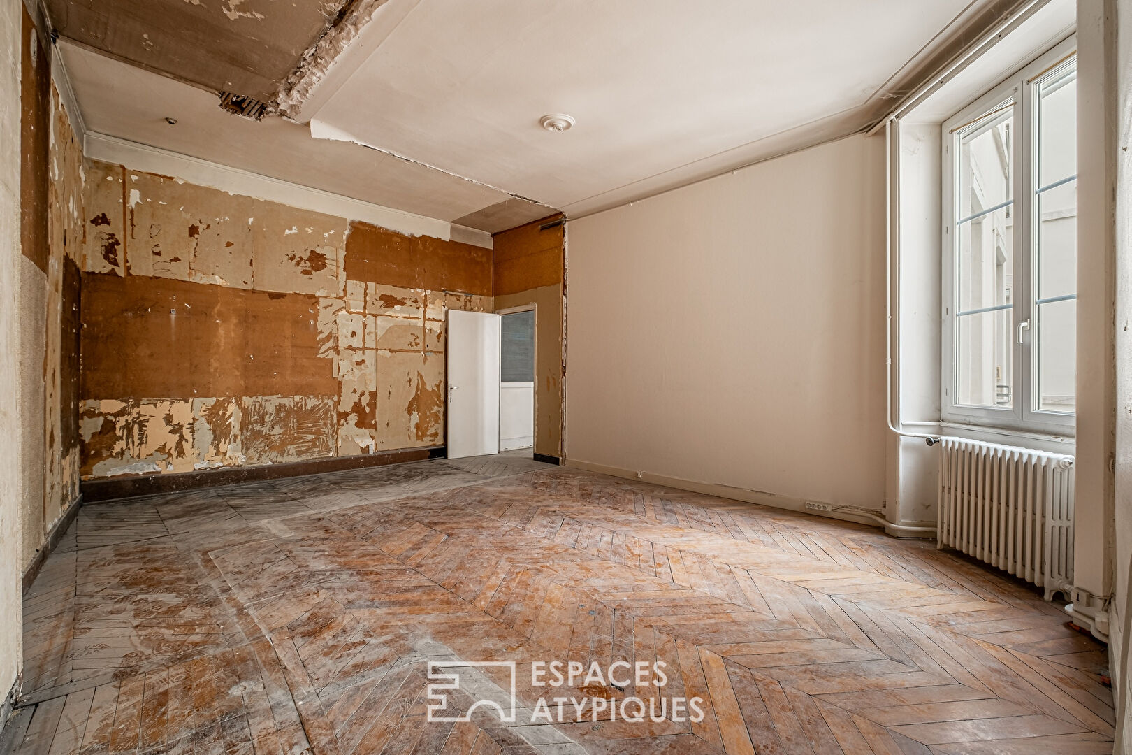 À rénover entièrement, l’appartement se compose, aujourd’hui, d’une pièce à vivre aux volumes généreux pouvant facilement accueillir un espace séjour / salle à manger avec cuisine ouverte, une chambre spacieuse, une salle d’eau et un toilette individuel.