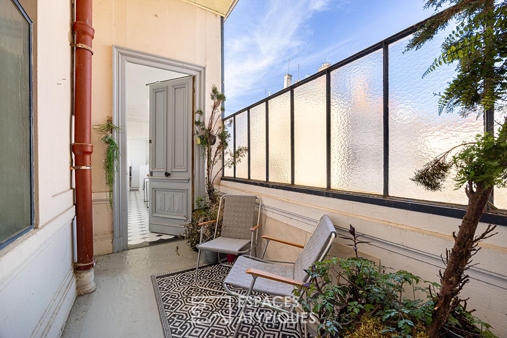 Ce lieu de vie singulier se distingue par un balcon privatif situé en amont de l’entrée, offrant un premier espace de transition exclusif avant de découvrir un intérieur où le cachet de l’ancien a été sublimé.