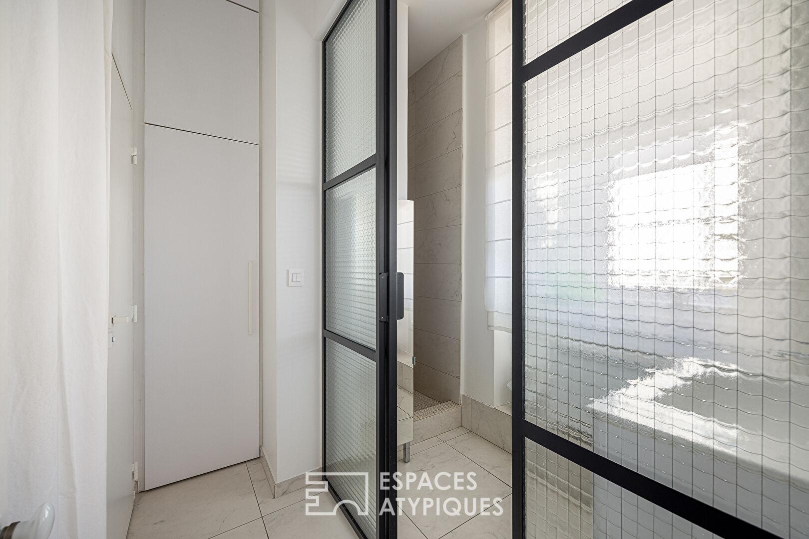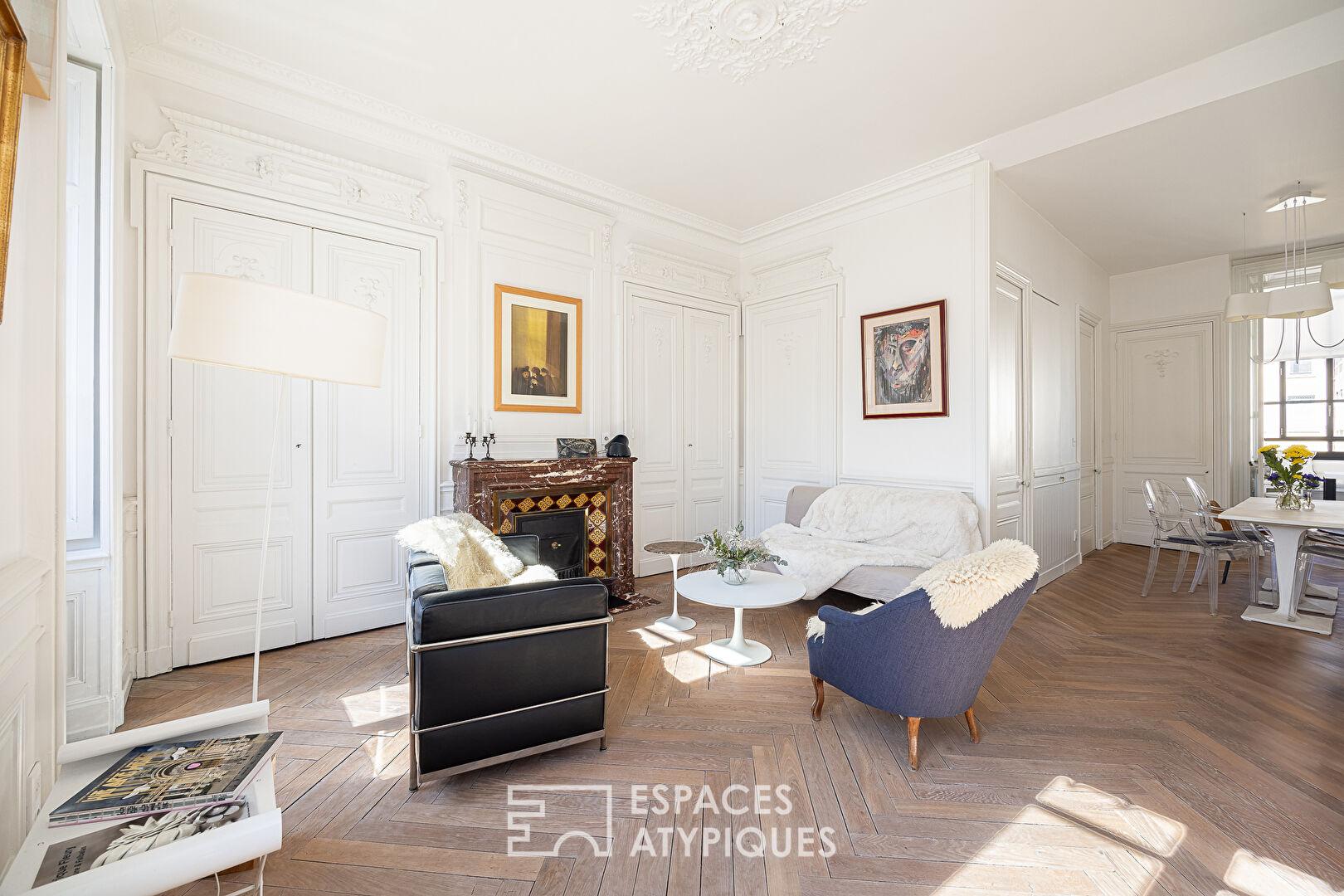L’espace de vie s’articule autour d’une pièce de réception où les moulures d’époque, les boiseries raffinées et les stylobates soulignent des volumes généreux. La lumière, omniprésente, traverse les grandes ouvertures pour venir lécher un parquet en point de Hongrie parfaitement restauré. La cuisine dînatoire, véritable pièce maîtresse, dispose d’une verrière XXL qui apporte une dimension loft et industrielle à cet ensemble bourgeois.