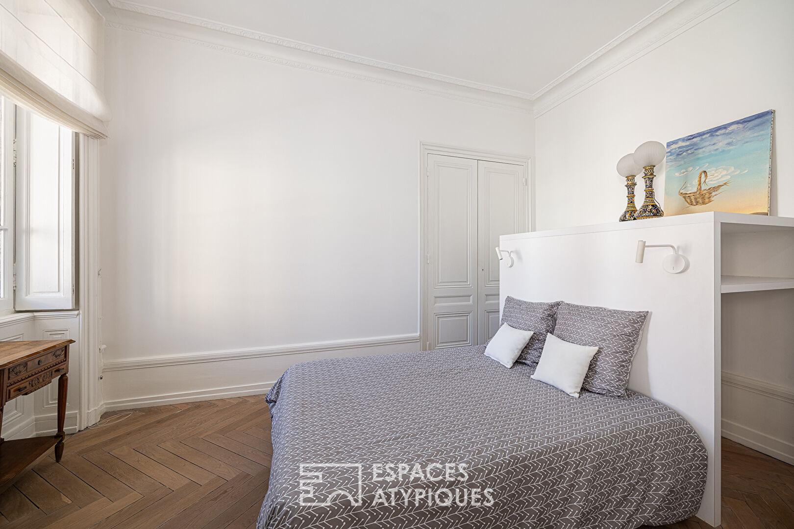 Côté nuit, l’agencement a été pensé pour l’intimité et le confort avec deux chambres spacieuses. L’une d’elles profite d’une cheminée en marbre conservée, tandis que deux salles d’eau contemporaines aux lignes épurées complètent ce bien. De nombreux rangements sur mesure ont été intégrés avec discrétion pour préserver la fluidité des lignes architecturales.