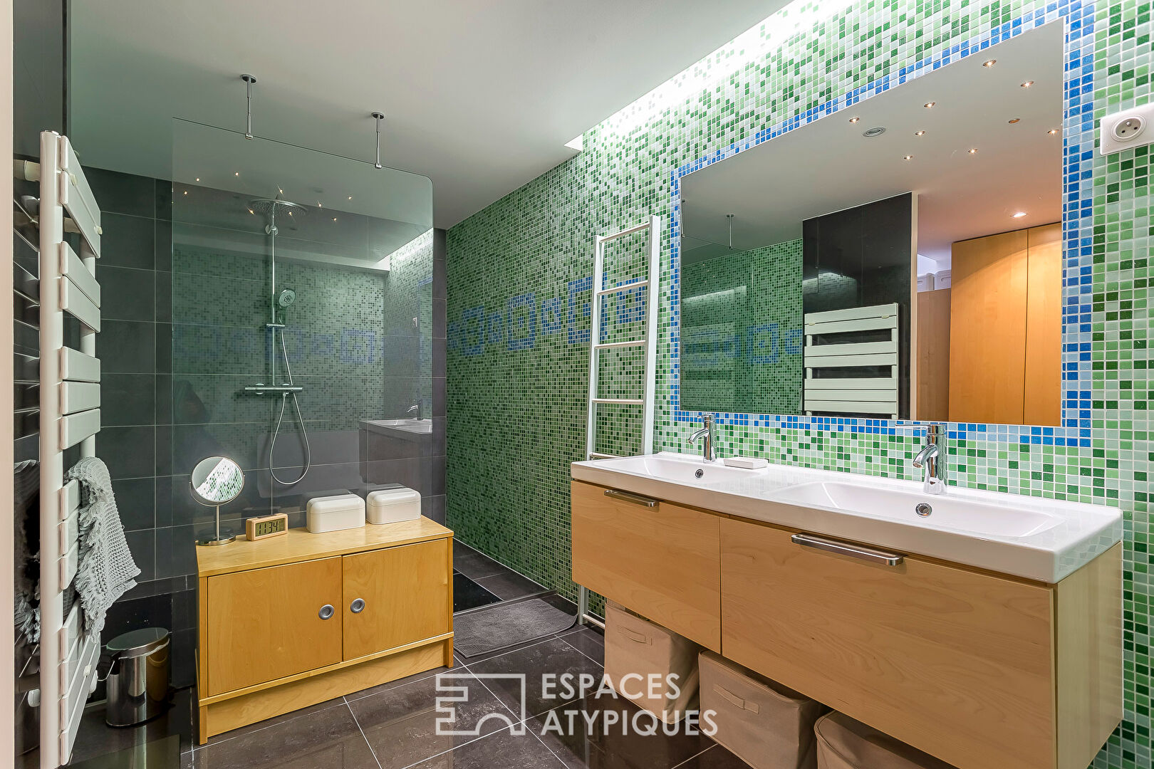 deux chambres supplémentaires dont une suite parentale sur deux niveaux avec dressing et salle d’eau complète ce bien unique et atypique.