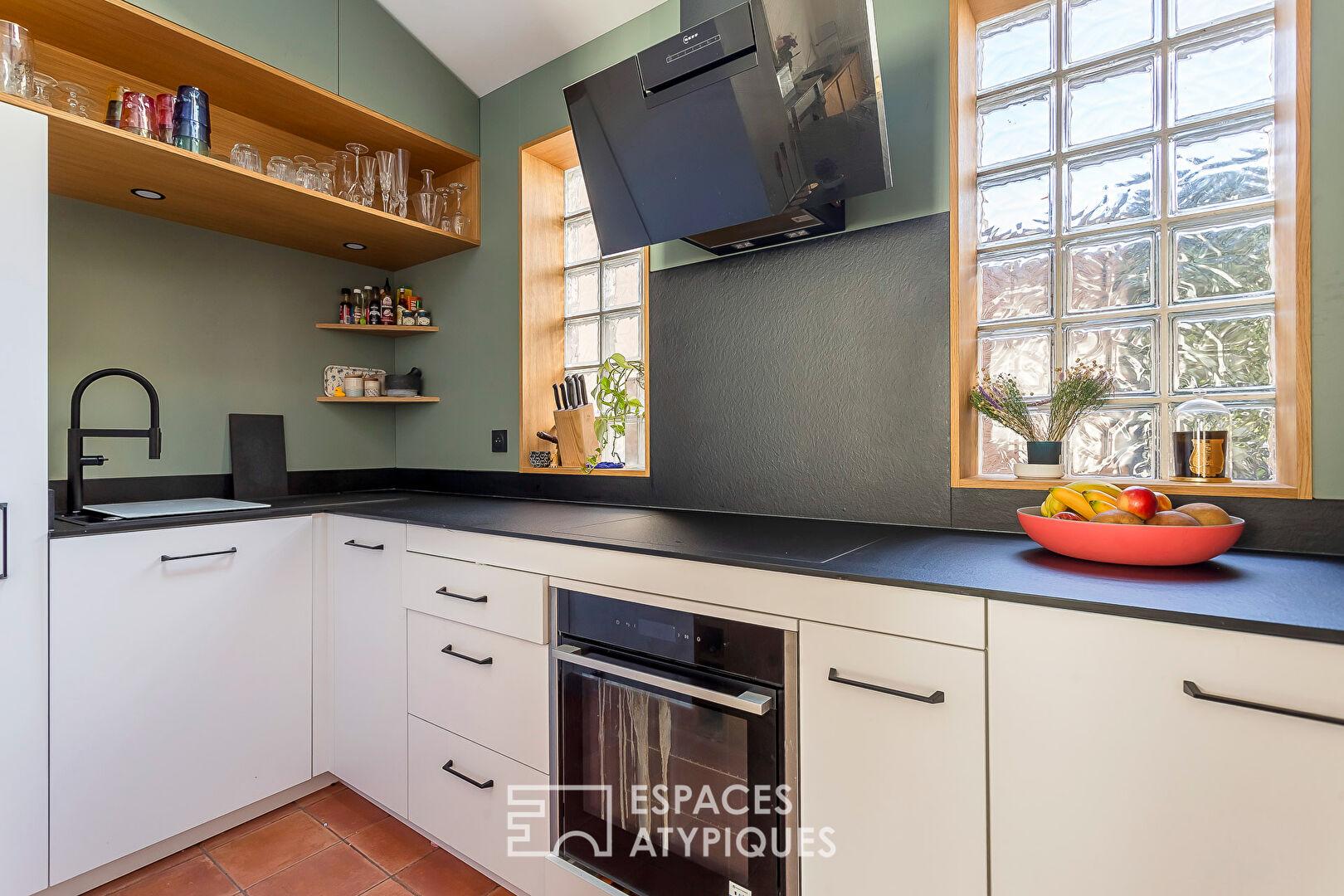 Au rez-de-chaussée, une entrée avec WC dessert un séjour lumineux et chaleureux, ouvert sur une cuisine contemporaine conviviale.