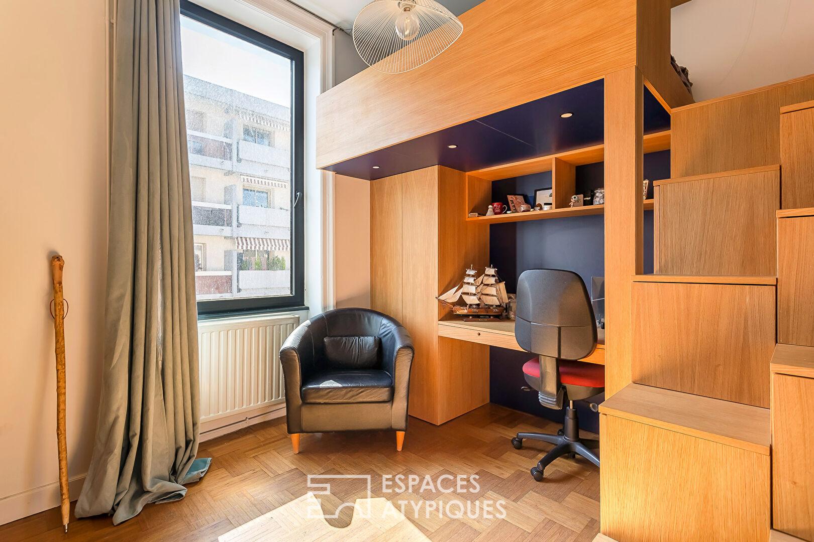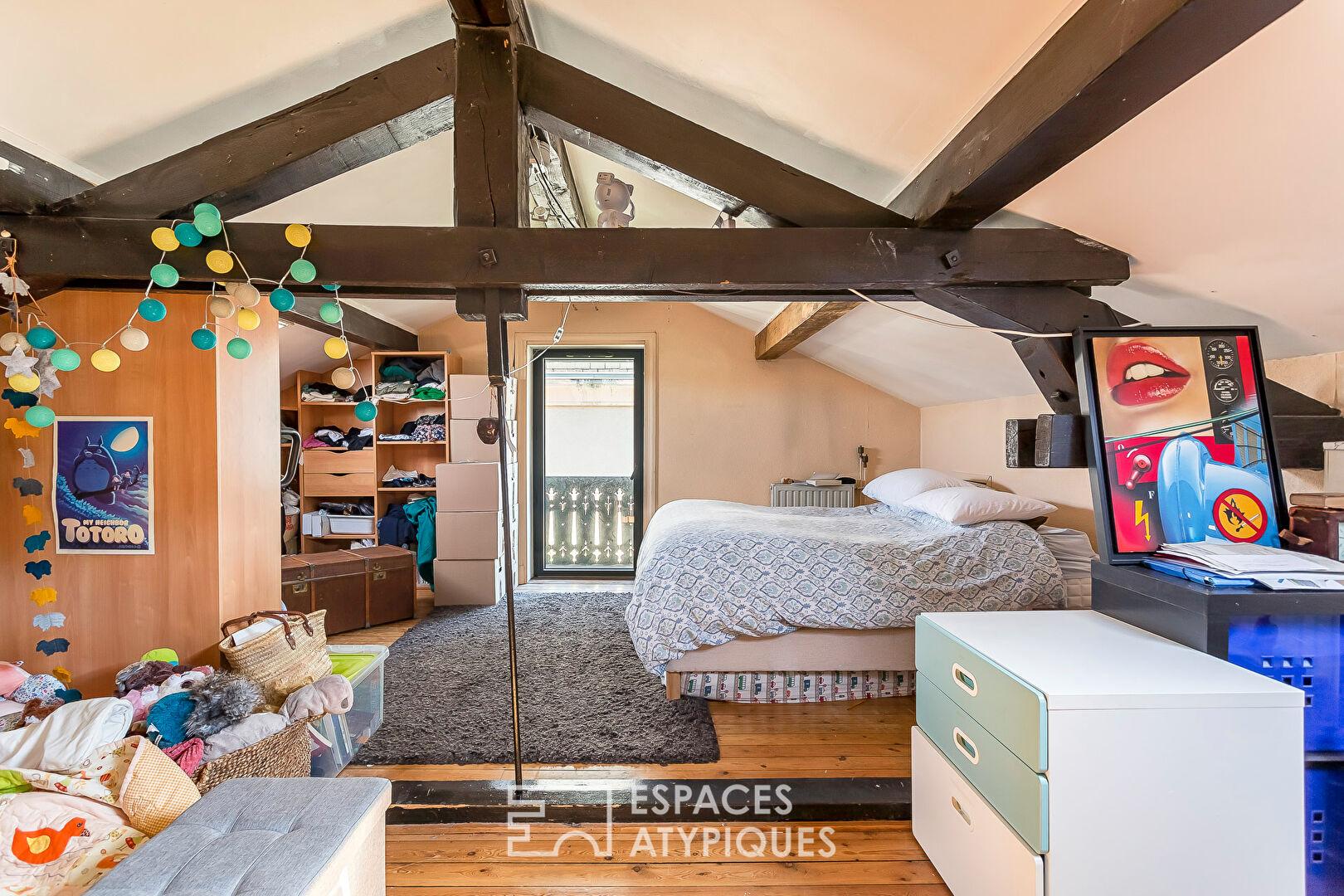 Au dernier niveau, une grande chambre parentale de 18 m² avec poutres apparentes, un balcon offre un espace intime et privilégié.