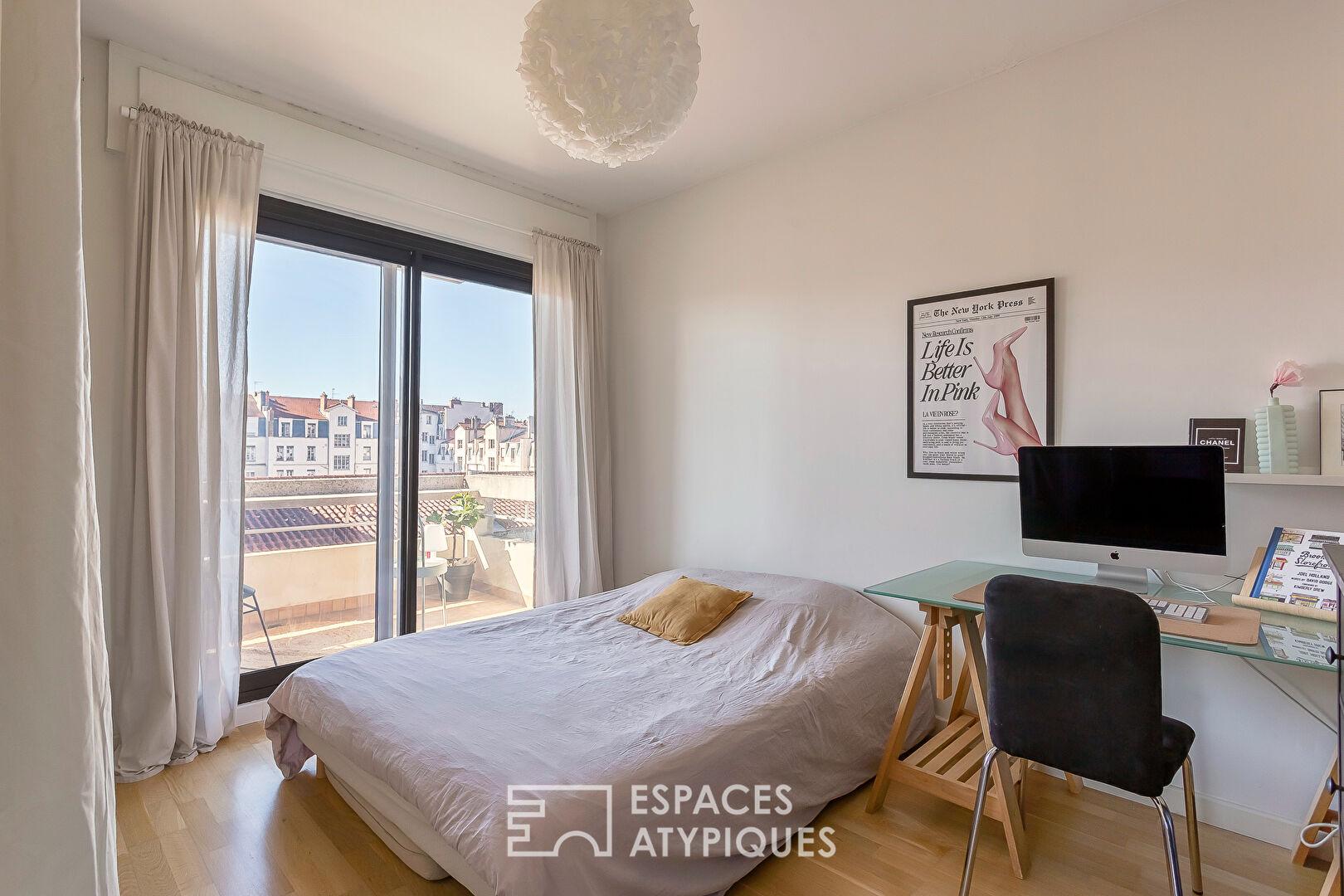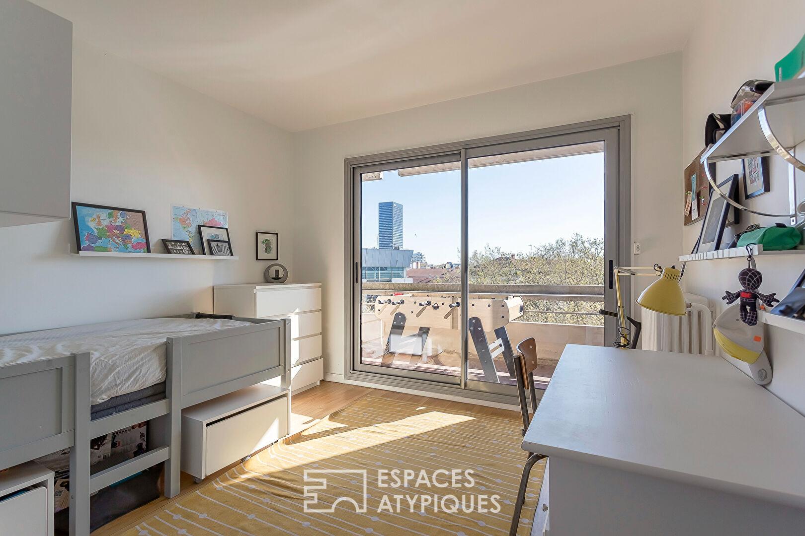 À l’extérieur, une terrasse de 32 m² prolonge harmonieusement les espaces de vie. Véritable atout rare en milieu urbain, elle offre un cadre privilégié pour profiter pleinement d’une vue dominante et dégagée, dans un environnement paisible.