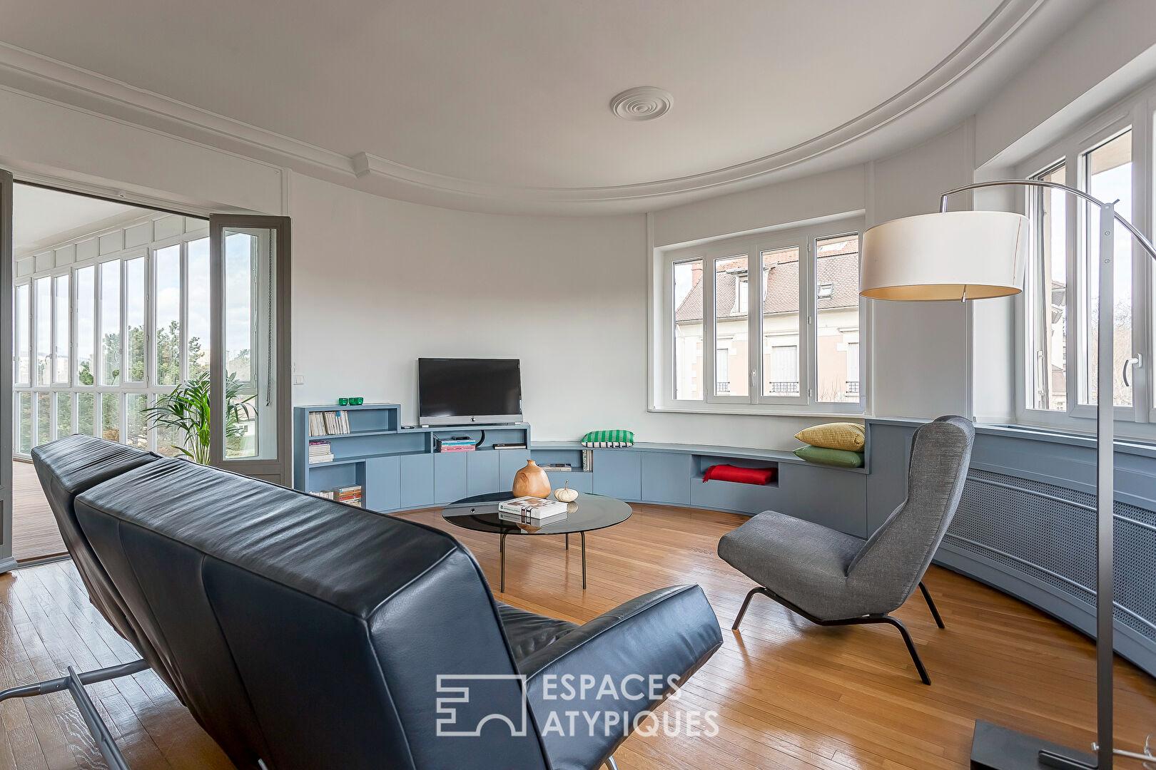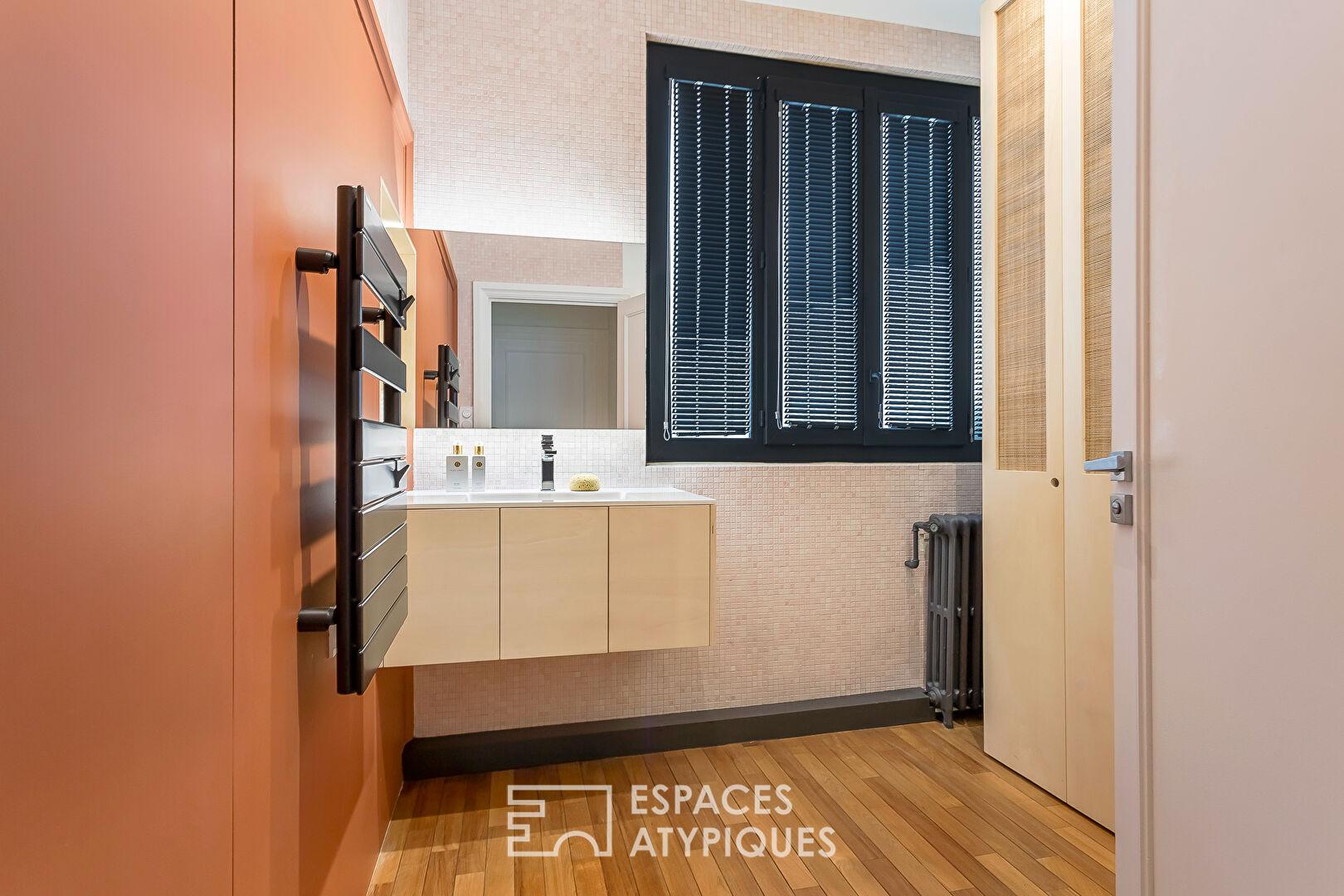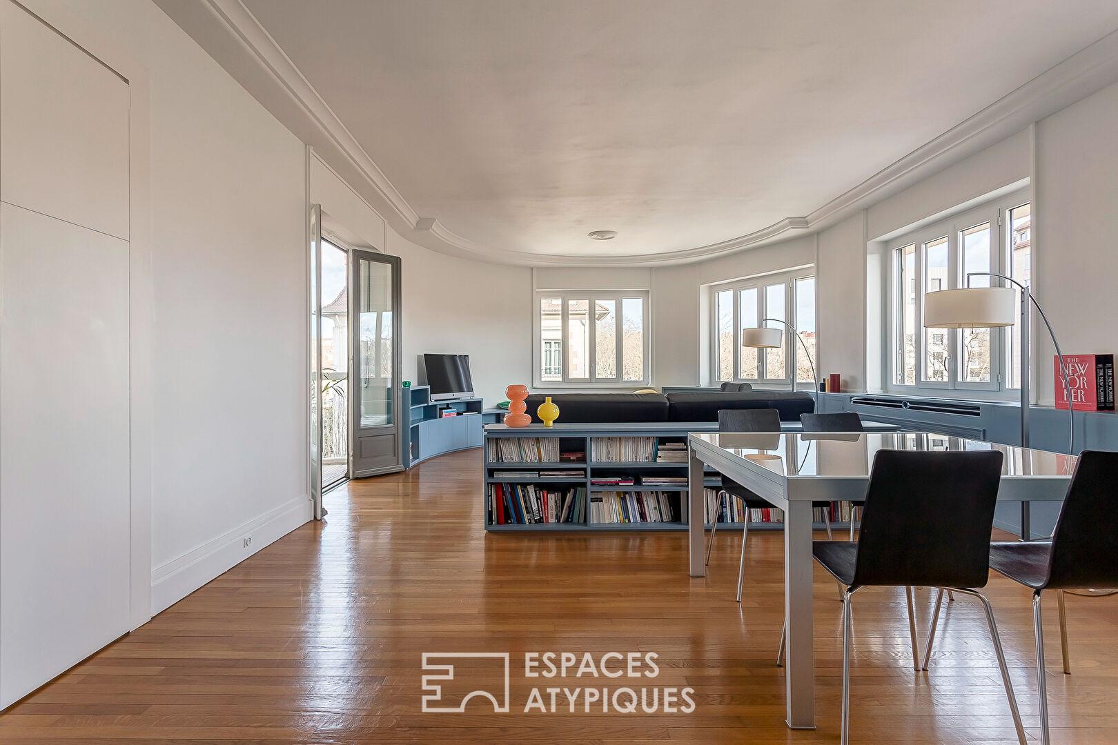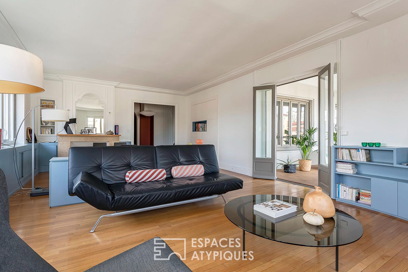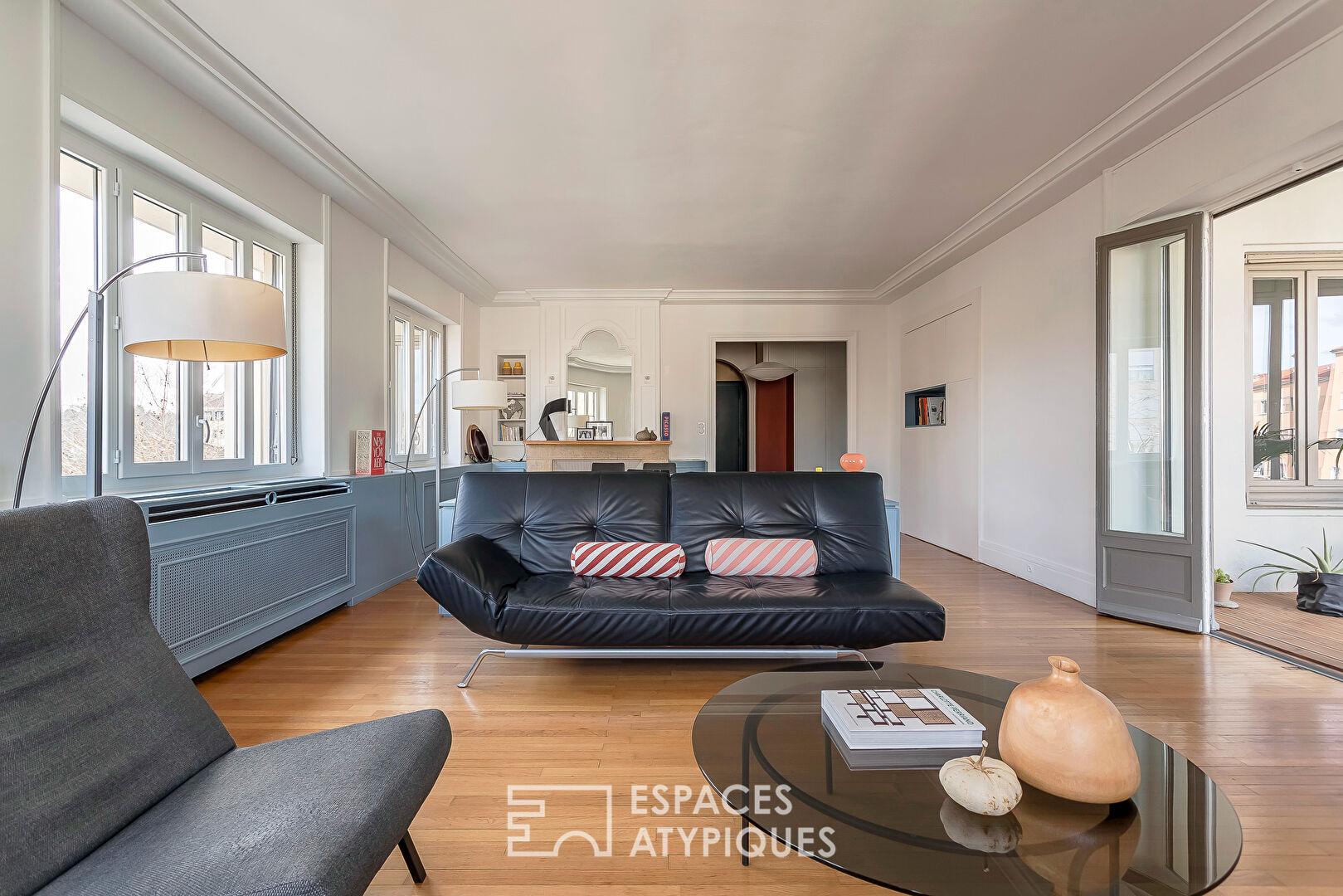 Situé boulevard de la Croix-Rousse, à proximité de l’ensemble des commodités, cet appartement de 140 m² entièrement réhabilité par un architecte prend place au 5e étage avec ascenseur d’un immeuble Art Déco.