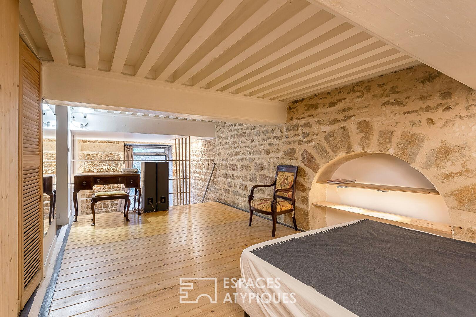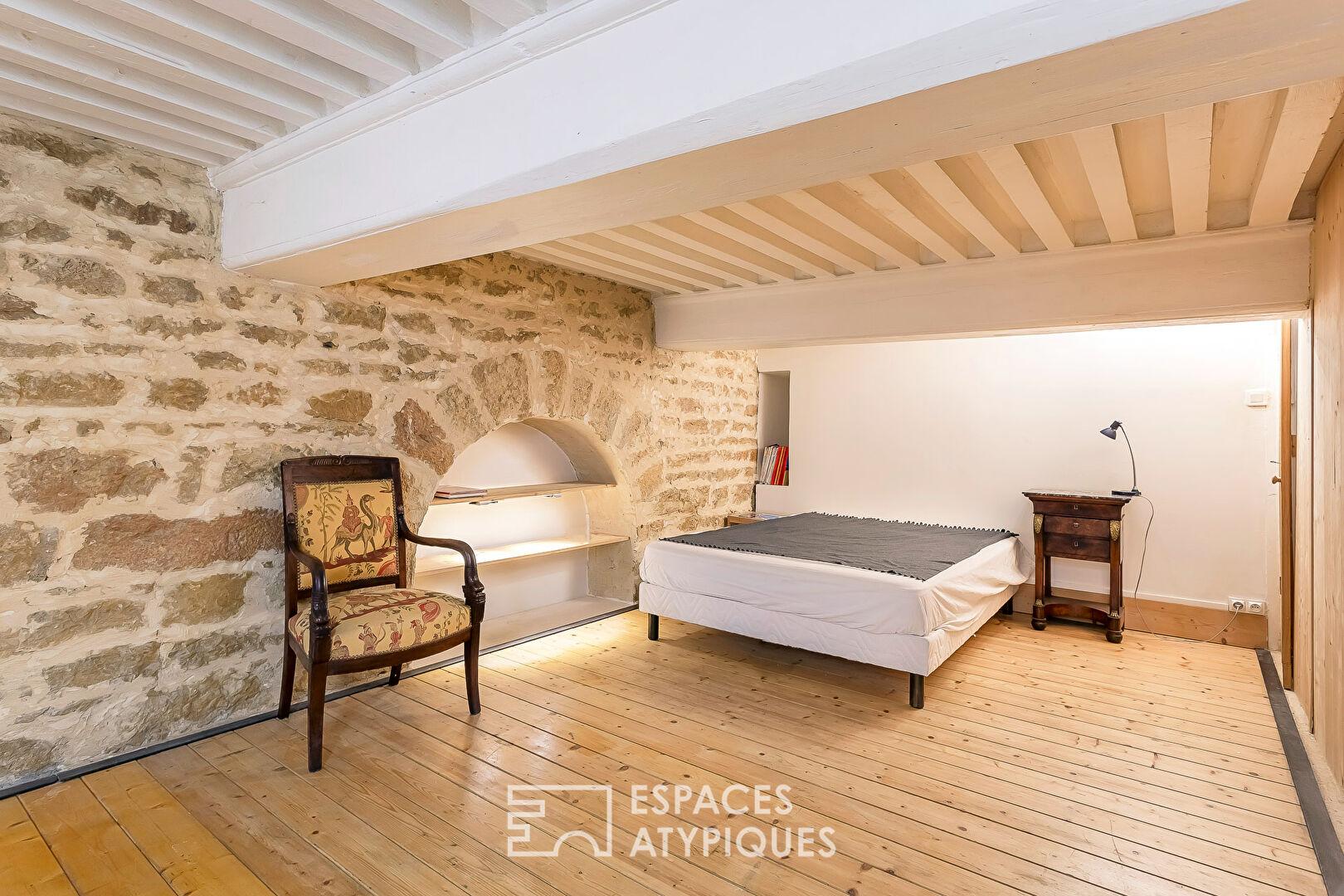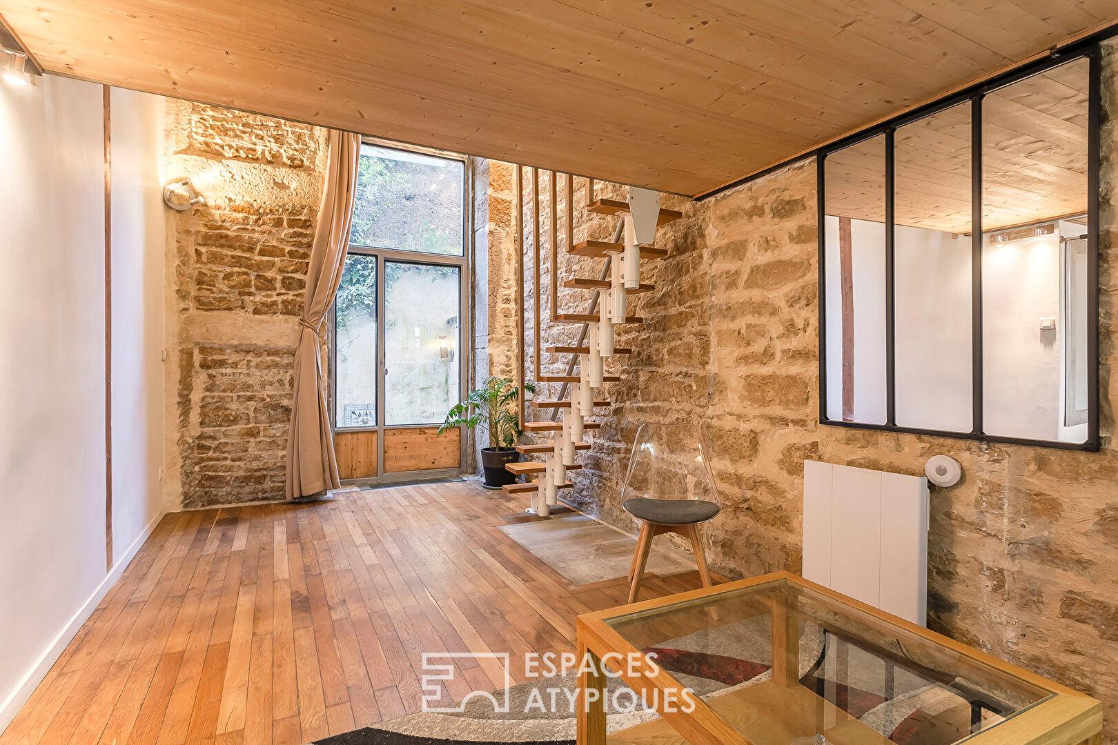 L’espace principal dévoile de beaux volumes sublimés par les codes du canut : hauteur sous plafond, cheminée d’époque et parquet ancien. Le séjour avec cuisine ouverte, entièrement équipée, compose un lieu de vie convivial et lumineux. Un second salon, plus intimiste, prolonge les espaces et offre un accès direct à la terrasse. À l’étage, un espace parental d’environ 30 m² accueille une chambre, un bureau, un dressing et une salle d’eau, formant un cocon indépendant et fonctionnel.