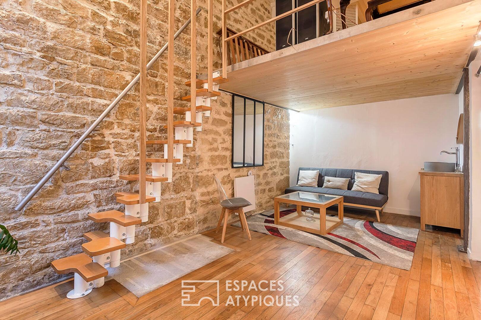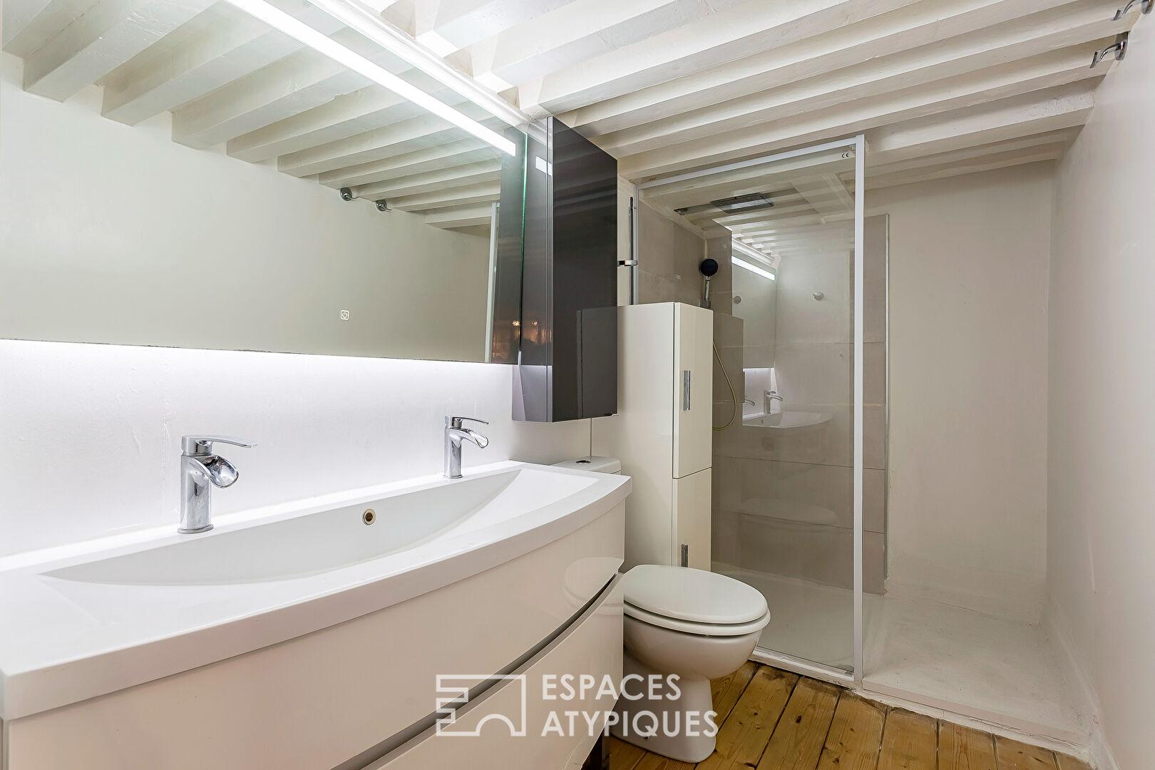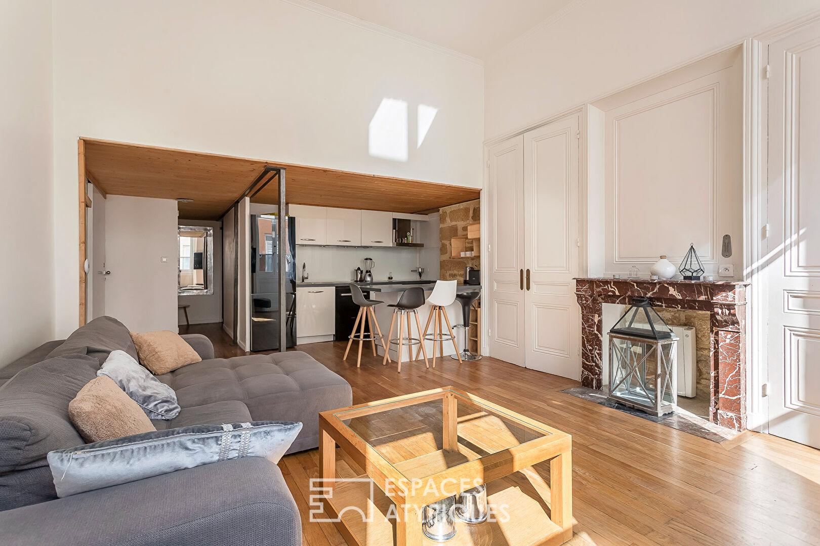 L’espace principal dévoile de beaux volumes sublimés par les codes du canut : hauteur sous plafond, cheminée d’époque et parquet ancien. Le séjour avec cuisine ouverte, entièrement équipée, compose un lieu de vie convivial et lumineux. Un second salon, plus intimiste, prolonge les espaces et offre un accès direct à la terrasse. À l’étage, un espace parental d’environ 30 m² accueille une chambre, un bureau, un dressing et une salle d’eau, formant un cocon indépendant et fonctionnel.