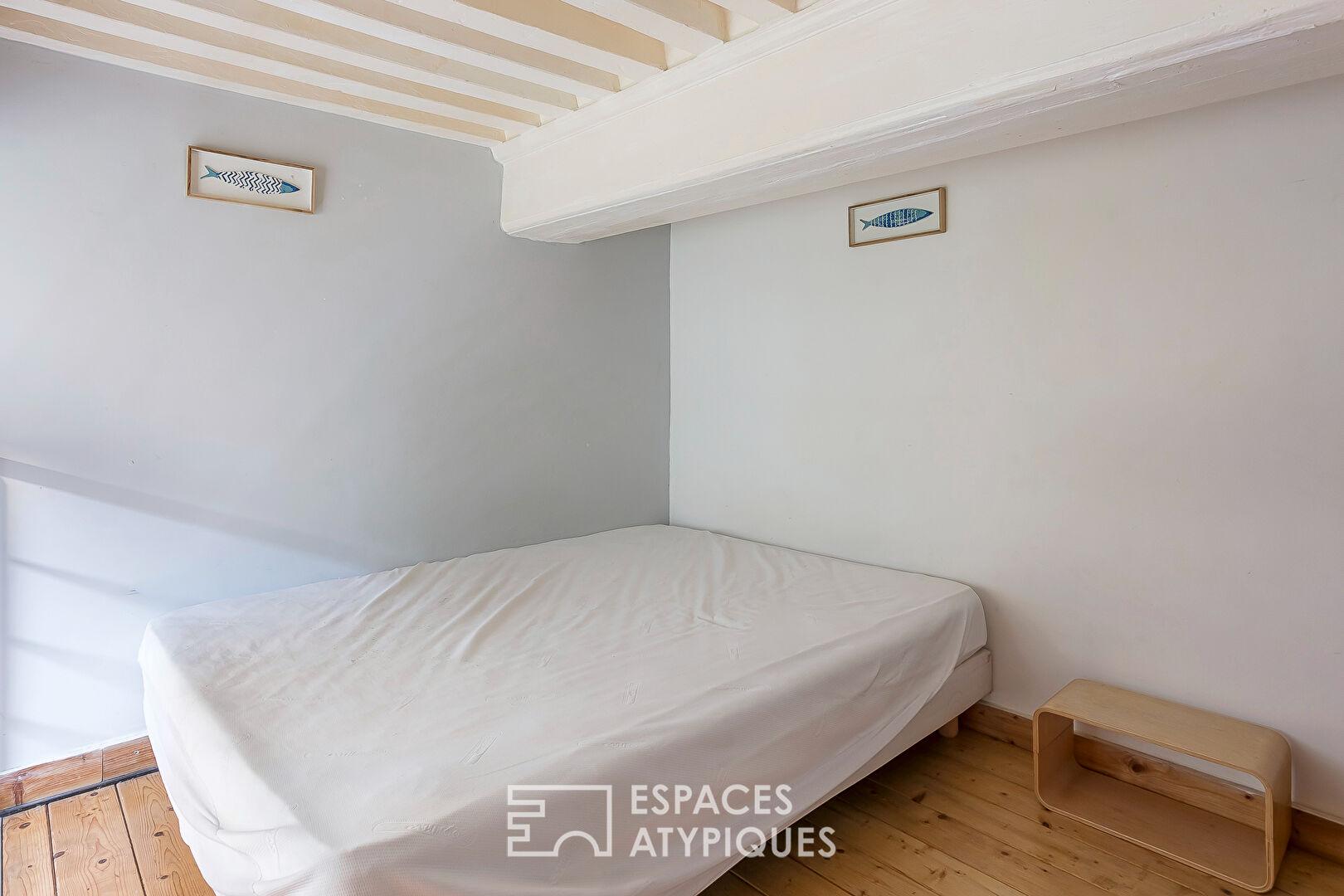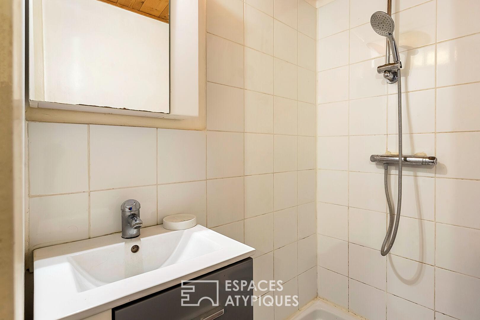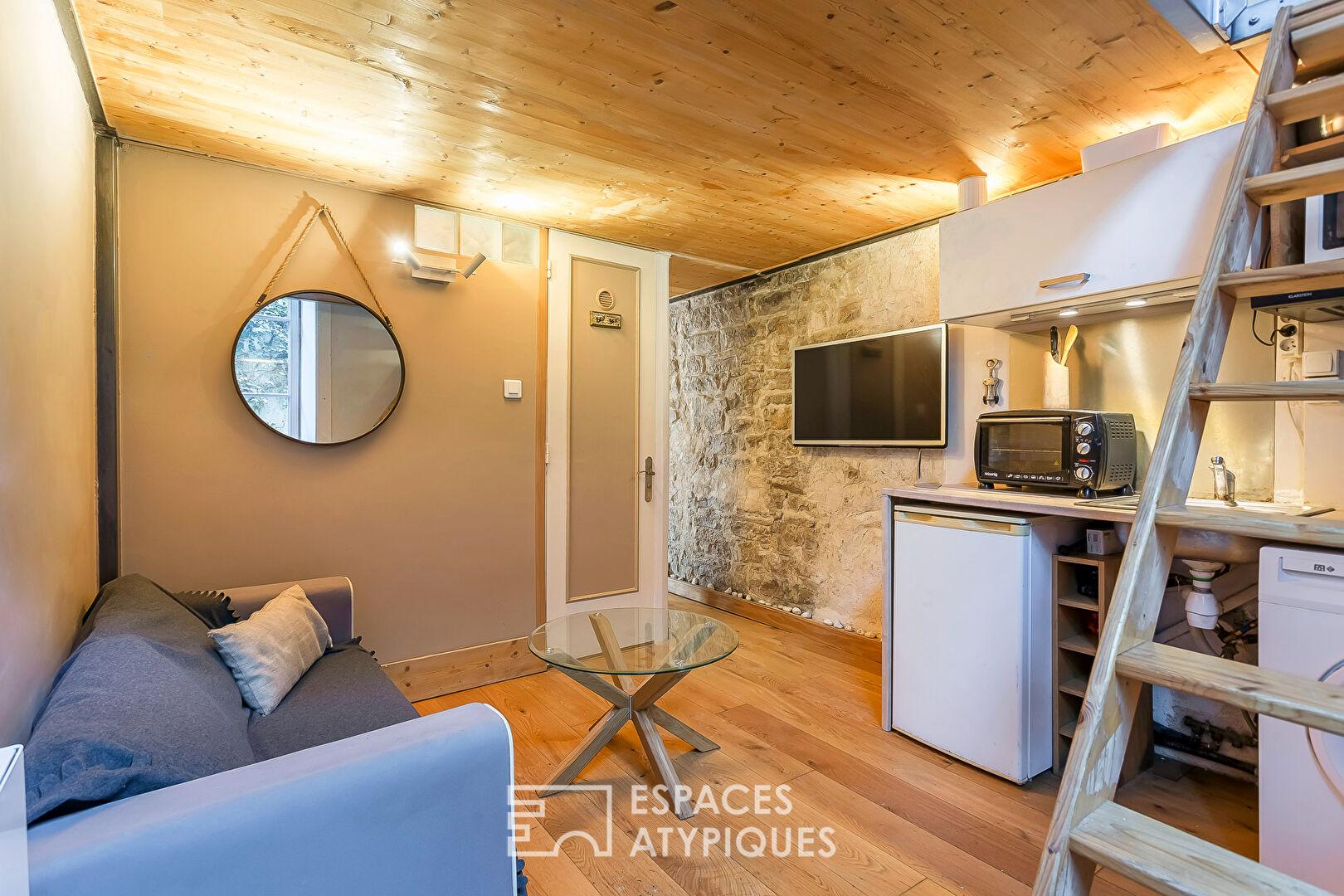 Un studio indépendant, pouvant facilement être intégré à l’appartement, comprend une pièce de vie avec cuisine ouverte, une salle d’eau avec WC et une chambre en mezzanine, idéal pour un projet locatif ou une activité indépendante.