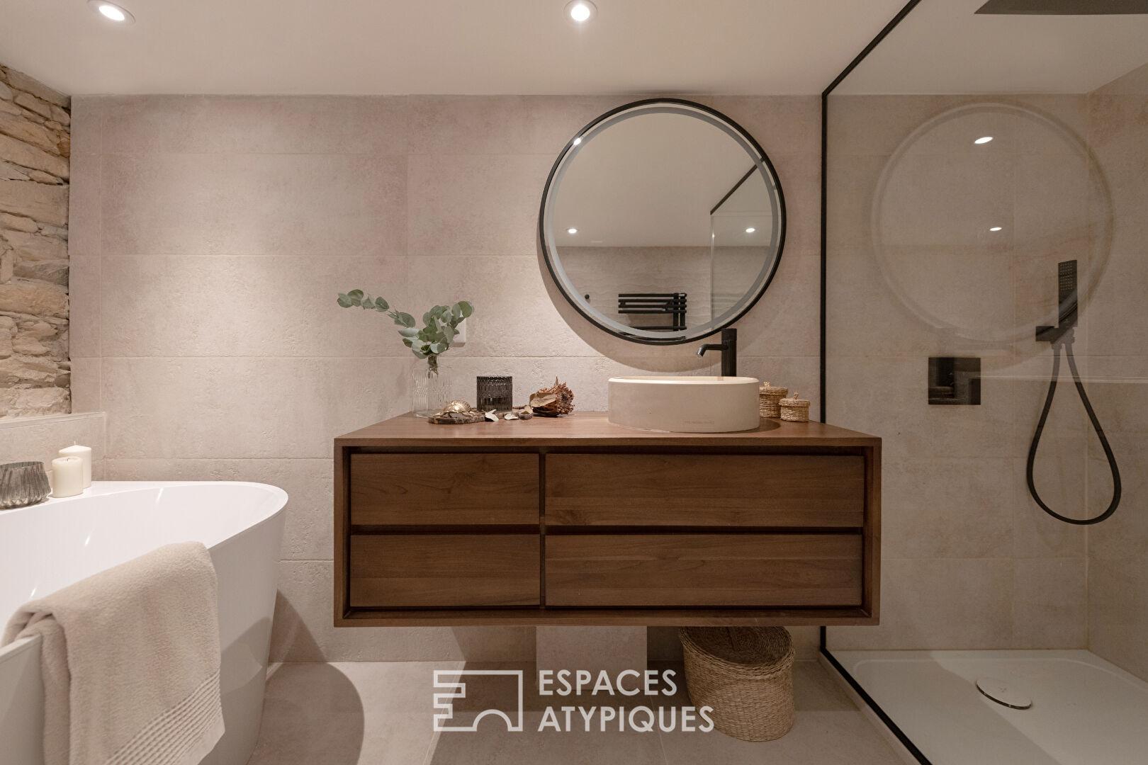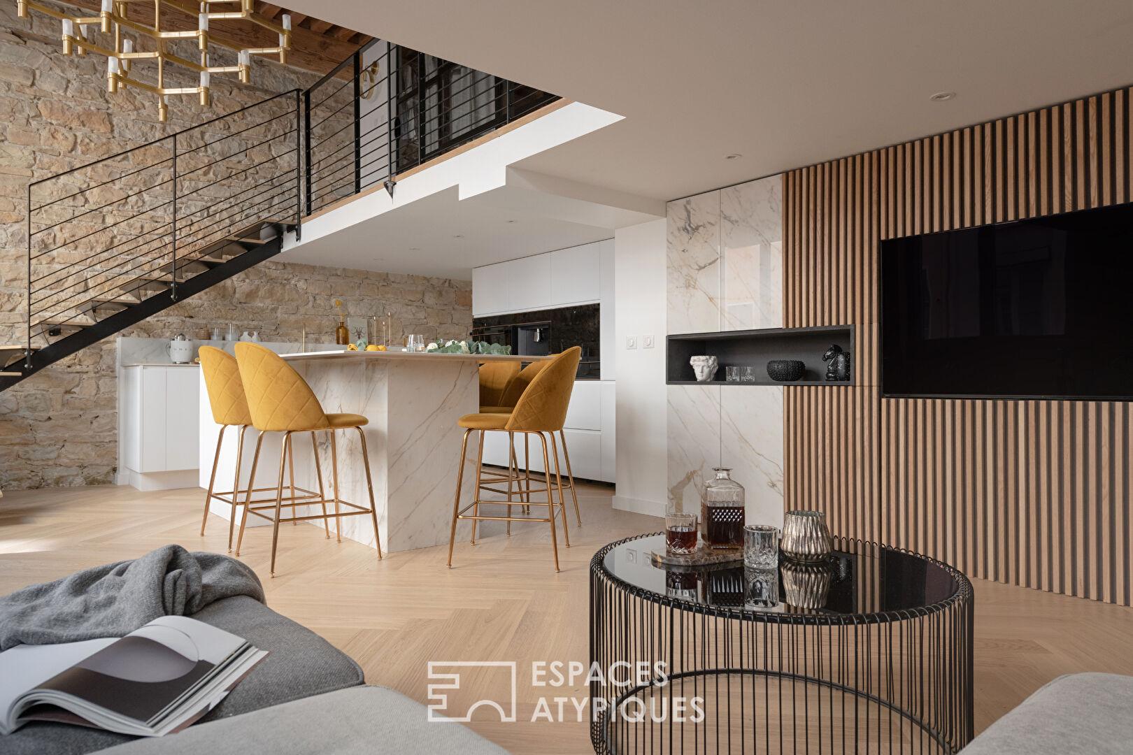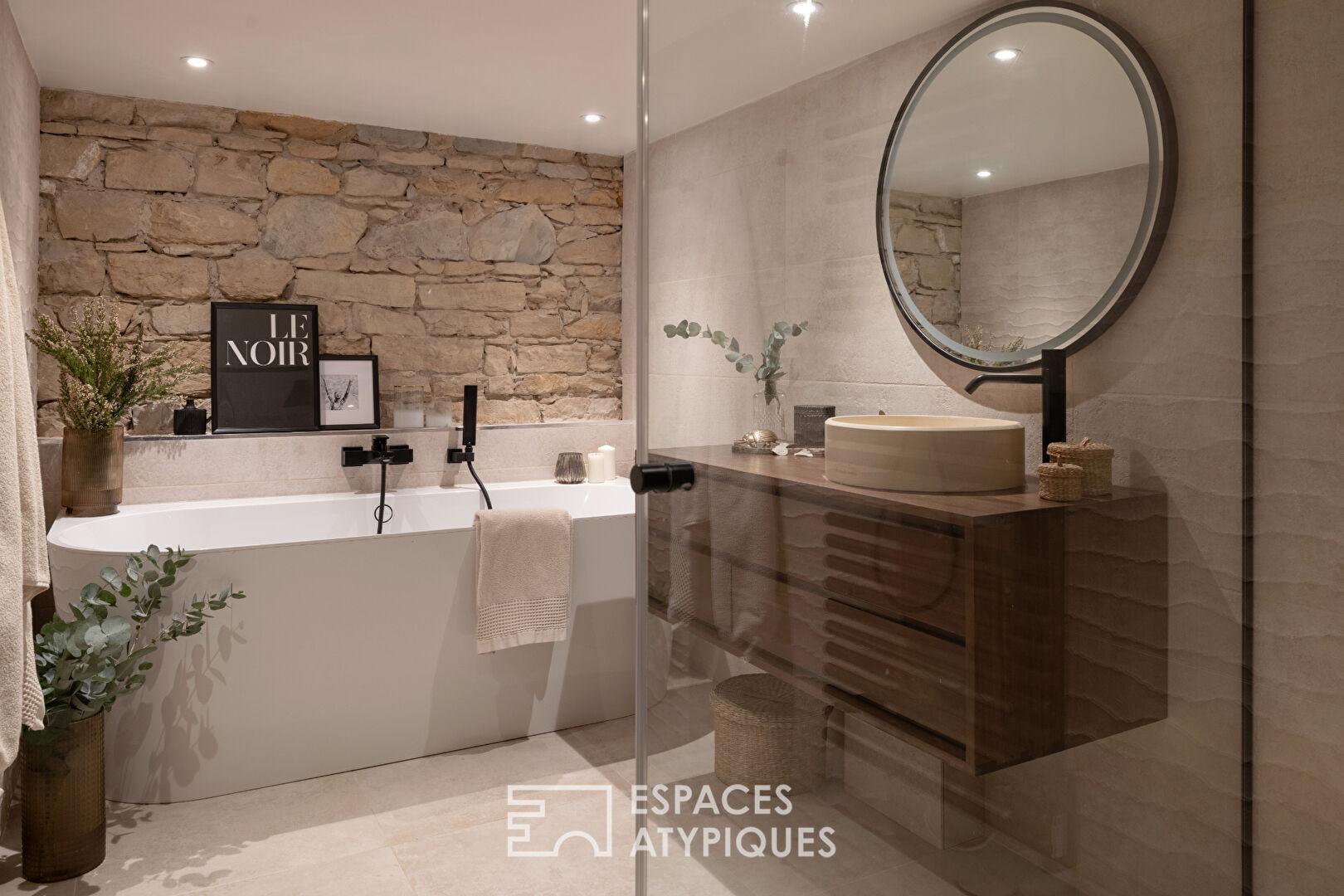 L’entrée s’ouvre sur un vaste séjour baigné de lumière, sublimé par une belle hauteur sous plafond, des poutres apparentes et des murs en pierre qui rappellent l’authenticité du lieu. La cuisine ouverte, entièrement équipée avec des matériaux haut de gamme, s’intègre harmonieusement à l’espace de vie. De nombreux rangements sur mesure viennent parfaire l’ensemble. La salle de bain propose des prestations complètes avec baignoire et douche à l’italienne. En mezzanine, un dégagement distribue trois chambres, offrant un espace nuit fonctionnel et bien pensé.