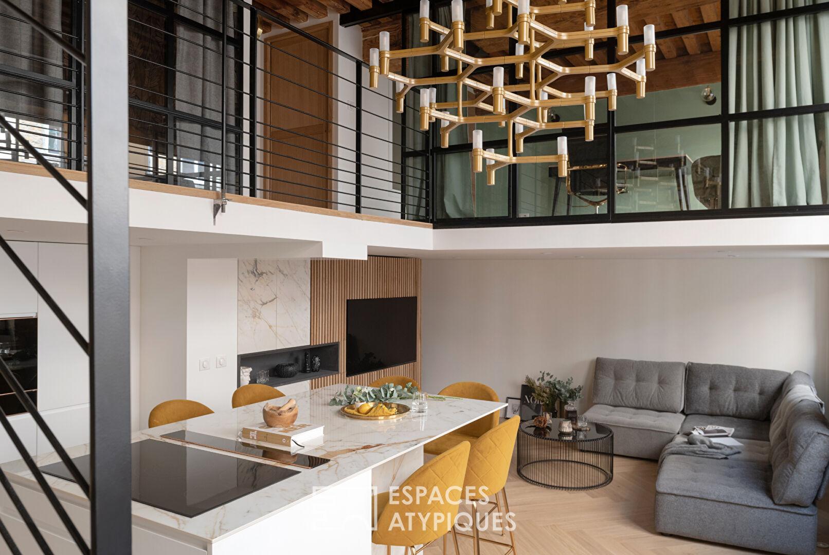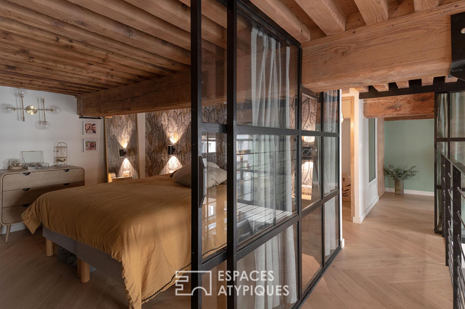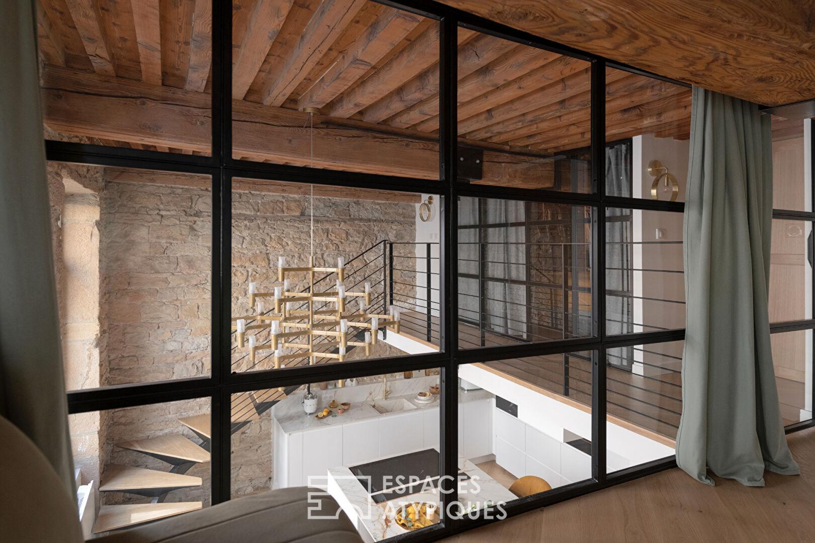 L’entrée s’ouvre sur un vaste séjour baigné de lumière, sublimé par une belle hauteur sous plafond, des poutres apparentes et des murs en pierre qui rappellent l’authenticité du lieu. La cuisine ouverte, entièrement équipée avec des matériaux haut de gamme, s’intègre harmonieusement à l’espace de vie. De nombreux rangements sur mesure viennent parfaire l’ensemble. La salle de bain propose des prestations complètes avec baignoire et douche à l’italienne. En mezzanine, un dégagement distribue trois chambres, offrant un espace nuit fonctionnel et bien pensé.